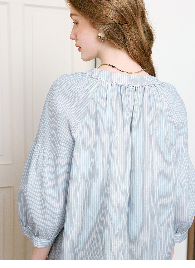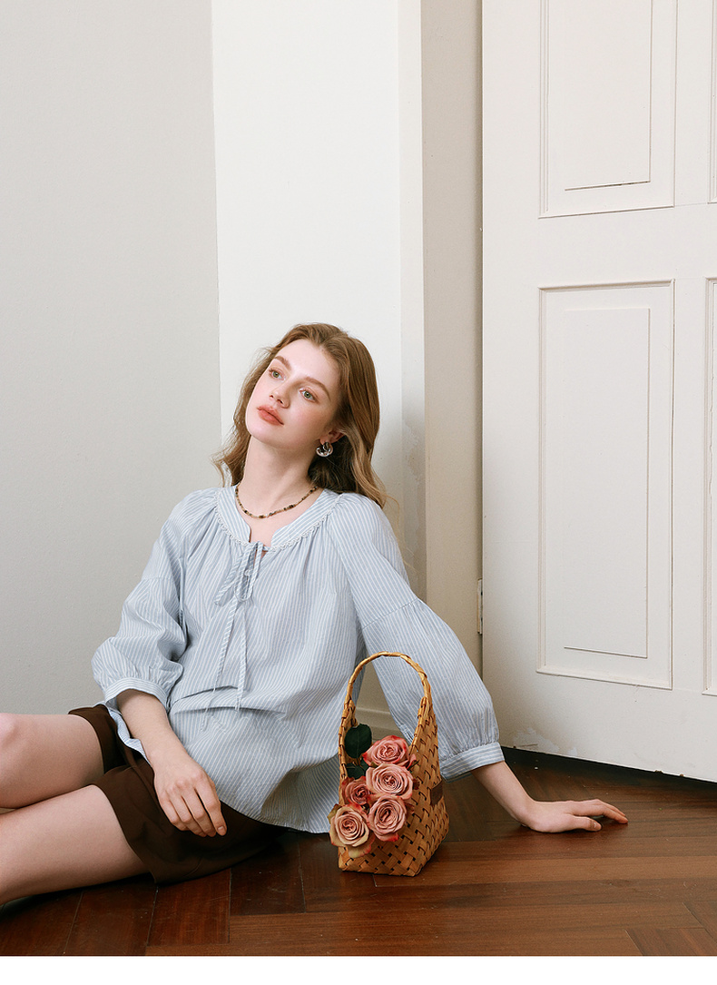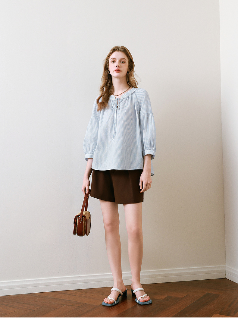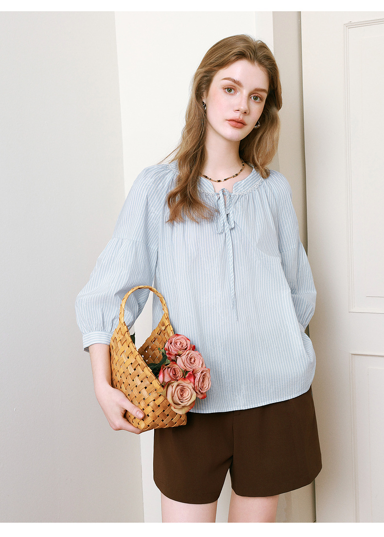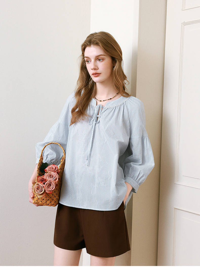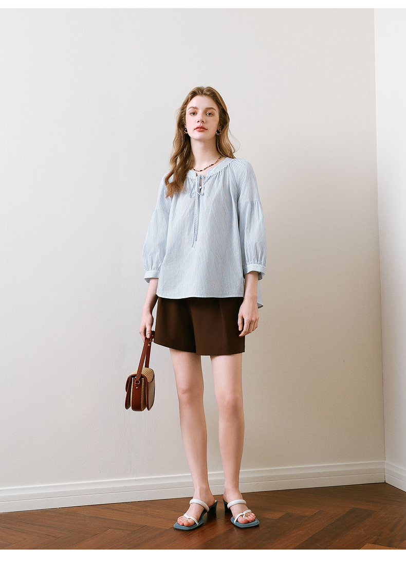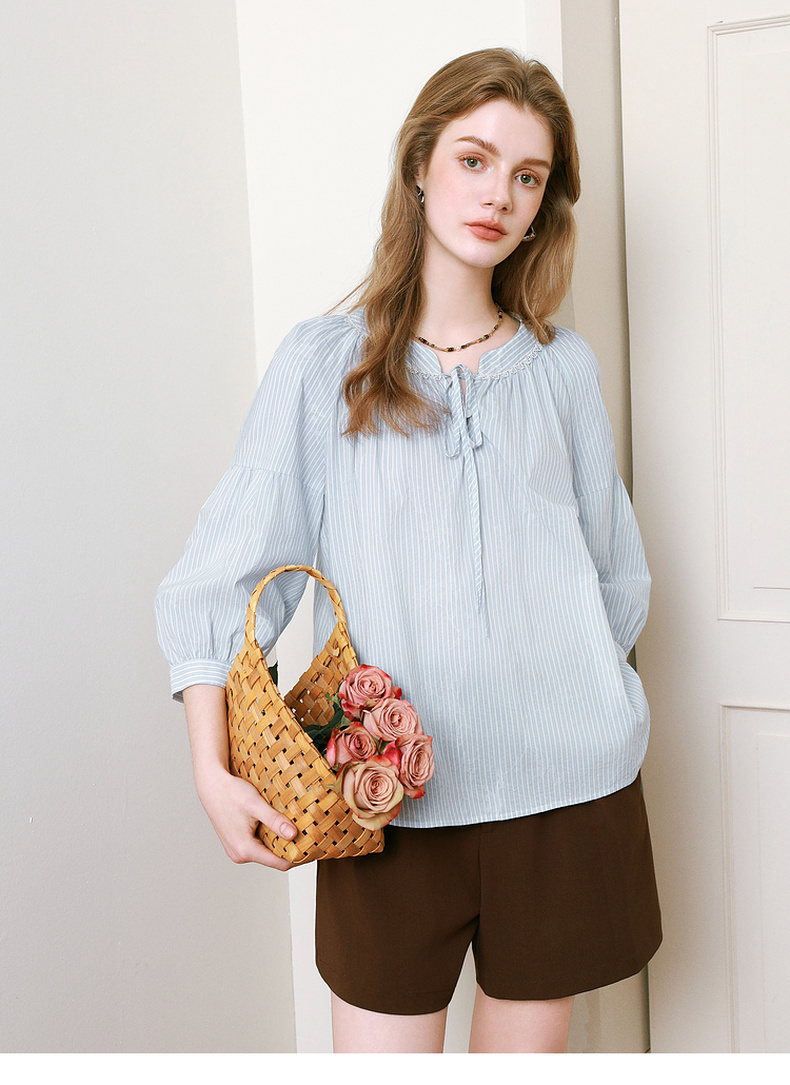 【商场同款】诗凡黎条纹系带衬衫2025夏新款花边领上衣3G4320131