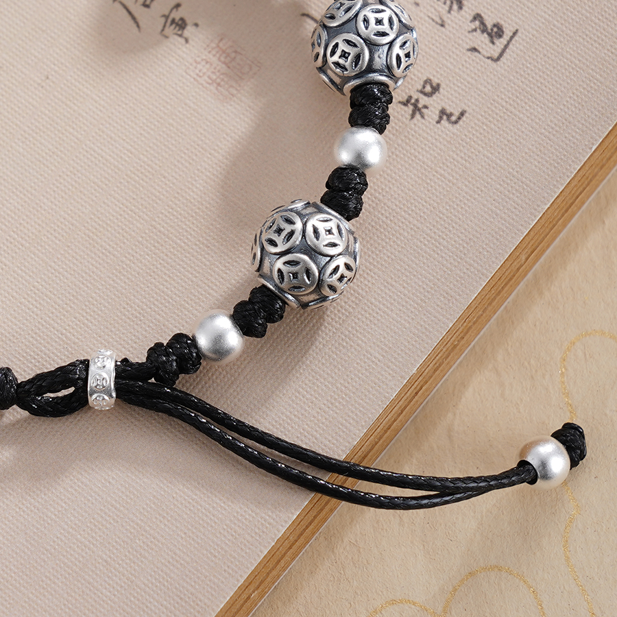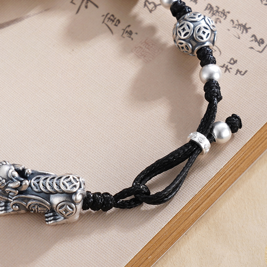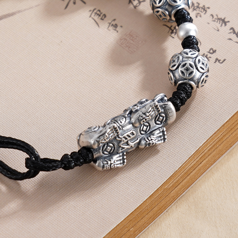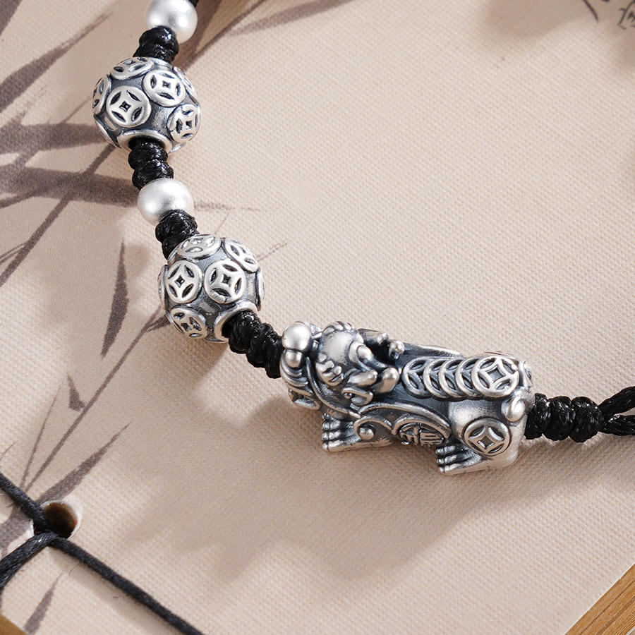 【寓意】:仿古貔貅手串,造型精致立体。圆珠手串之上錾刻铜钱,寓意吉祥守护,招财纳福。