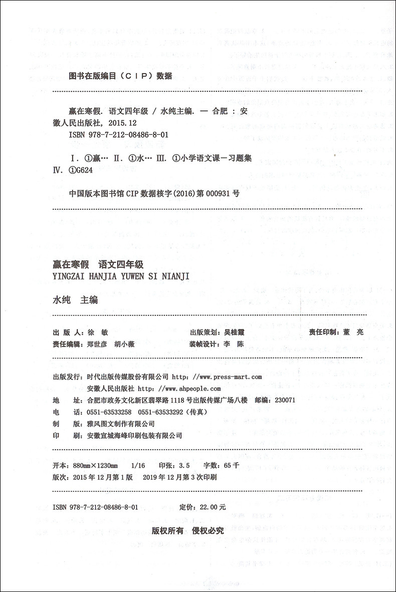 2020新版上海小学寒假作业 语文 4年级/四年级 赢在寒假 小学生寒假作业本练习册 基础巩固拓展提升新课预习 安徽人民出版社