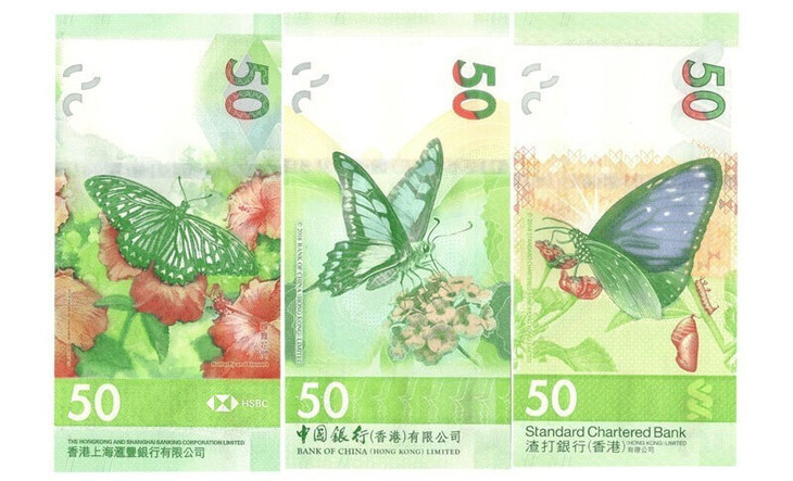 渣打银行50 元钞票上,停靠在马缨丹的蓝点紫斑蝶是少数能在寒冷的冬天里存活下来的香港本地蝴蝶。它们在严寒天气会靠拢在一起,抵御外在的挑战。钞票上的幼虫、蝶蛹与蝴蝶成虫共存,展示一个蜕变新生的过程,也代表了香港人团结的一面。