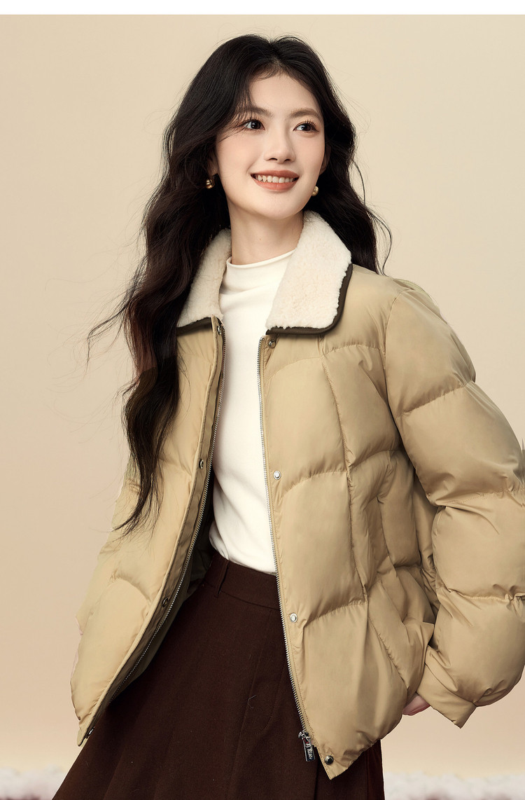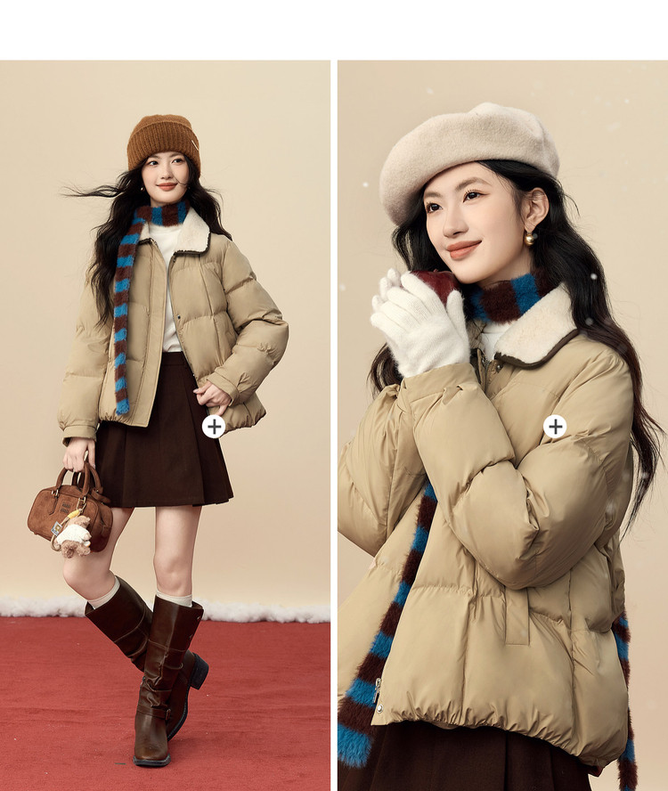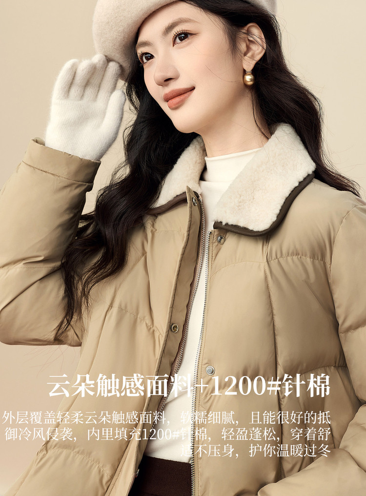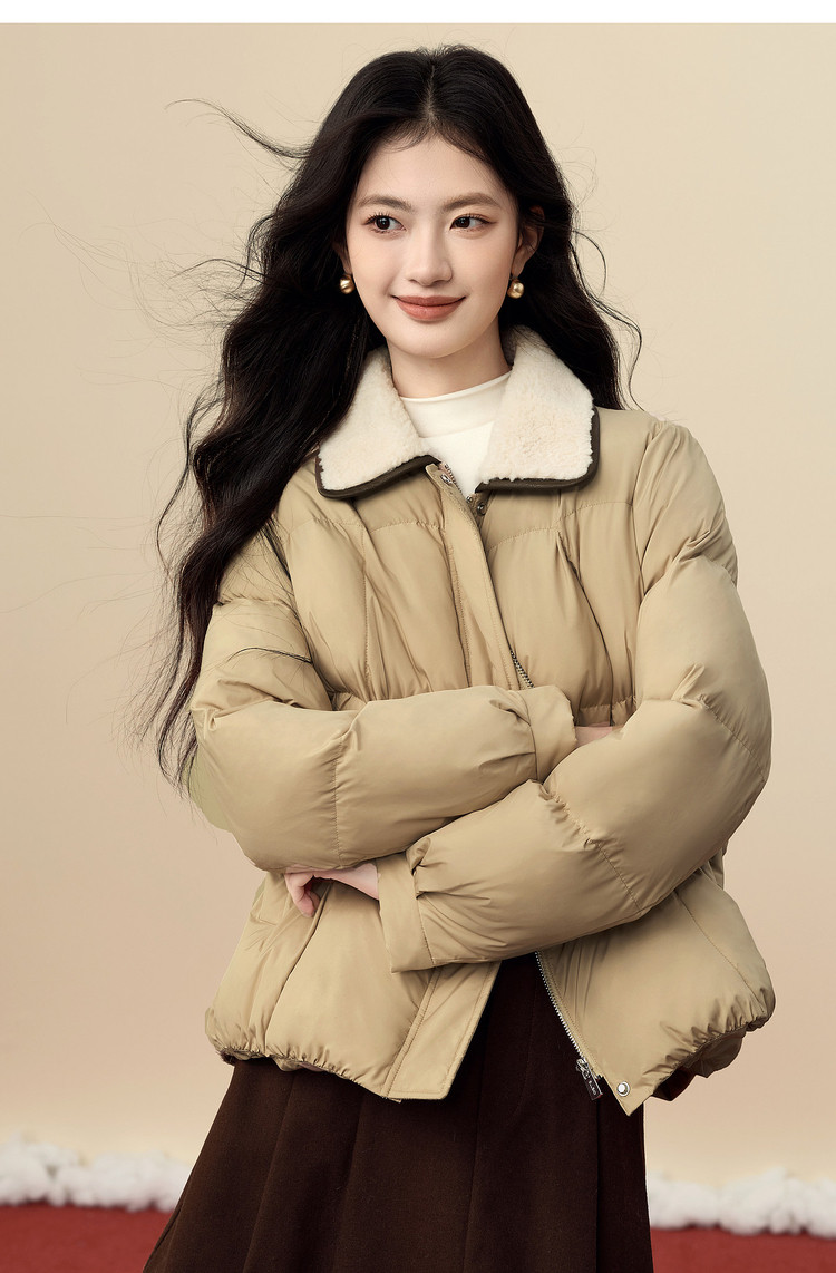 【12/24新品6.3折】熙世界巴恩风卡其色棉衣外套女冬季时尚毛绒翻领保暖短款面包棉服