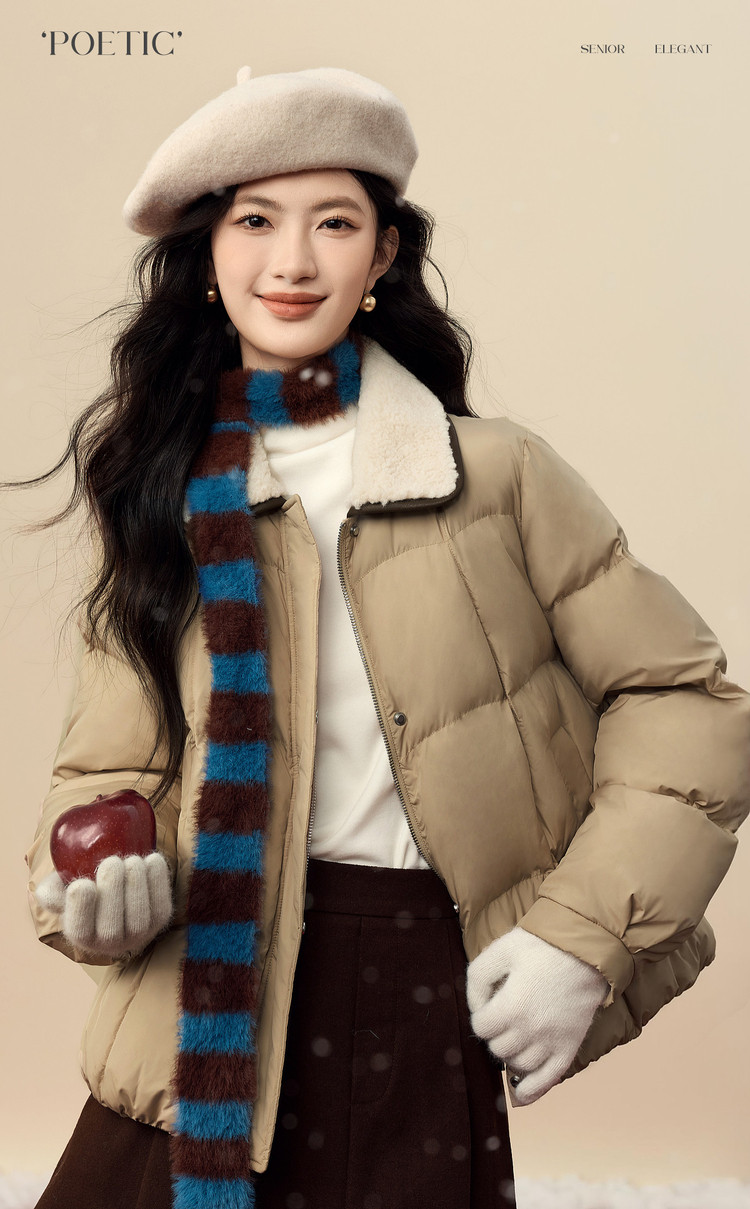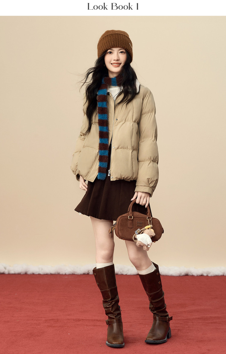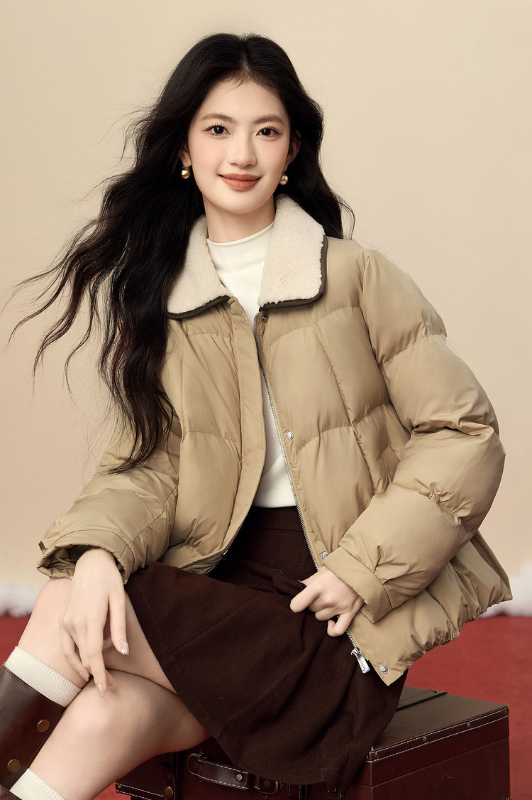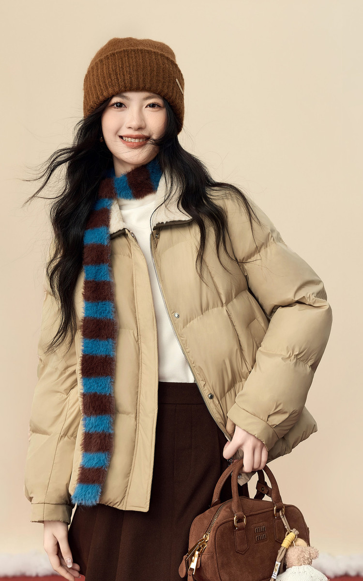 【12/24新品6.3折】熙世界巴恩风卡其色棉衣外套女冬季时尚毛绒翻领保暖短款面包棉服