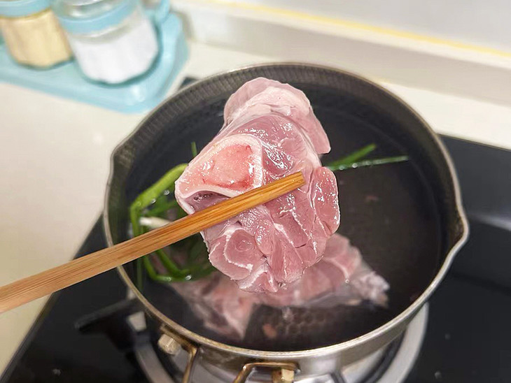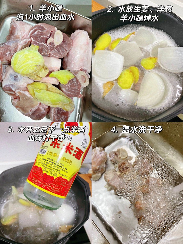 羊小腿块泡1小时除去血水,放入生姜、葱段焯水,水开后用少量米酒帮助撇去浮沫。温水洗净后,加入炖料,炖1小时放入白萝卜。