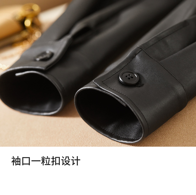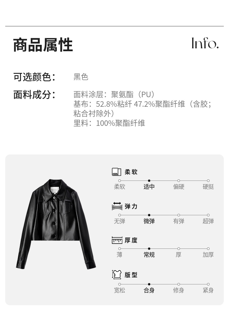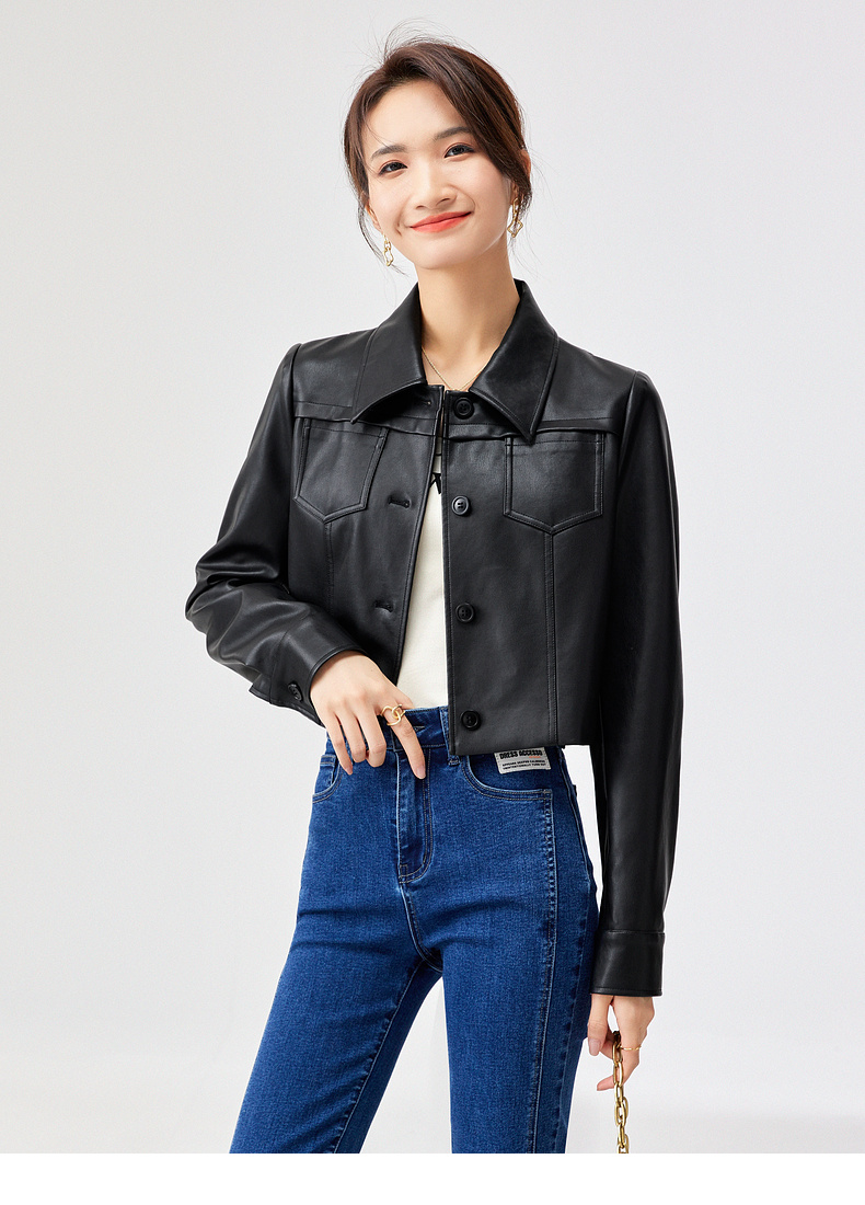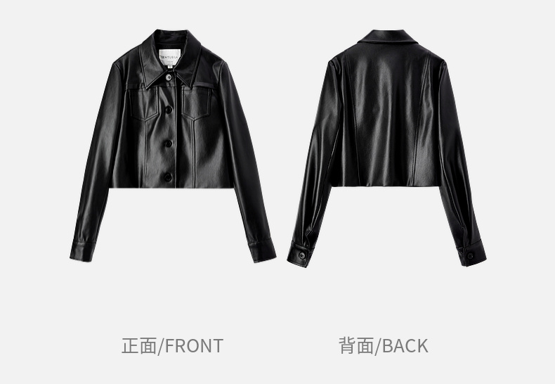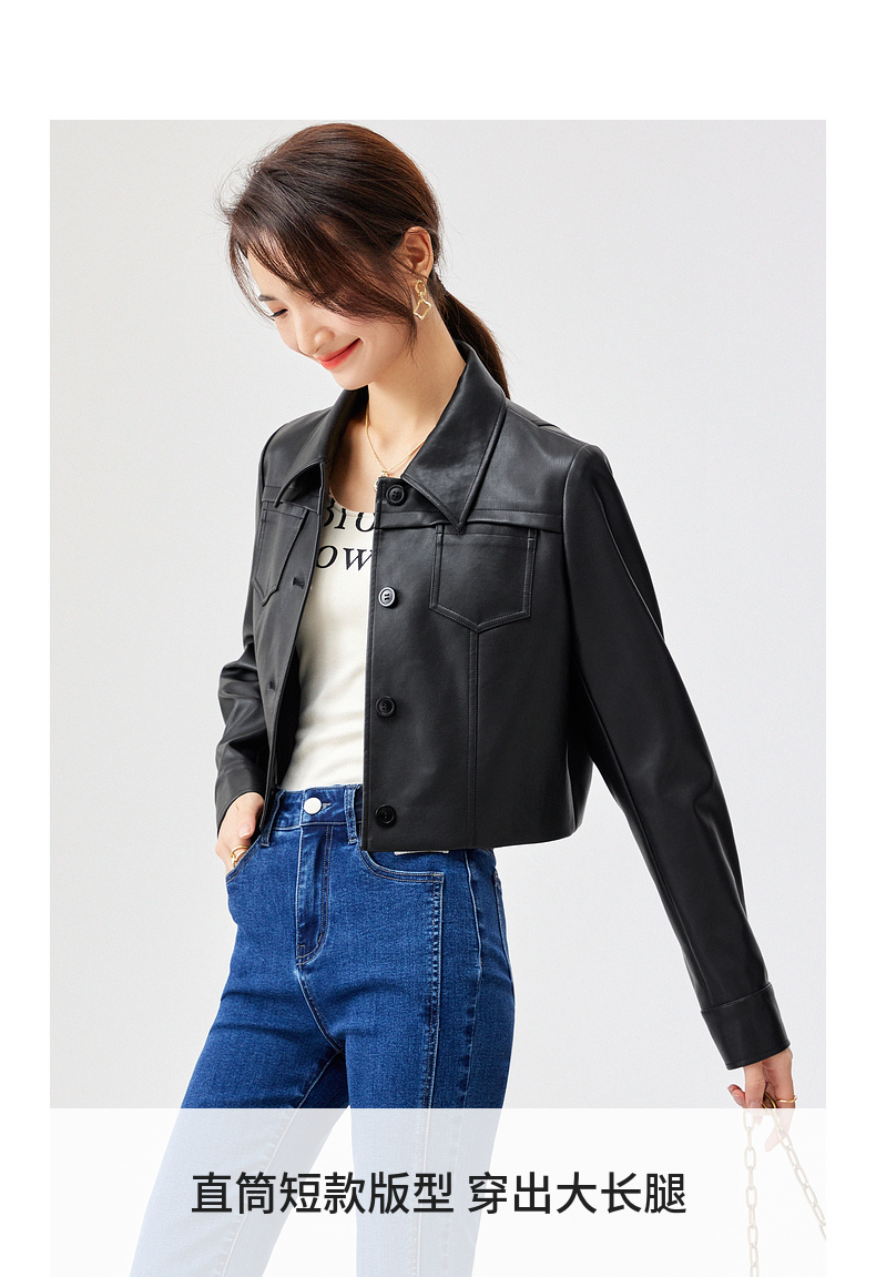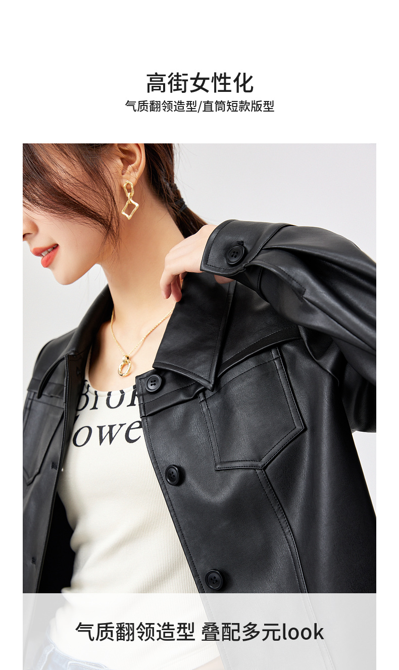 【内购】舒适休闲翻领对称真口袋单排扣宽松短款PU皮衣外套-153GD3913X