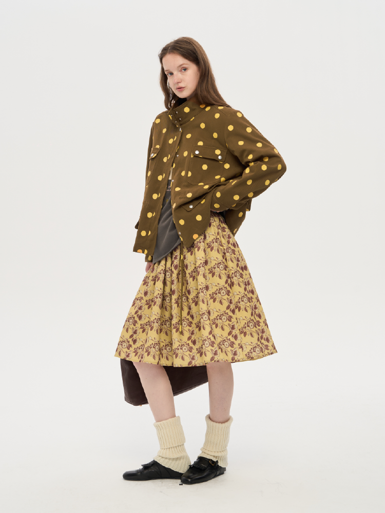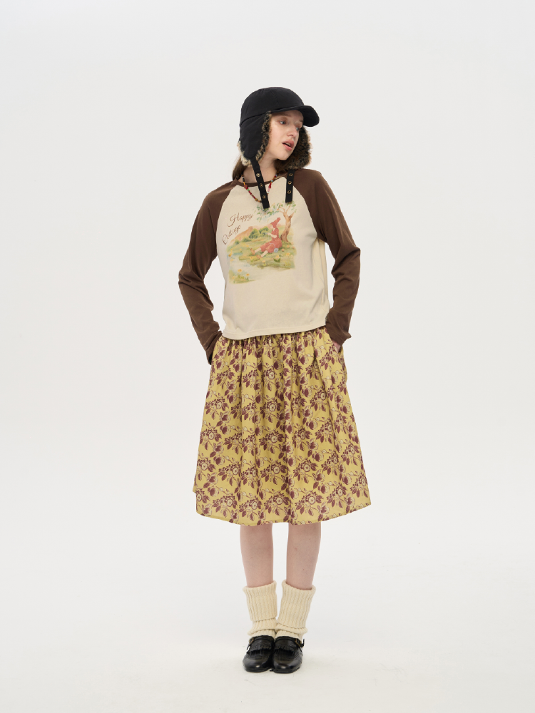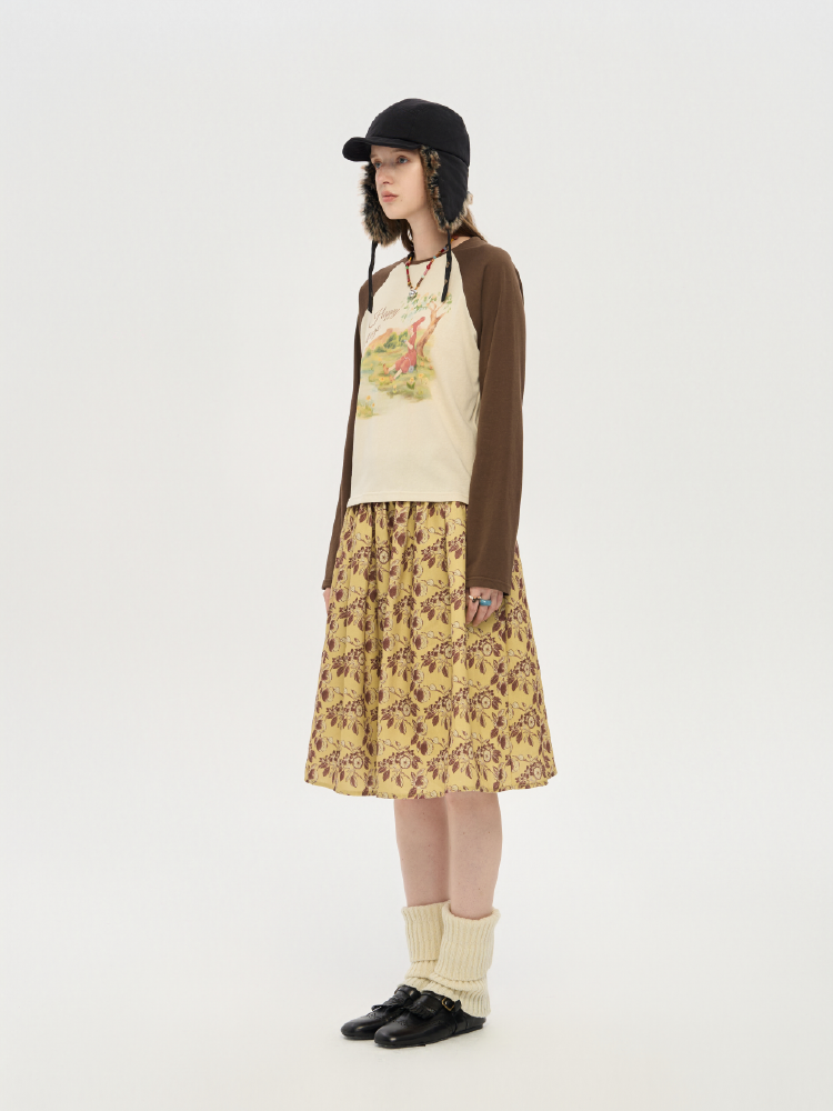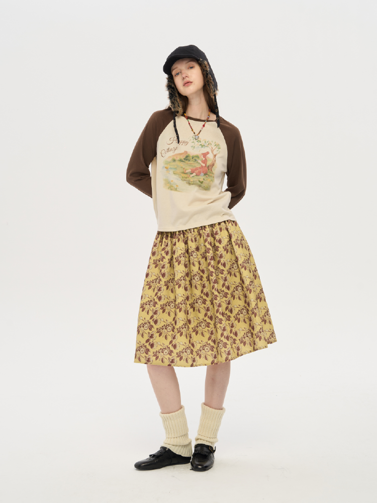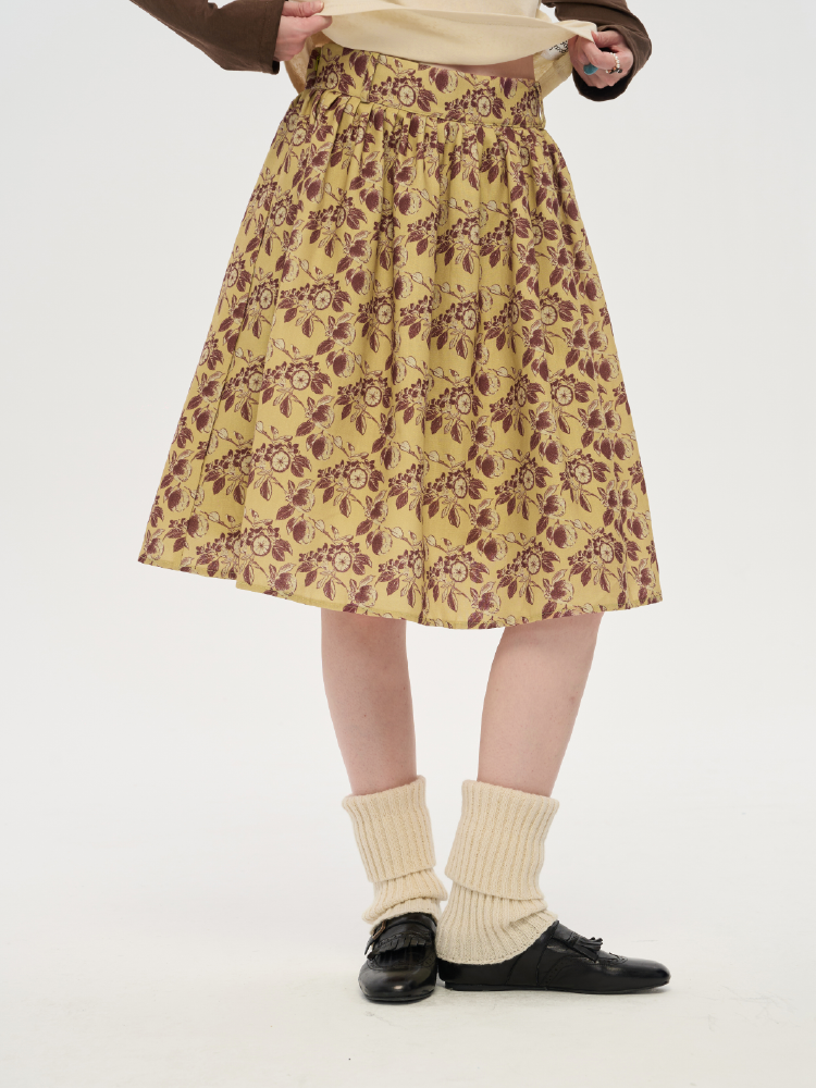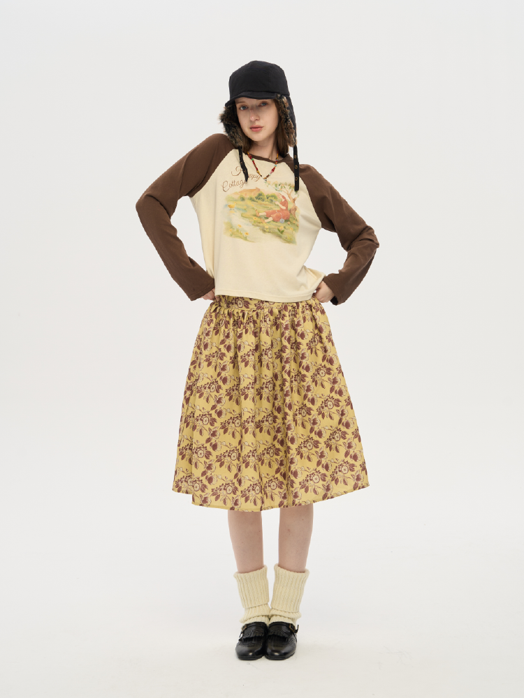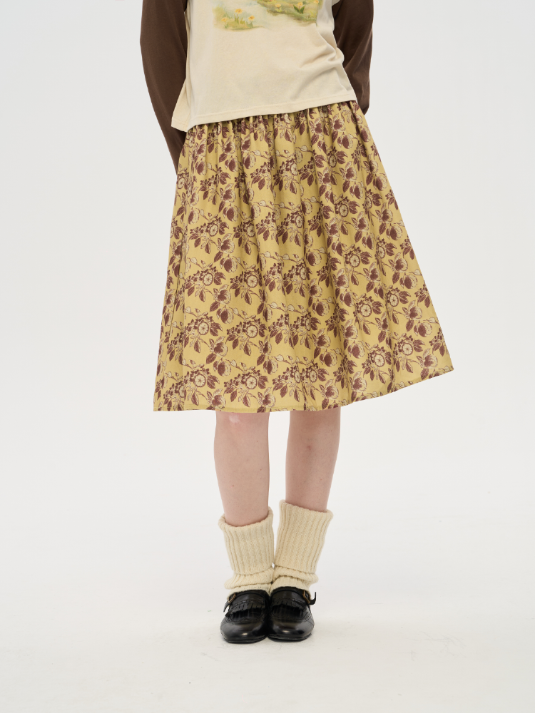 local tag/lt25awk12/秋天果实 手绘印花半裙 姜黄色复古蓬蓬裙