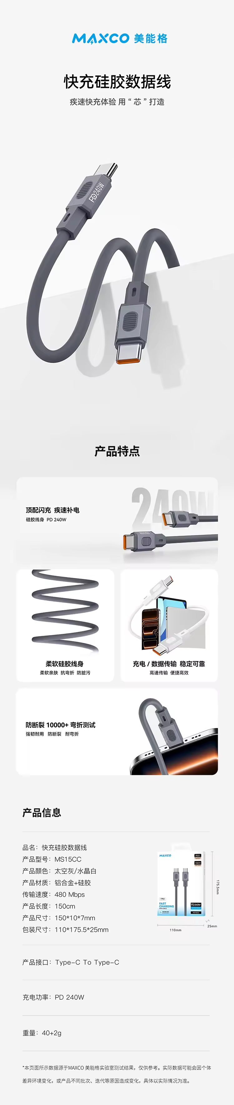 MAXCO美能格 MS15CC PD 240W 快充硅胶数据线