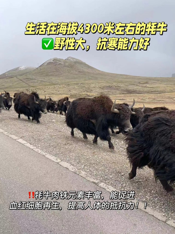 生活在海拔4300左右的牦牛,野性大,抗寒能力好,牦牛肉铁元素丰富,能促进血红细胞再生,提高人体的抵抗力!!