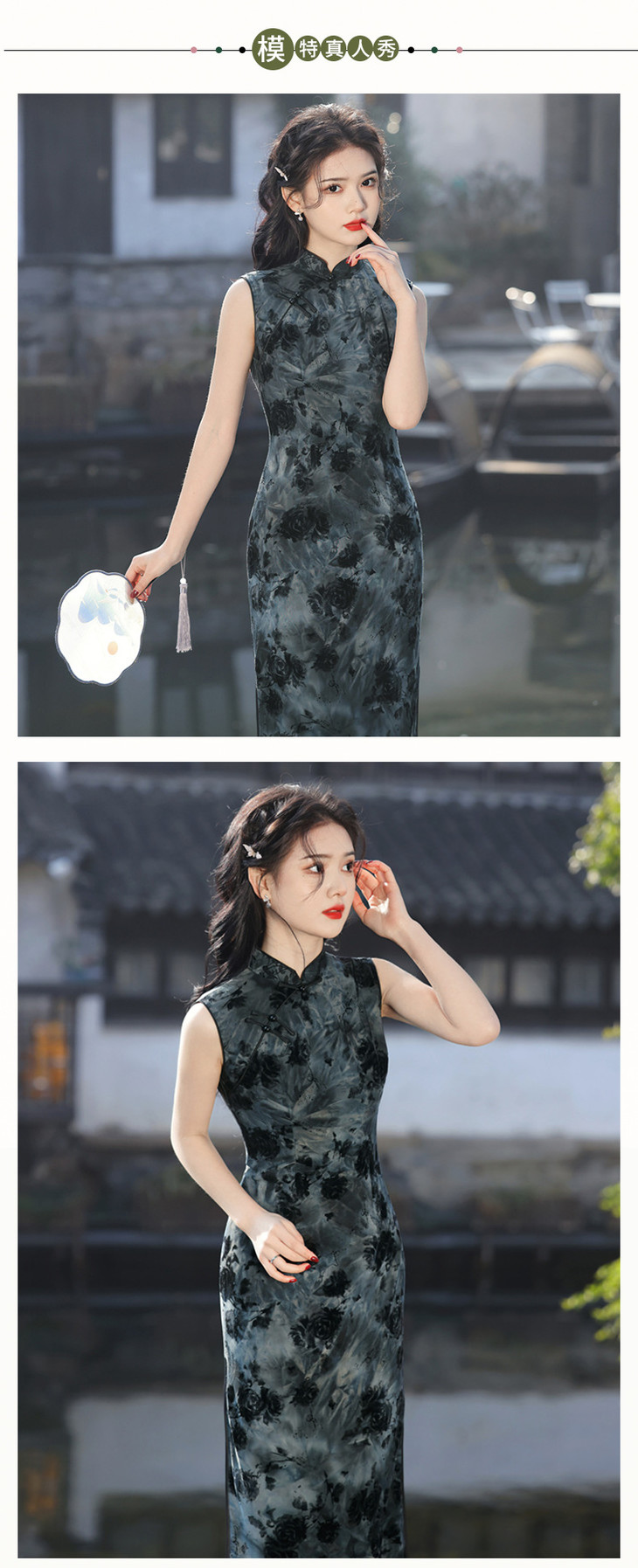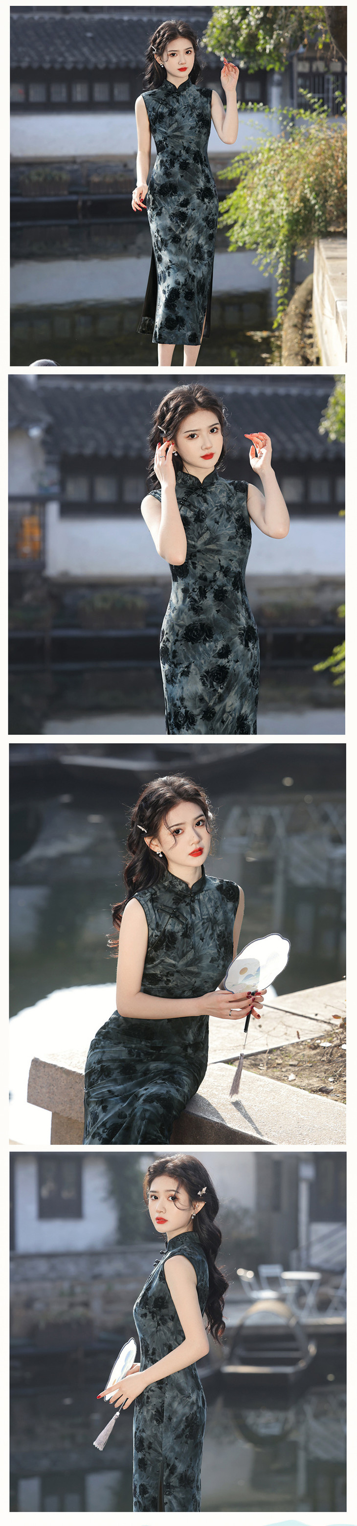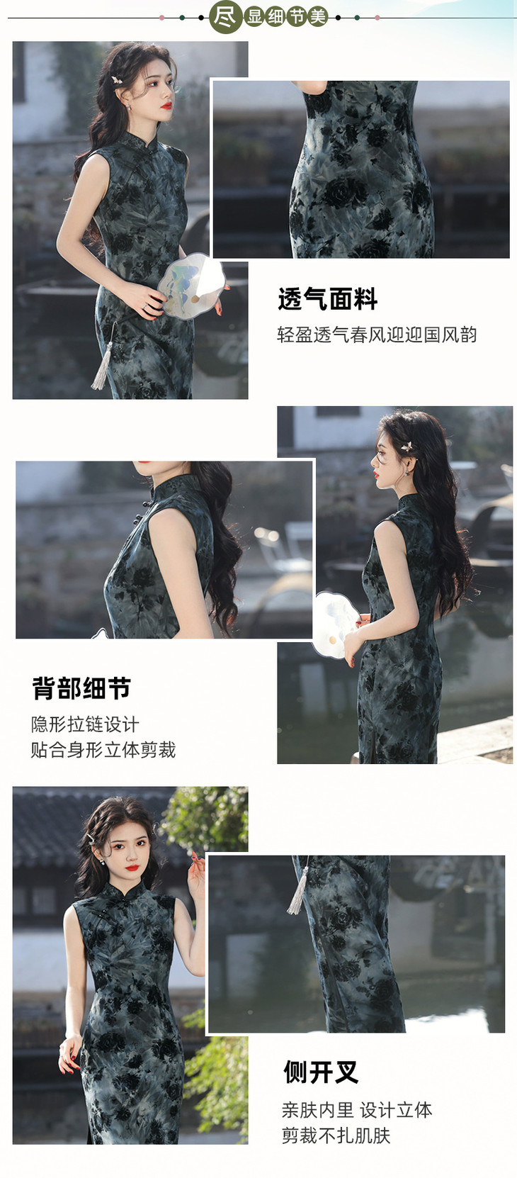 无袖双层扎染弹力中长旗袍,水墨画中国风修身旗袍SJT638