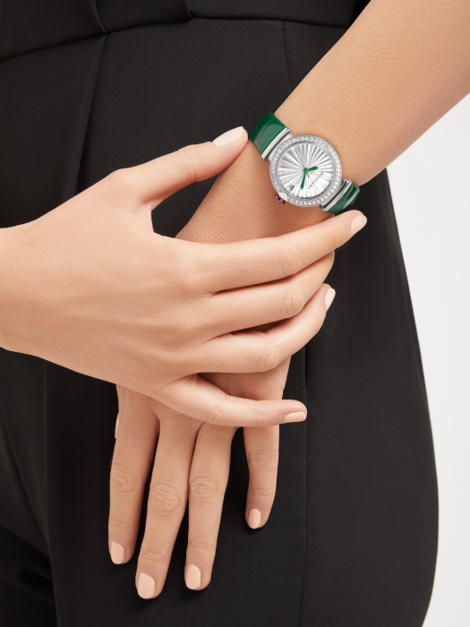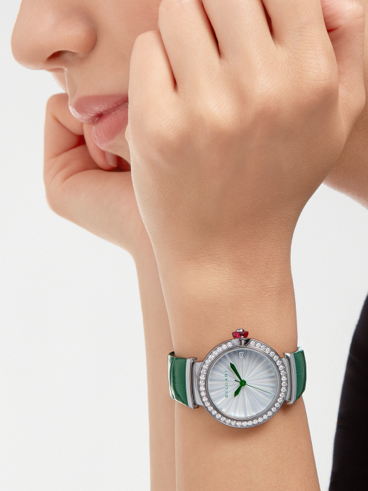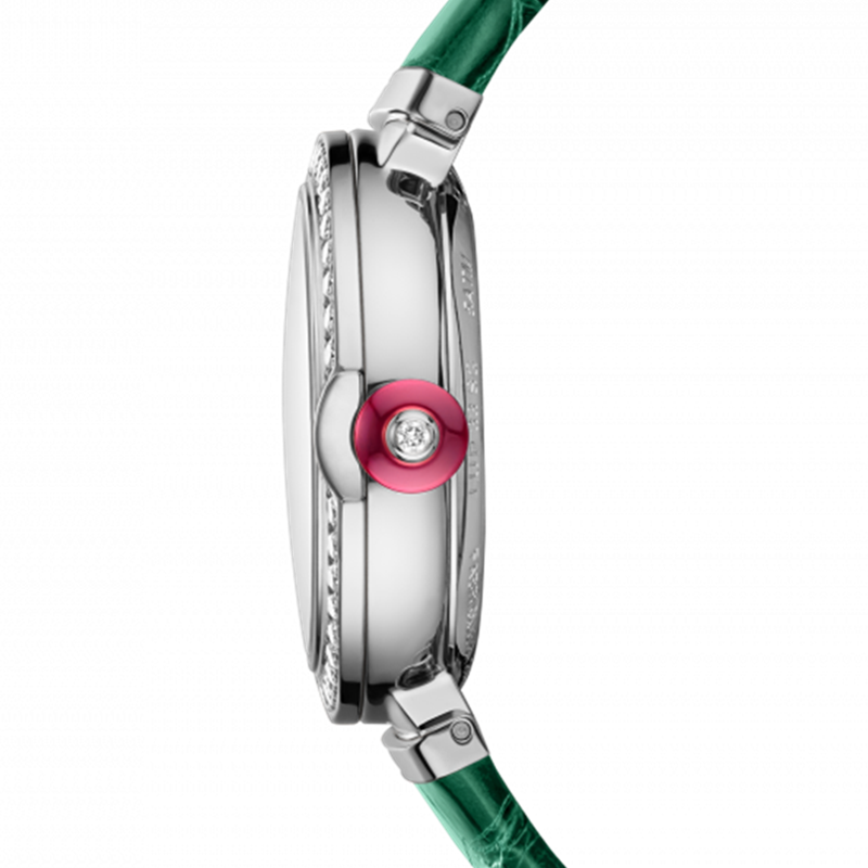镜面 材质 | 蓝宝石水晶玻璃 | 表盘 | 精钢表壳,镶钻表圈 白色珍珠母贝浮雕设计表盘,表镜饰有绿色BVLGARI宝格丽品牌标识,绿色指针 精钢表冠镶嵌凸形蛋面切割科技红碧玺和钻石 透底 |