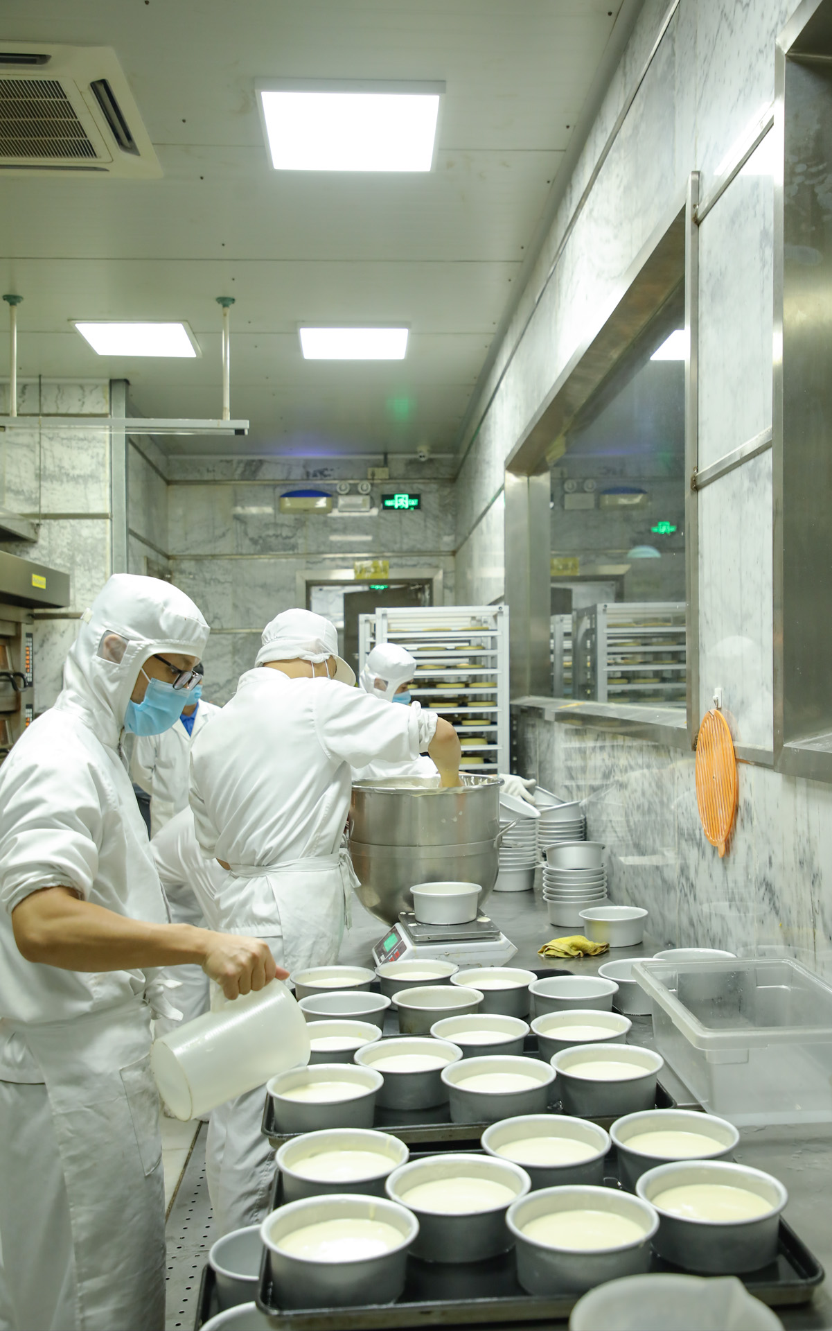 生产好的葡挞会放进-40℃的低温冷藏室,在半小时内快速将食品中心温度降到-18℃,在细胞组织受到伤害之前冻结,最大限度保证了食材的细胞活性,锁住产品的新鲜风味。