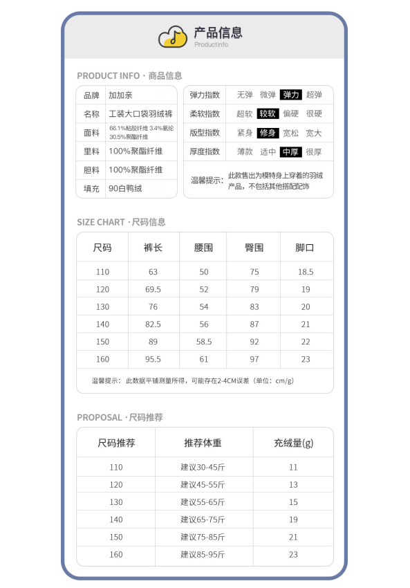 281645福利款 儿童弹力羽绒工装裤,男女同款!身高120厘米选140尺码,130厘米选150尺码,以此类推!