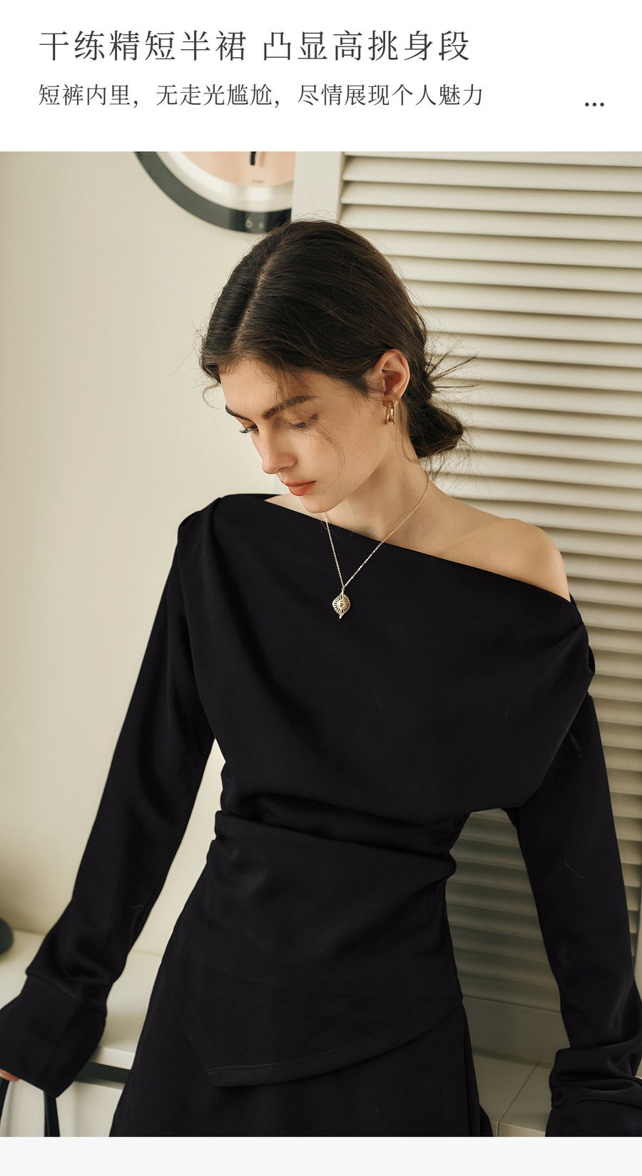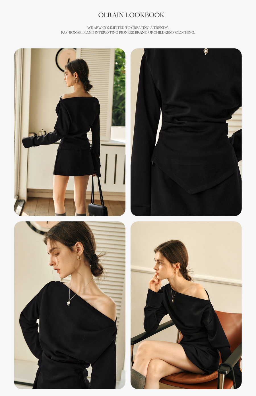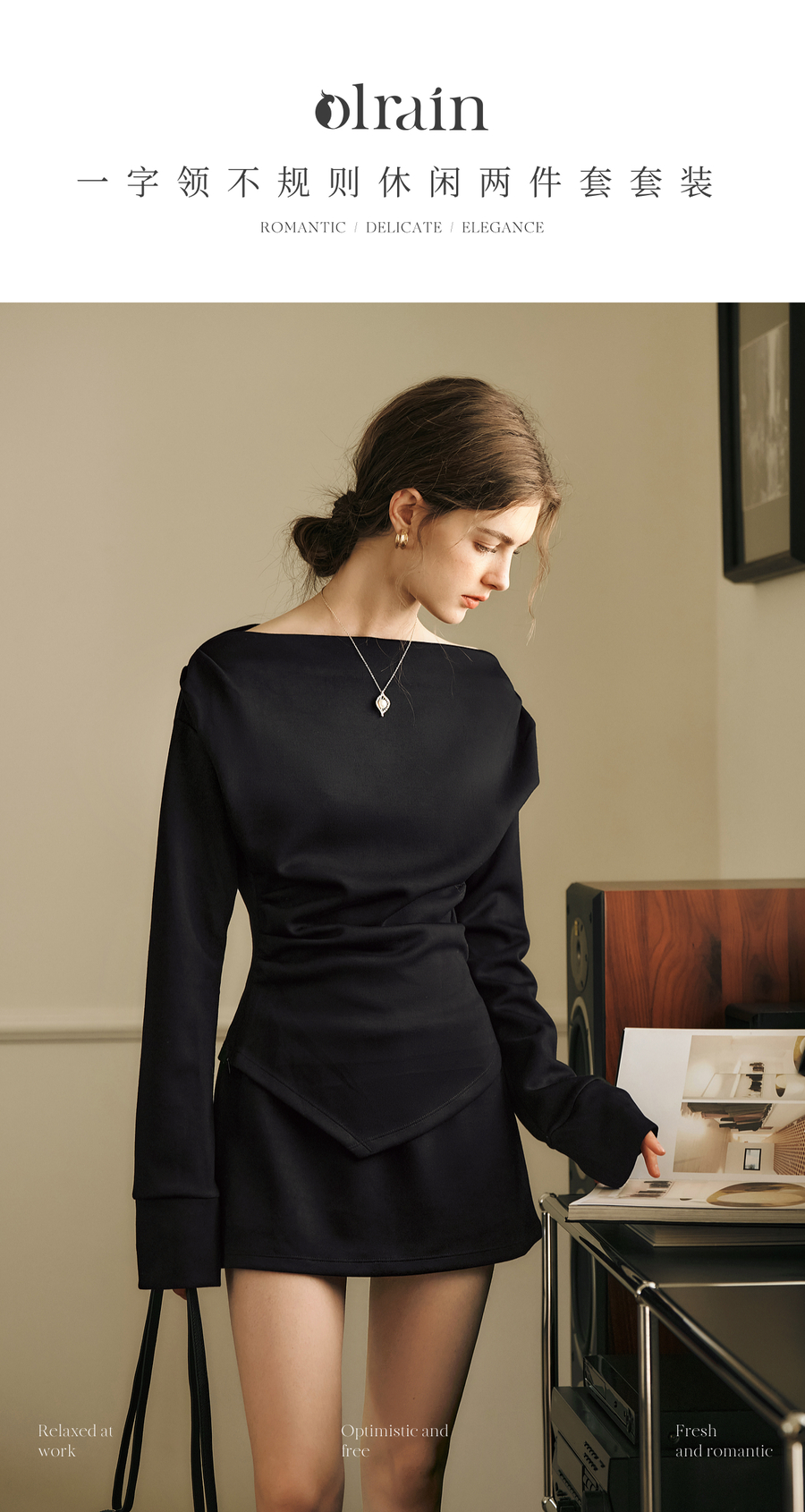 OLrain欧芮儿黑色时尚套装女冬季2024年新款一字领不规则两件套