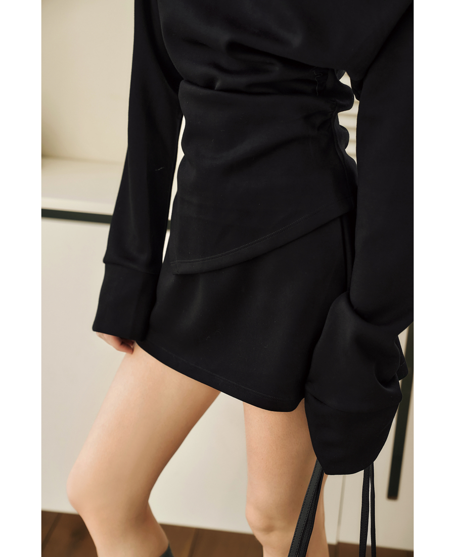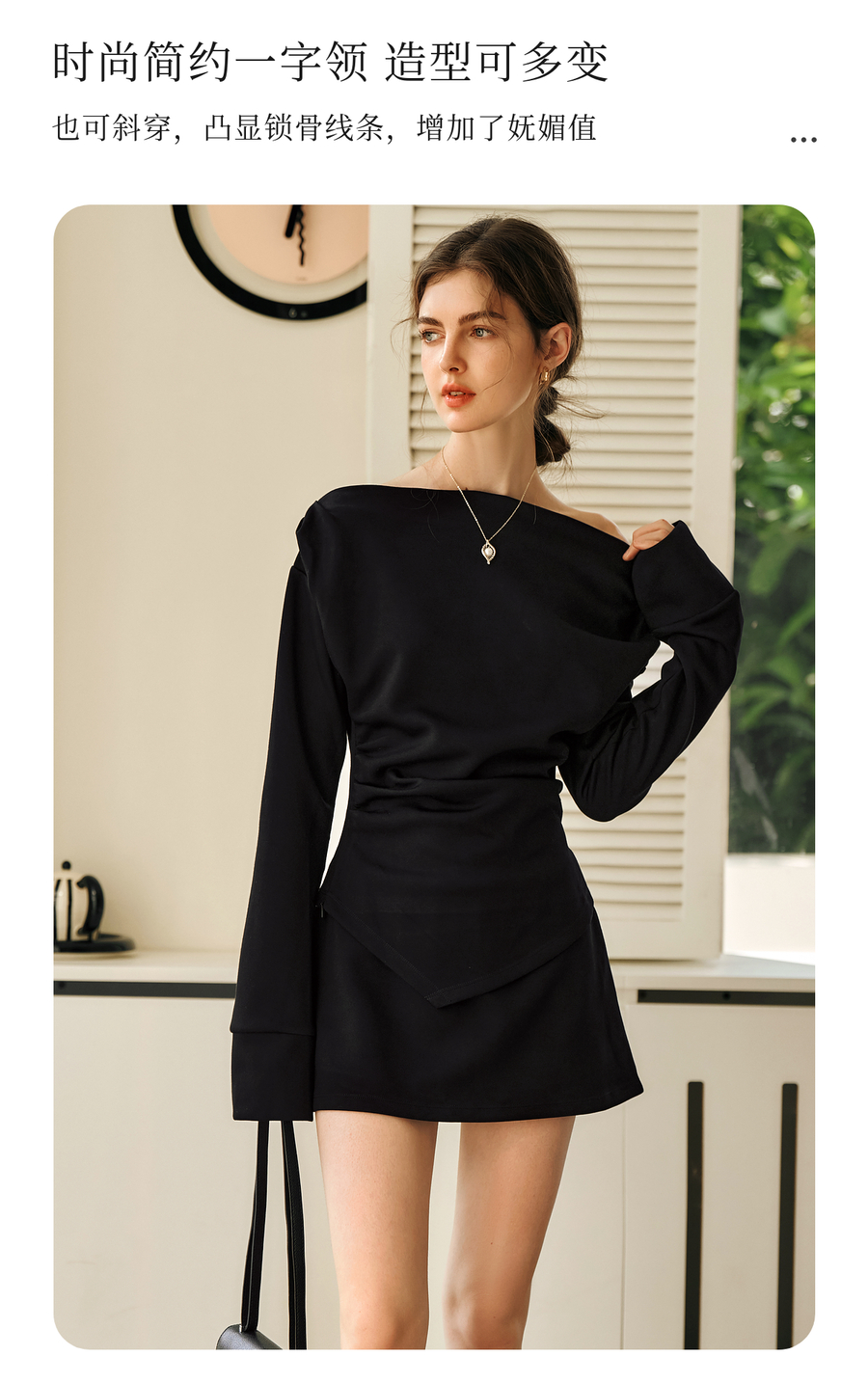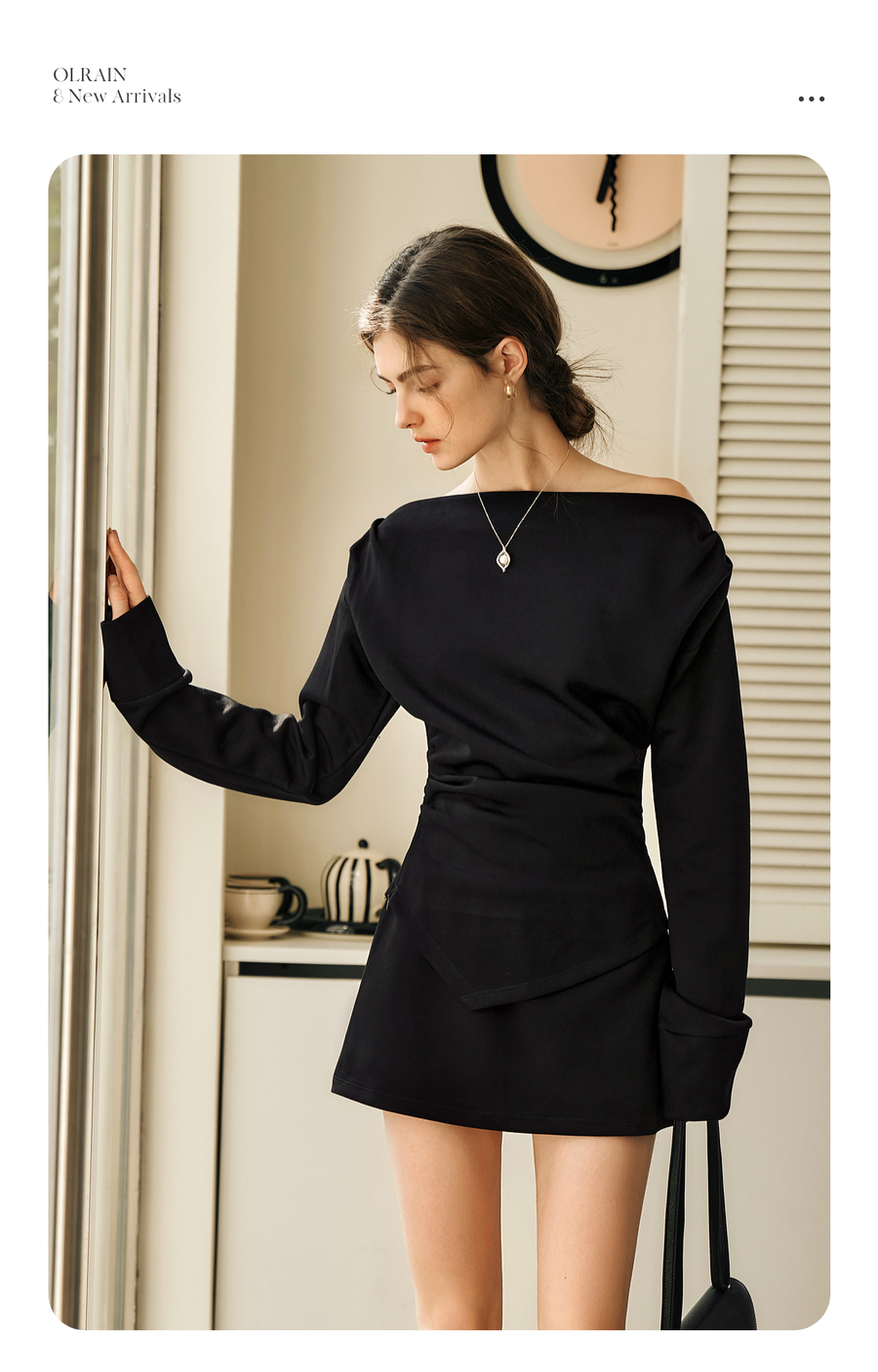 OLrain欧芮儿黑色时尚套装女冬季2024年新款一字领不规则两件套