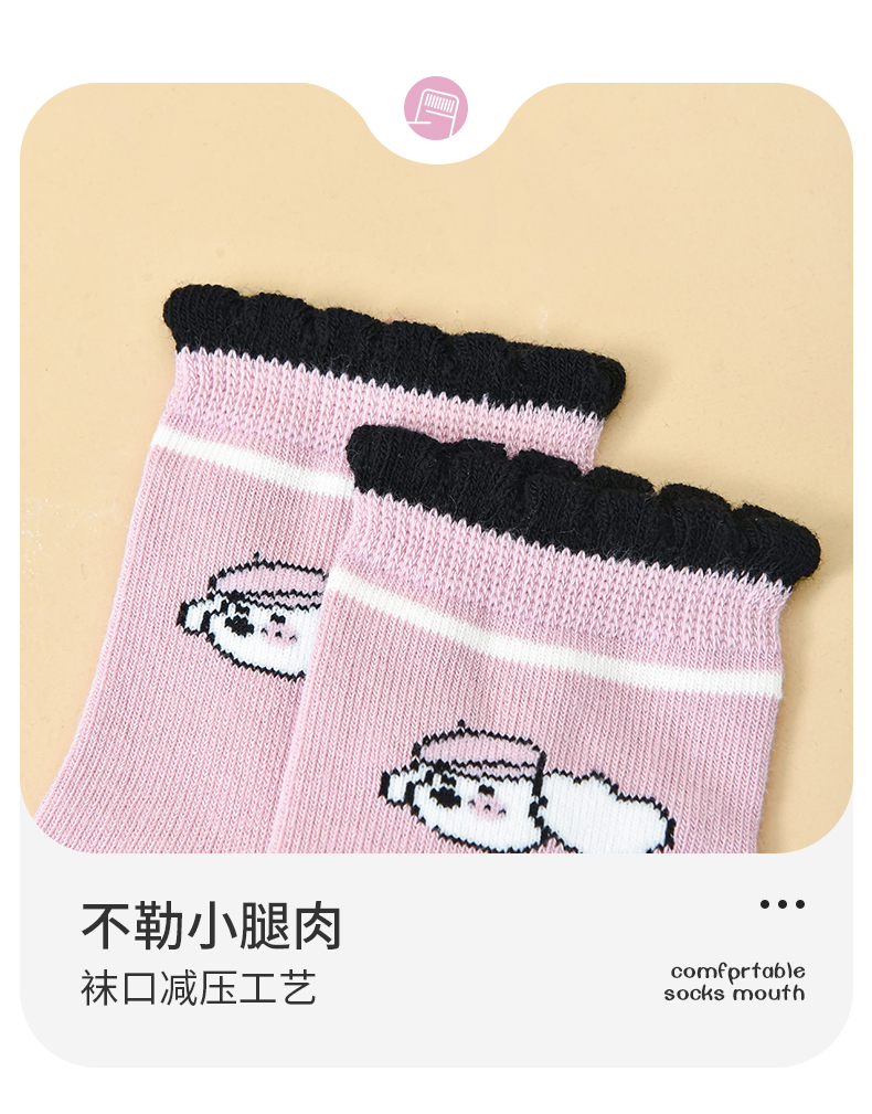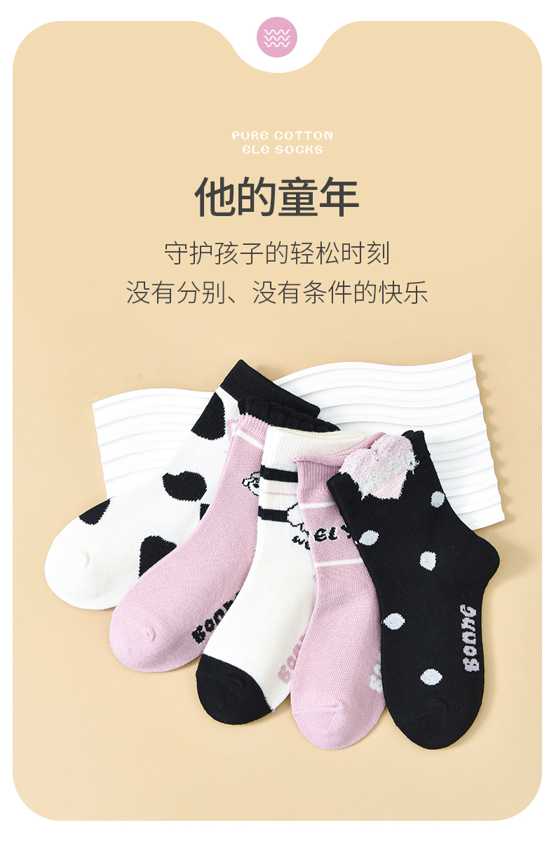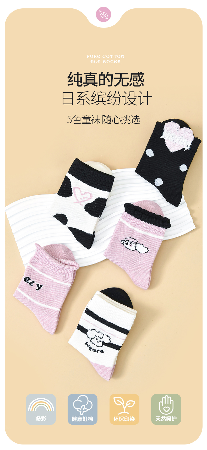 【五双装】洁丽雅儿童棉质中筒袜韩系萌趣印花舒适亲肤柔软透气长绒棉袜