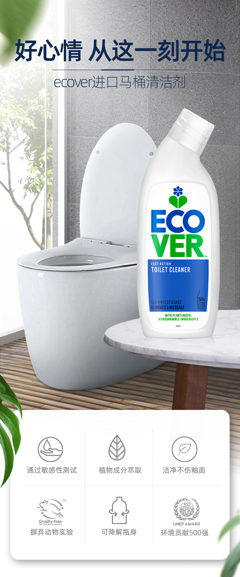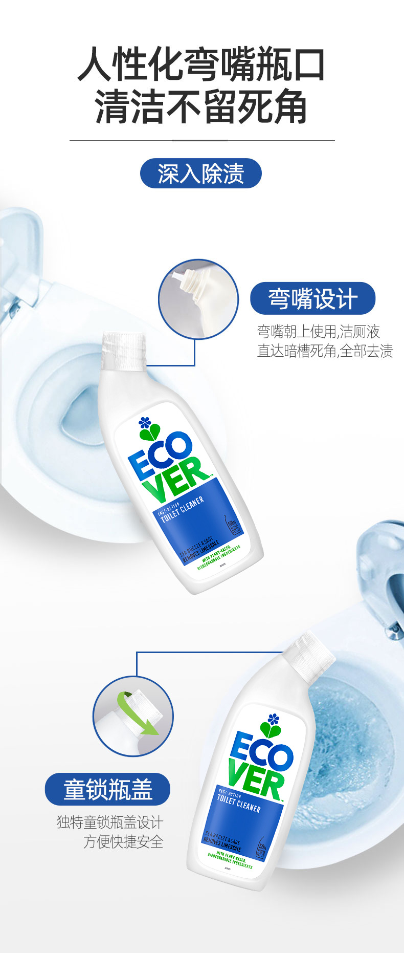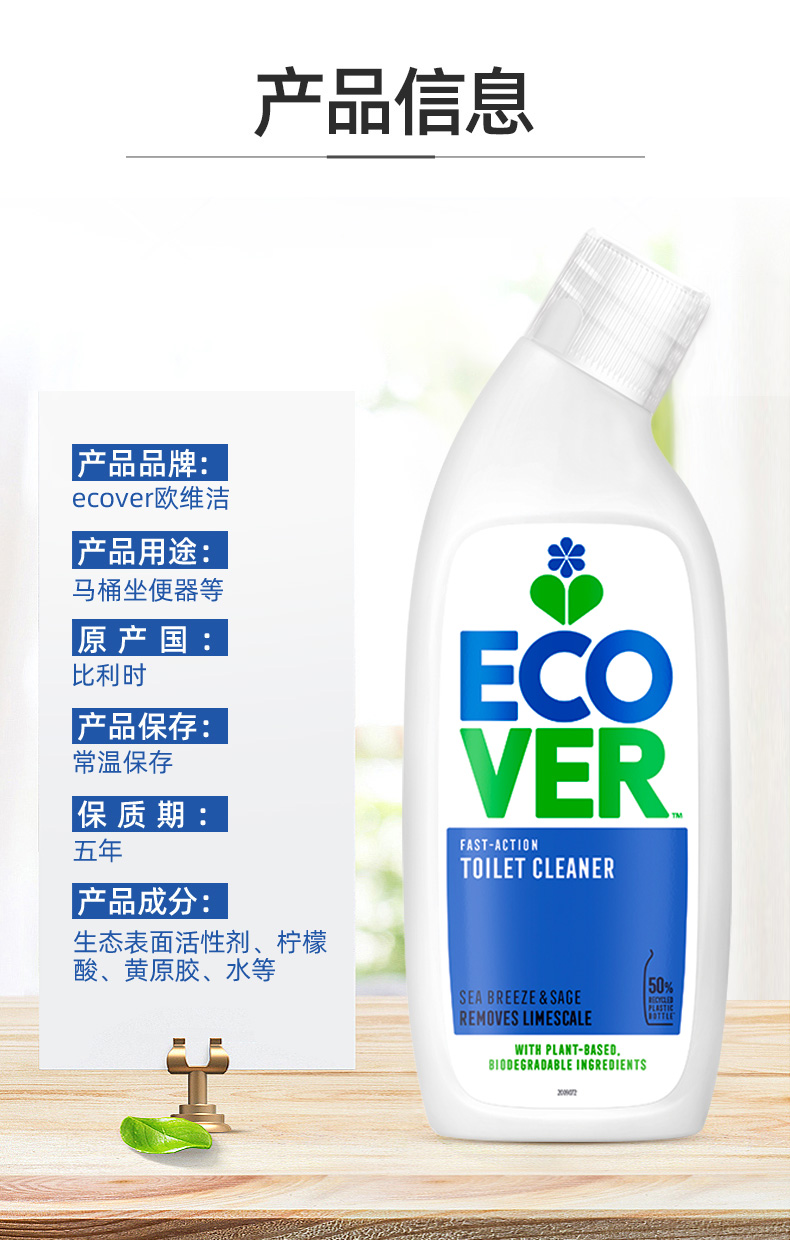 来自比利时环保型洗涤系列Ecover——【海洋香型洁厕剂】植物无氯马桶清洁剂,植物成分,不含石化成分,除便渍/除臭/除水垢三合一,洁厕同时保护釉质表面不被伤害,海洋清香去除卫生间异味
