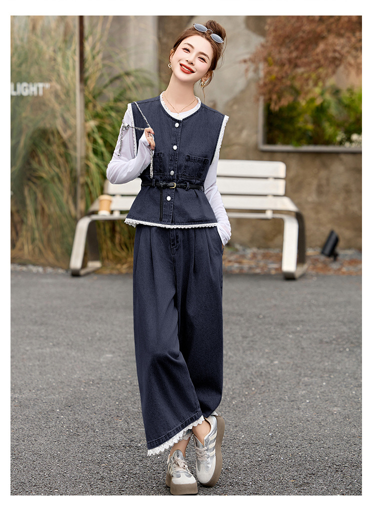 2025超火牛仔套装春秋休闲时尚洋气马甲打底衫阔腿裤显瘦三件套HR-MYL2510