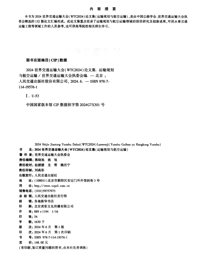书名:2024世界交通运输大会(WTC2024)论文集(运输规划与航空运输)