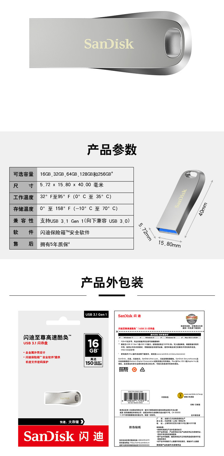 闪迪至尊高速酷奂USB3.1闪存盘CZ74-128g时尚金属U盘150M/S