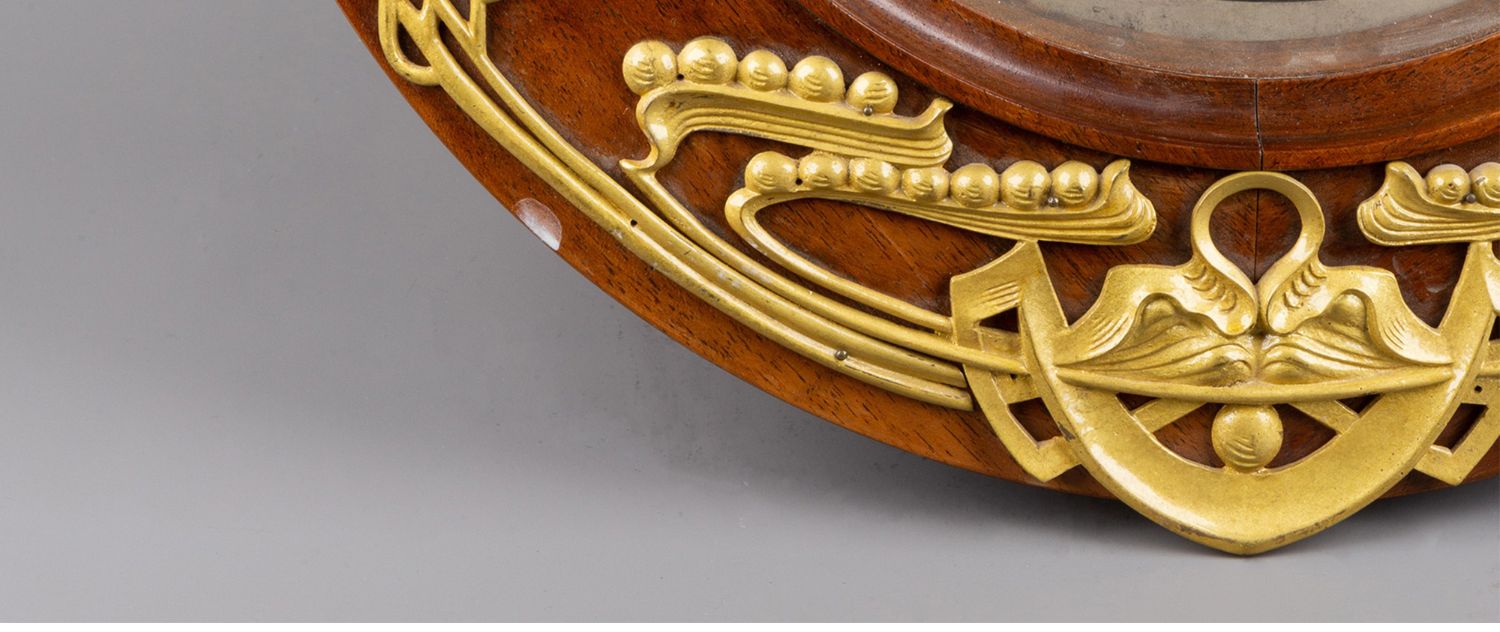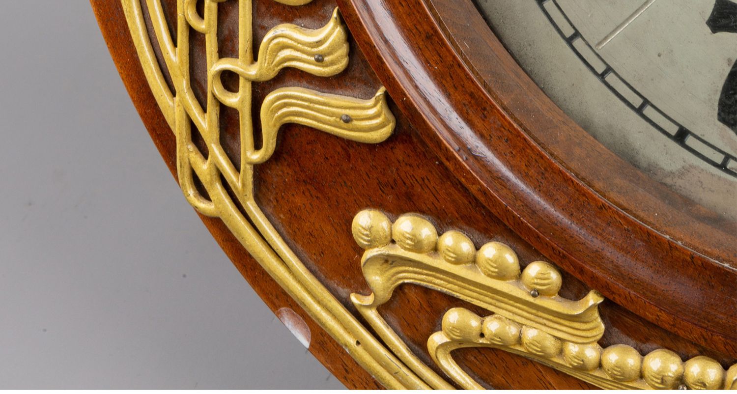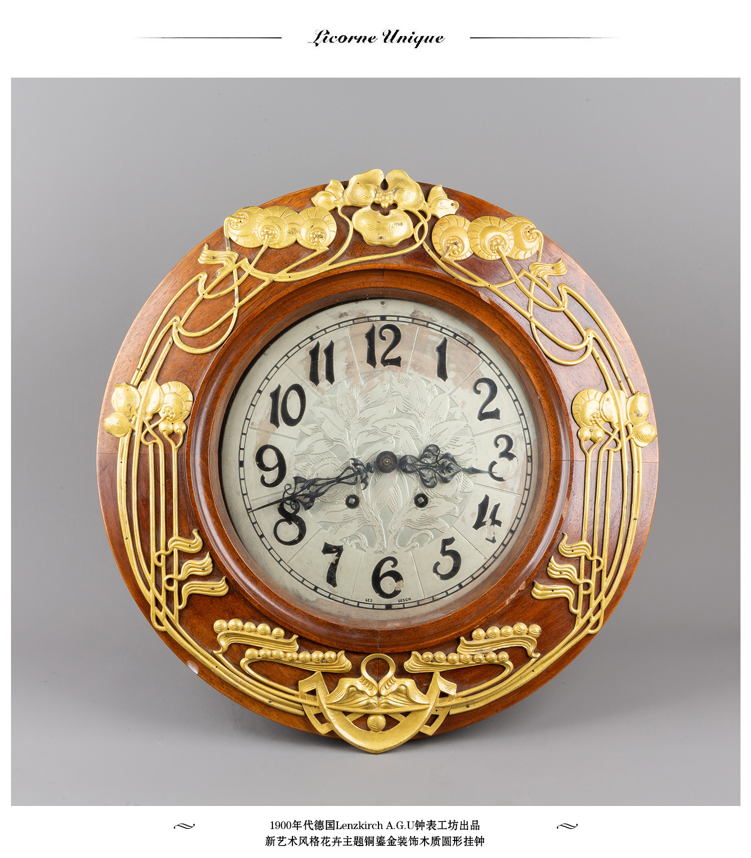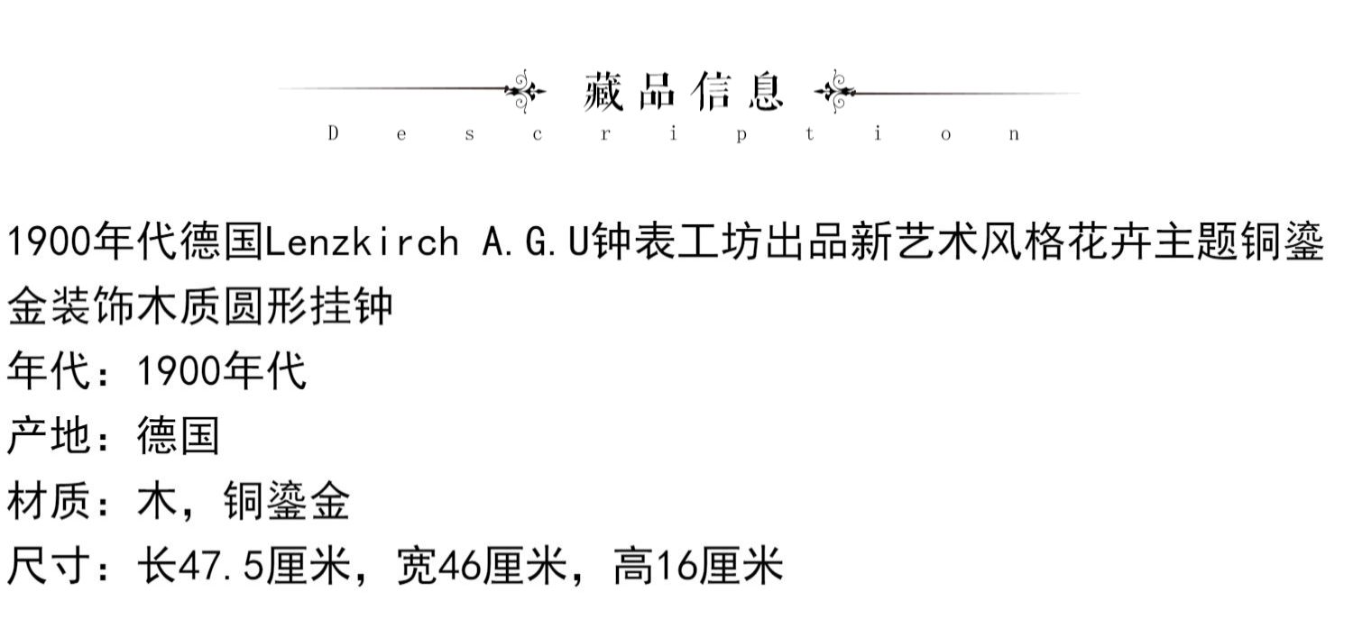 独角鹿西洋古董德国Lenzkirch新艺术风格花卉铜鎏金木质圆形挂钟
