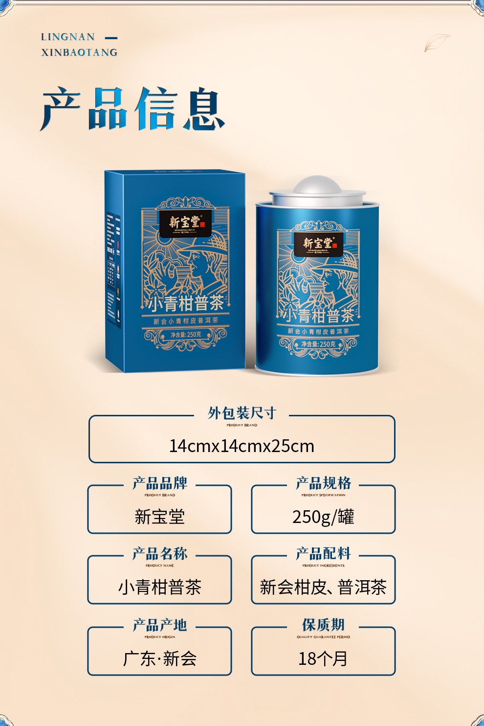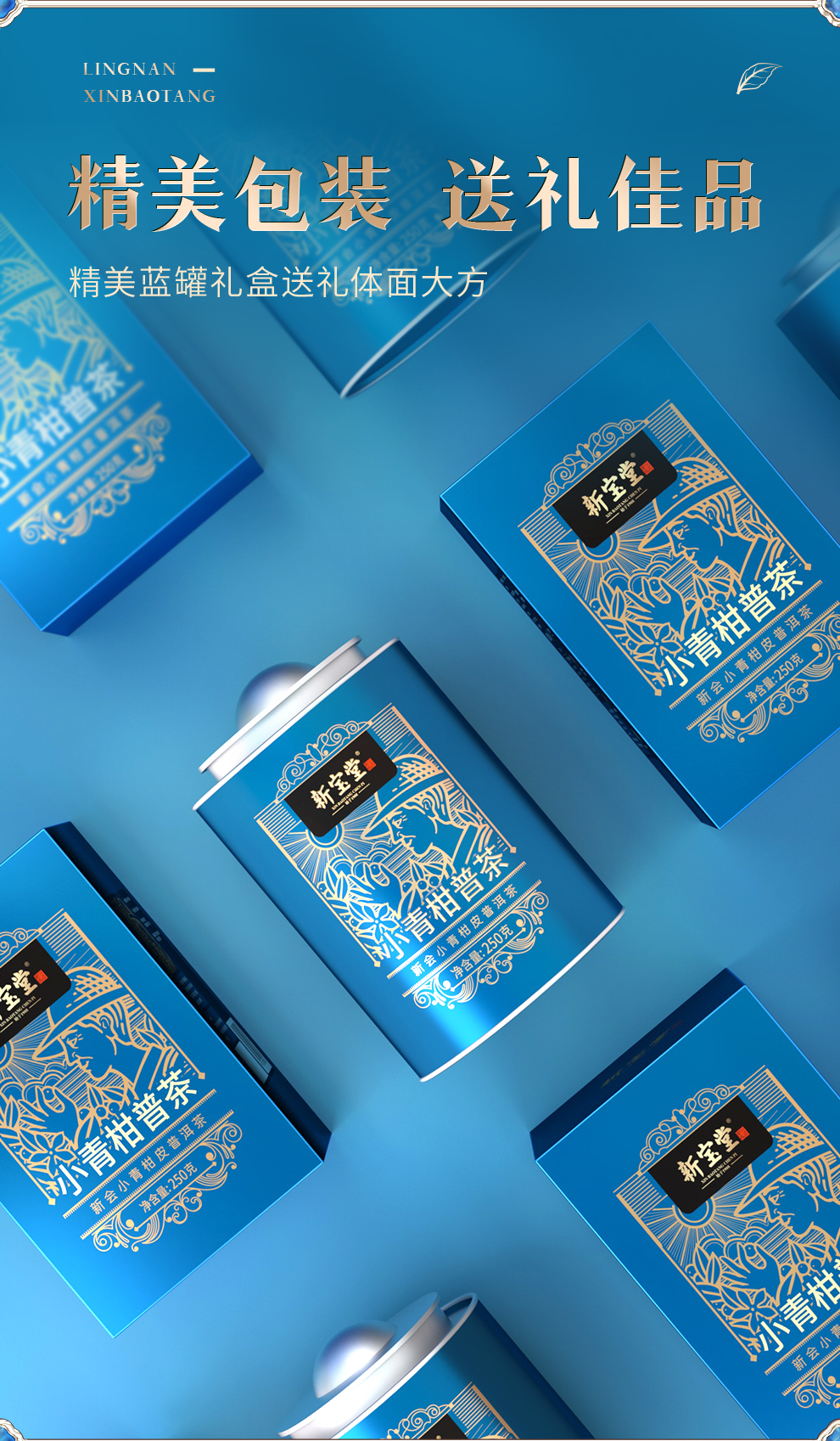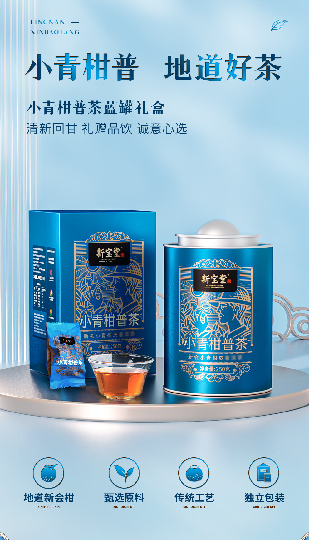 岭南新宝堂新会小青柑普茶熟茶送礼礼盒蓝罐250克