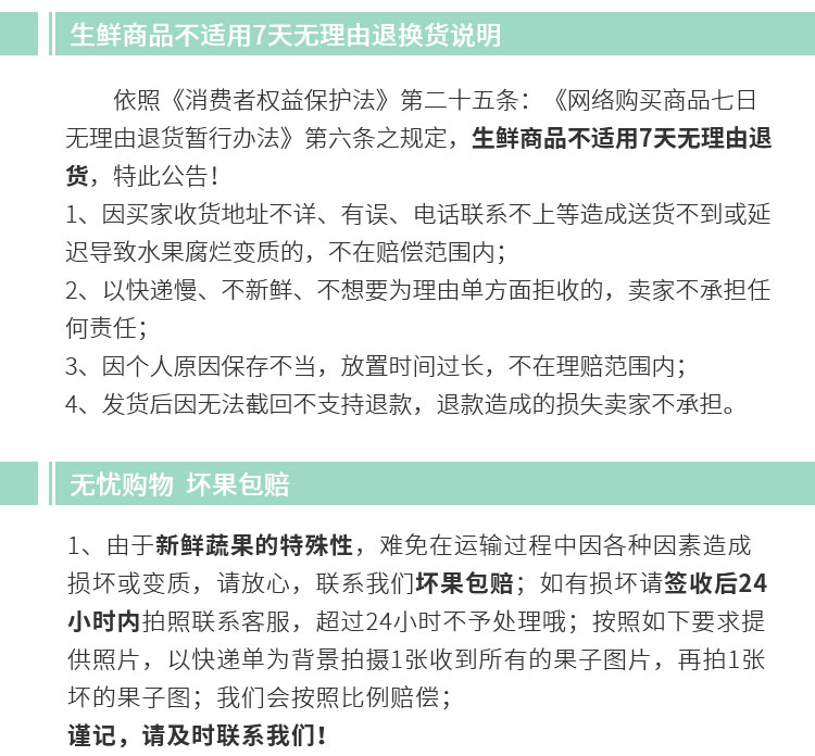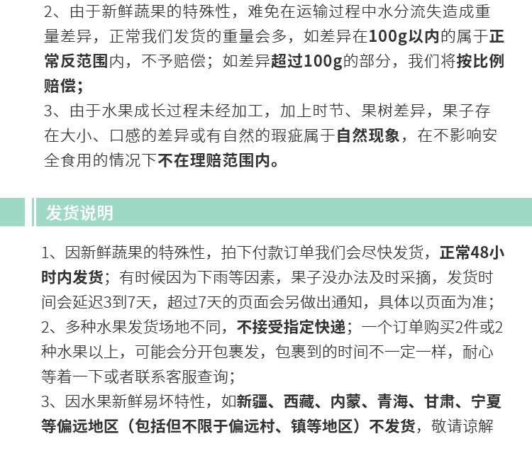 (4)果子自然的成长,果子自身所吸收的营养程度不同,所以个头大小也不一样,采摘的批次时间不同,大小方面也会有些许差异,此类属于正常情况不在理赔范围内哦。