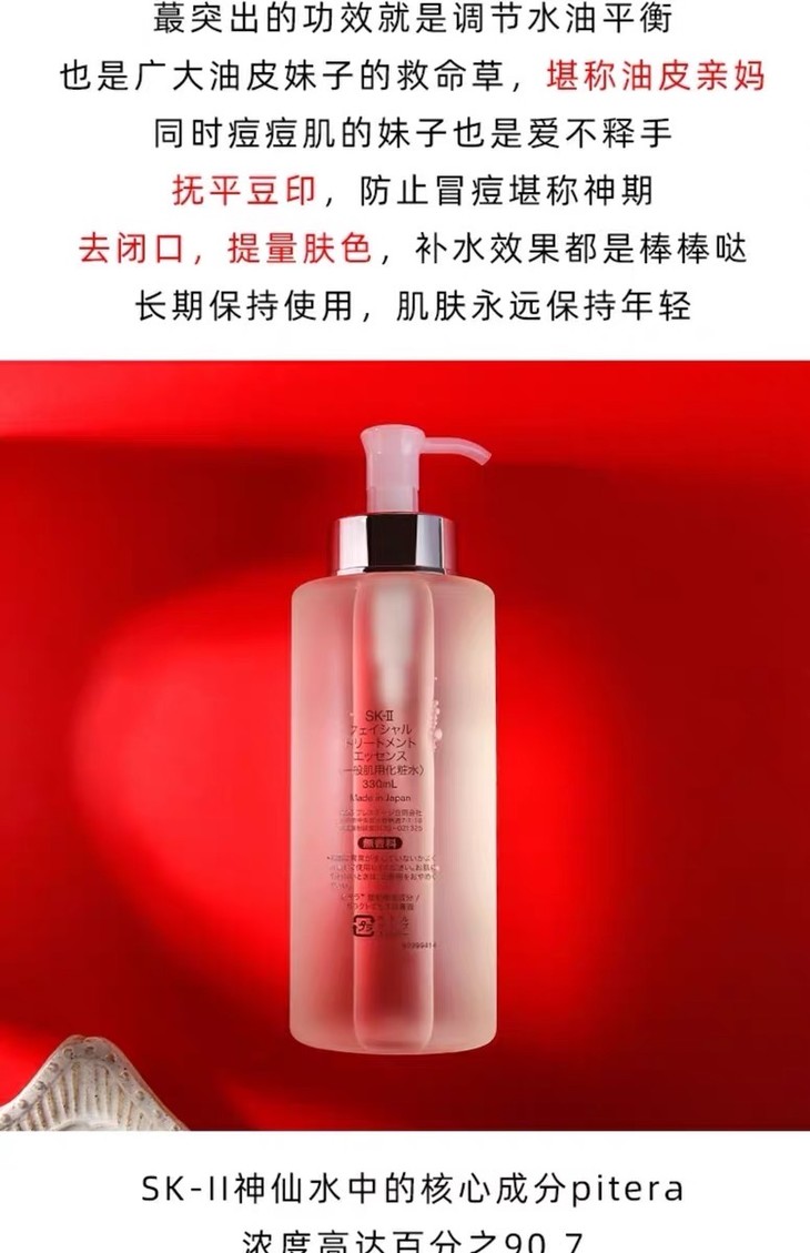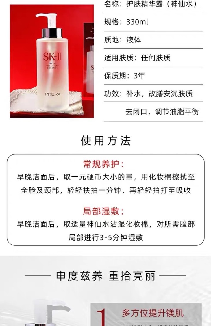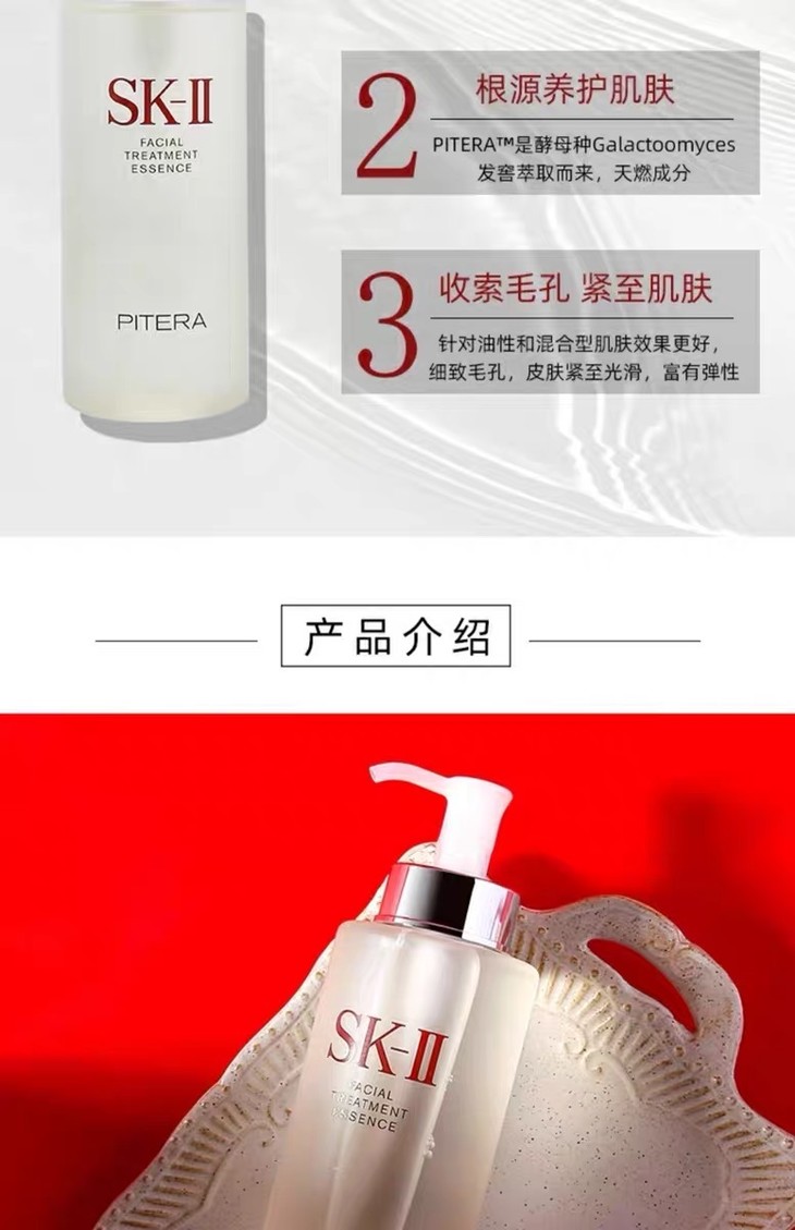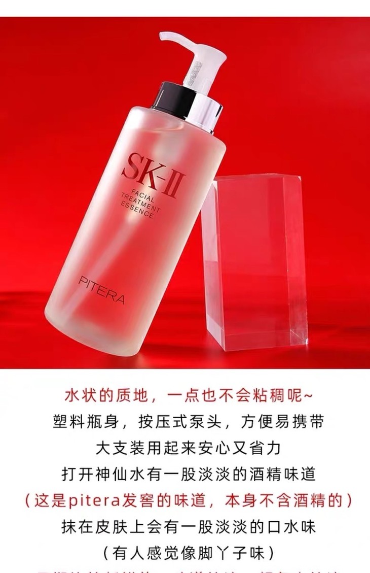 3、功效:皮肤细腻度和通透度都可以肉眼看到改善。适合所有肤质,整瓶含高达90.7%的SK-II 特有的Pitera精华神奇修护力量让脸上的问题奇迹般渐渐淡化,肌肤越变越细致~