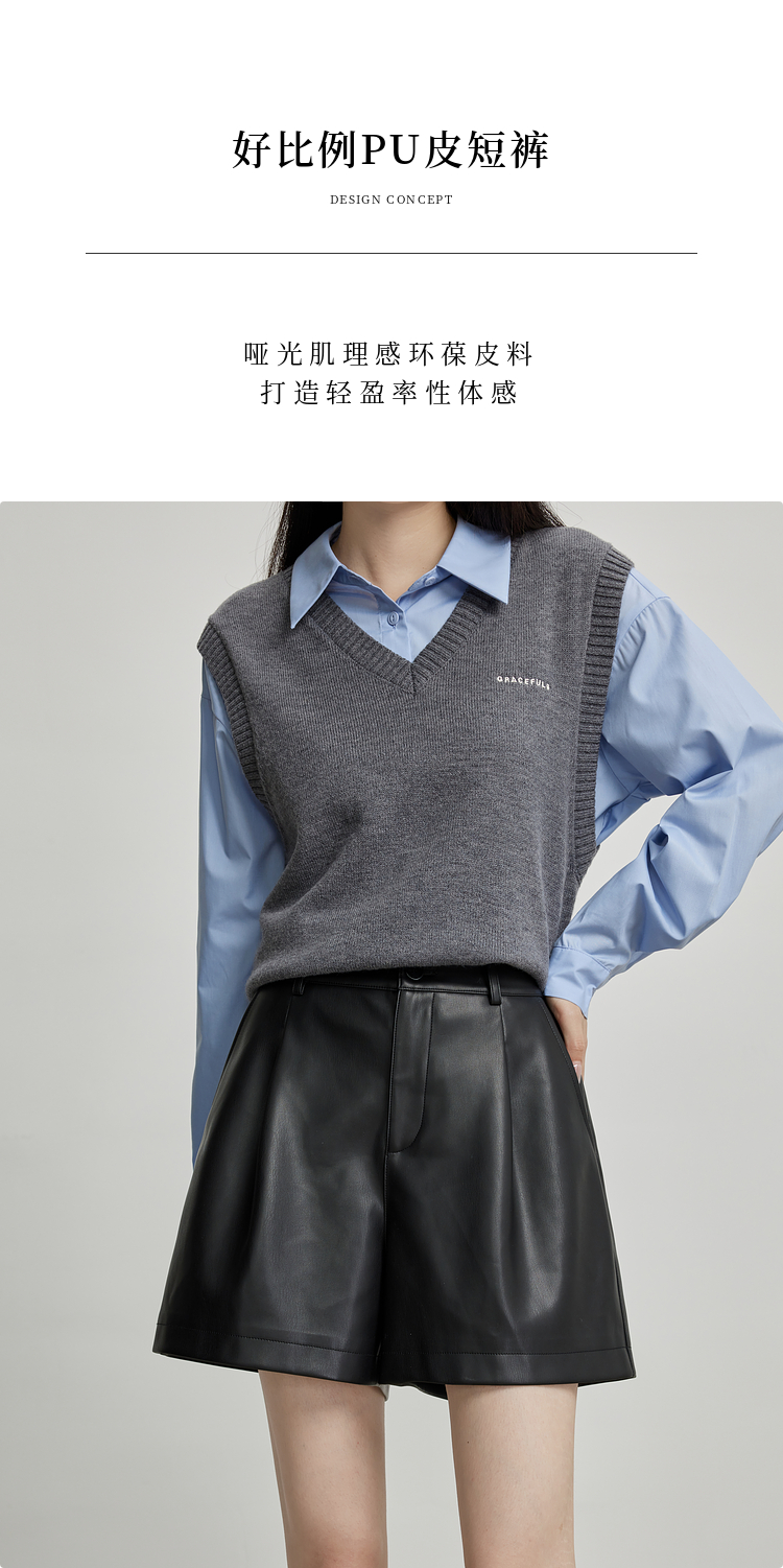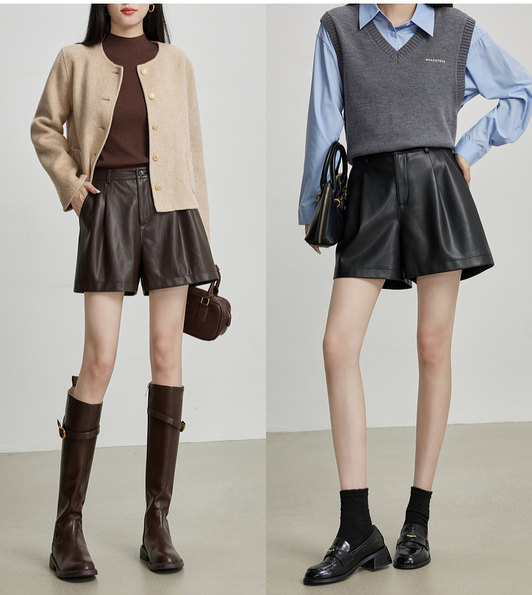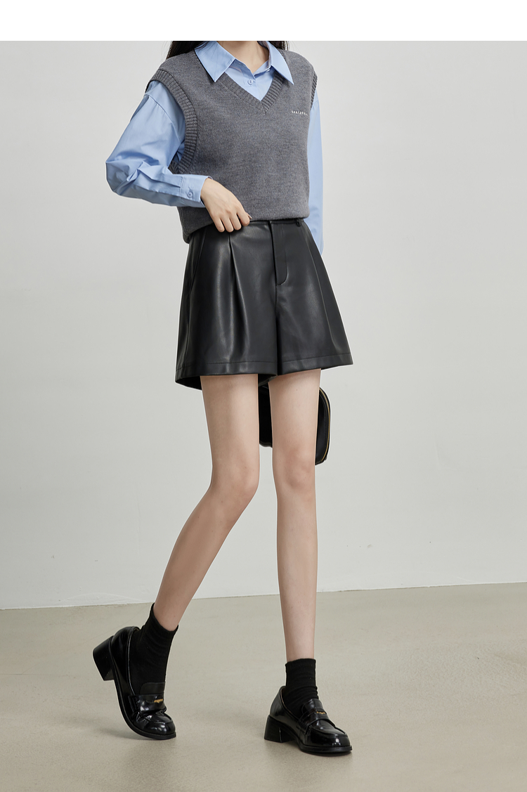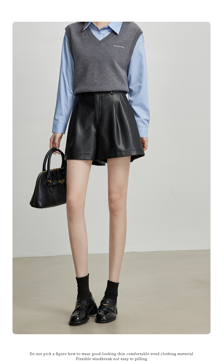 【09/03新品】熙世界PU皮短裤女秋冬2025新款高腰显瘦a字阔腿五分裤直筒裤靴裤