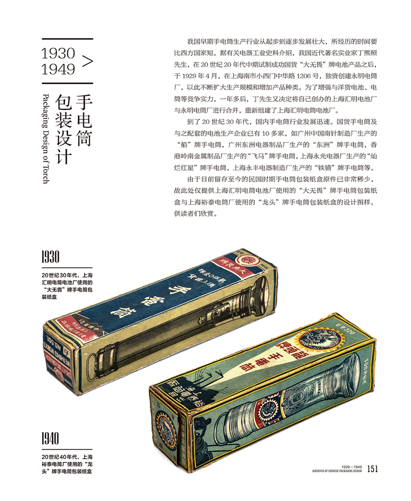 本书稿所收录的200余张图片,全部选用第一手原件实物进行拍摄的,具有较高的史料与文献价值。作者以当时国内各地市场上人们常见的产品包装为主,其中有不少是当时某一行业中数一数二的国内名牌产品包装,并按当时人们常见的8大行业产品进行分类:纺织品、食品、药品、日用化学品、电器产品、机械五金产品、文化用品和娱乐用品。在包装实物的选择时间上,基本都是1920年至1949年之间,由国内各地(绝大多数都是当时国内极大的工商业城市上海地区)厂商设计、生产。同时本书稿中选用不少设计精美的产品包装标识和包装封口纸,如纺织品行业中的印染布、棉纱等,日用化学品行业中的肥皂、颜料等产品包装标贴,从本身画面设计来看,它的作用不仅仅是起到产品包装标贴和包装封口的作用,还能帮助消费者识别商品名称与商品用途。
