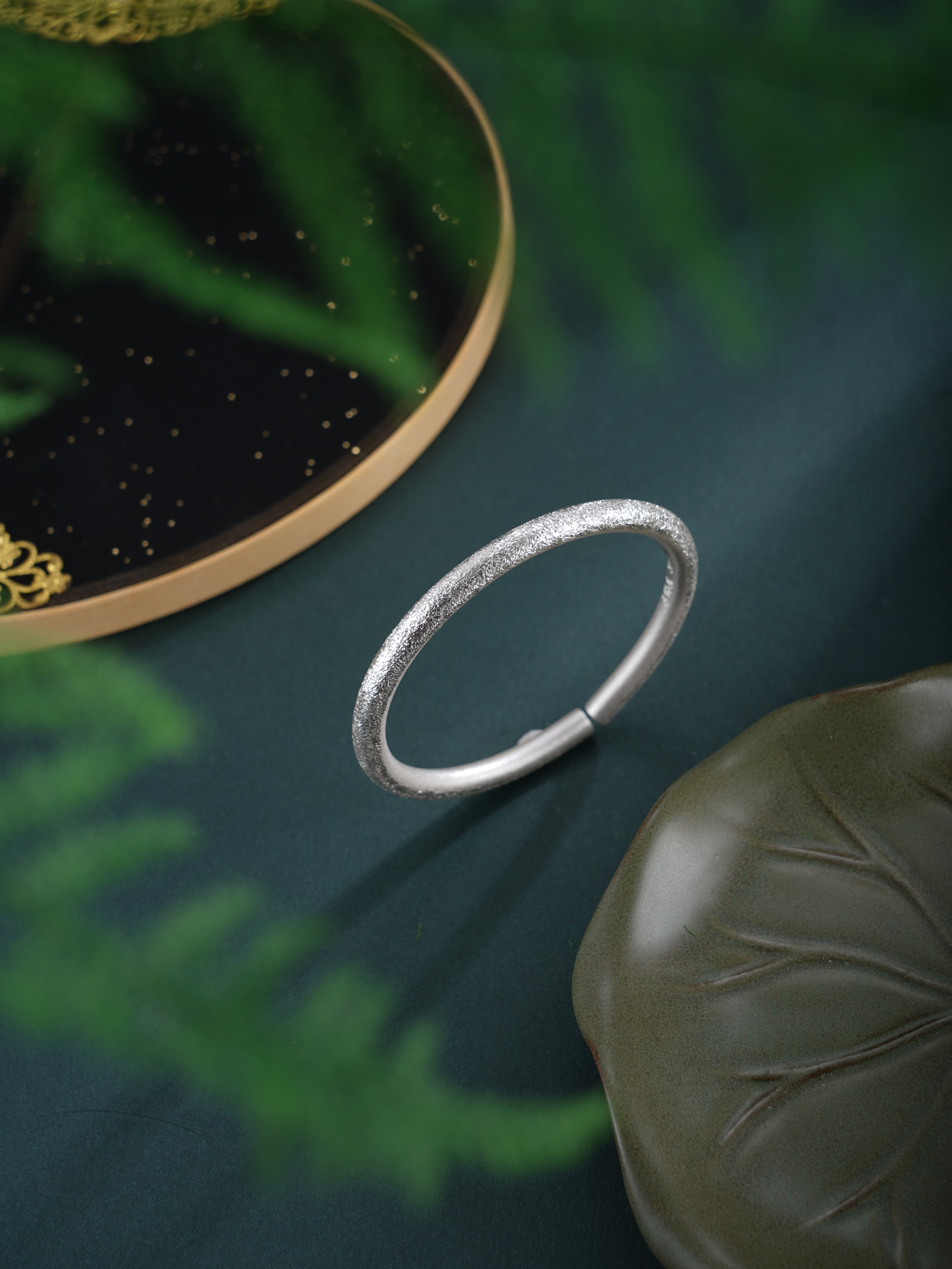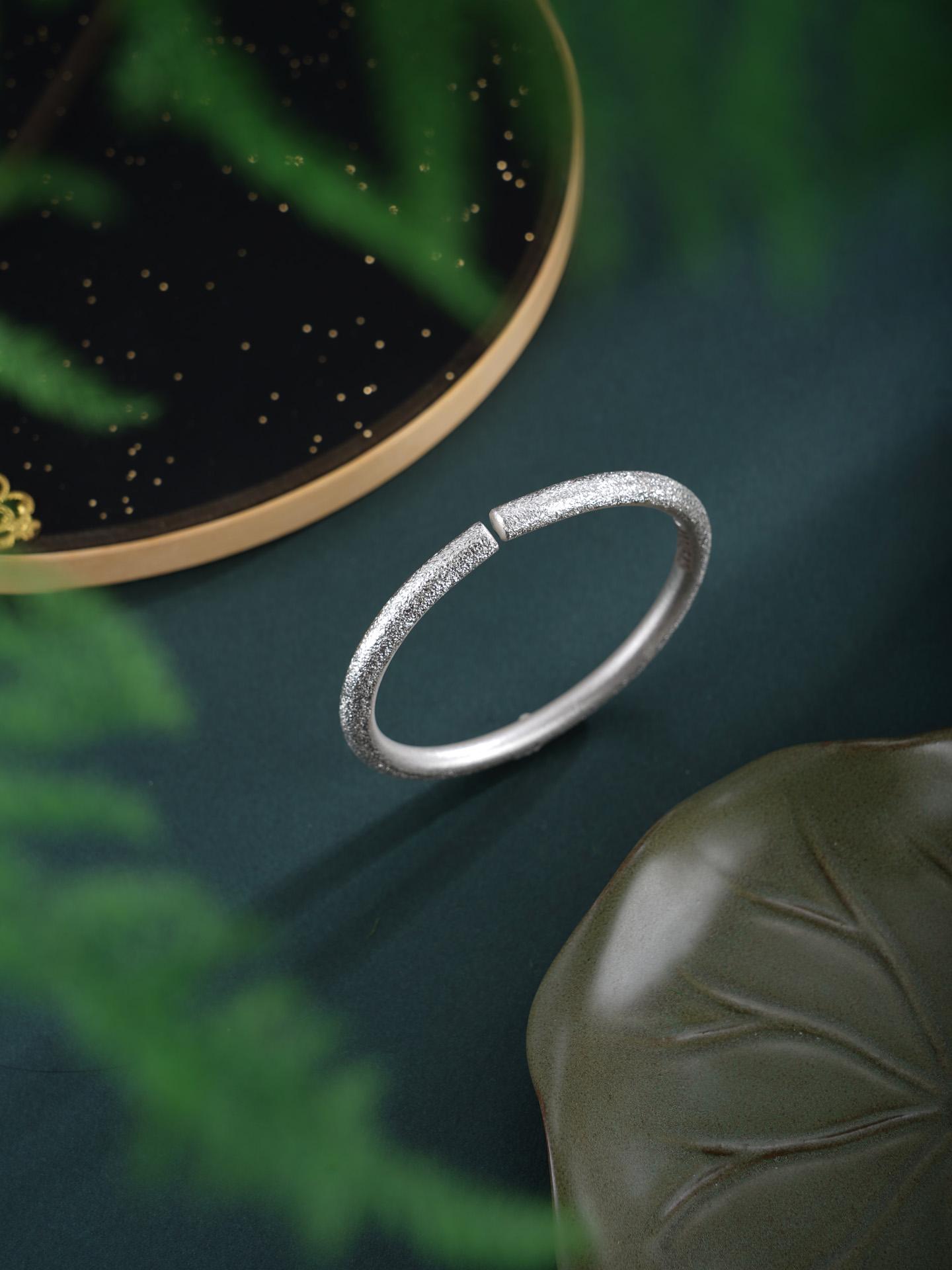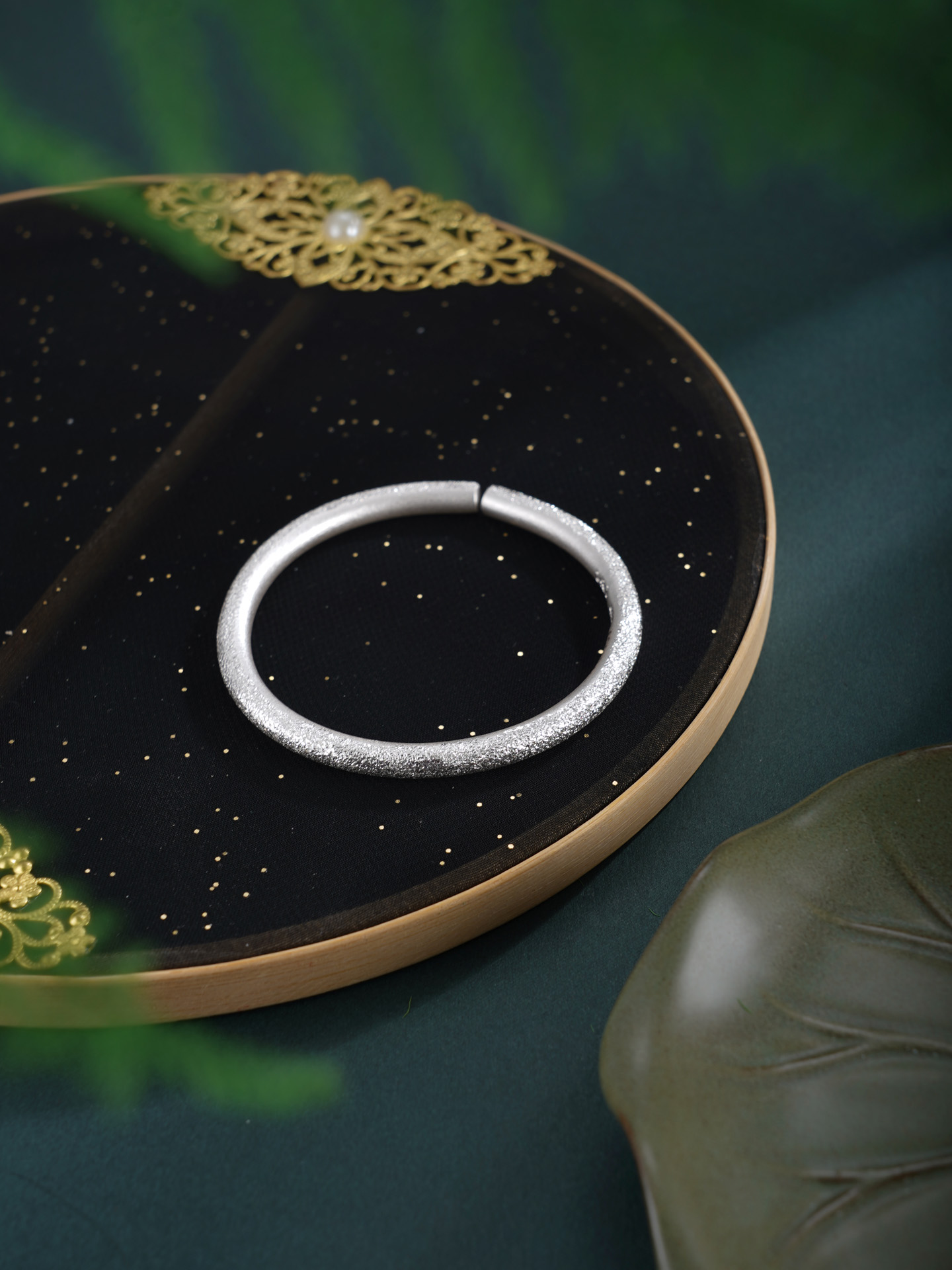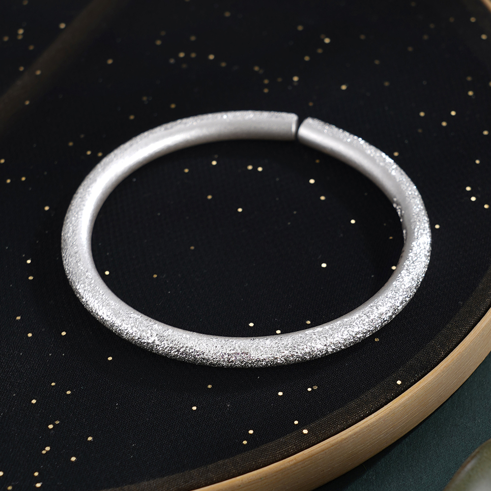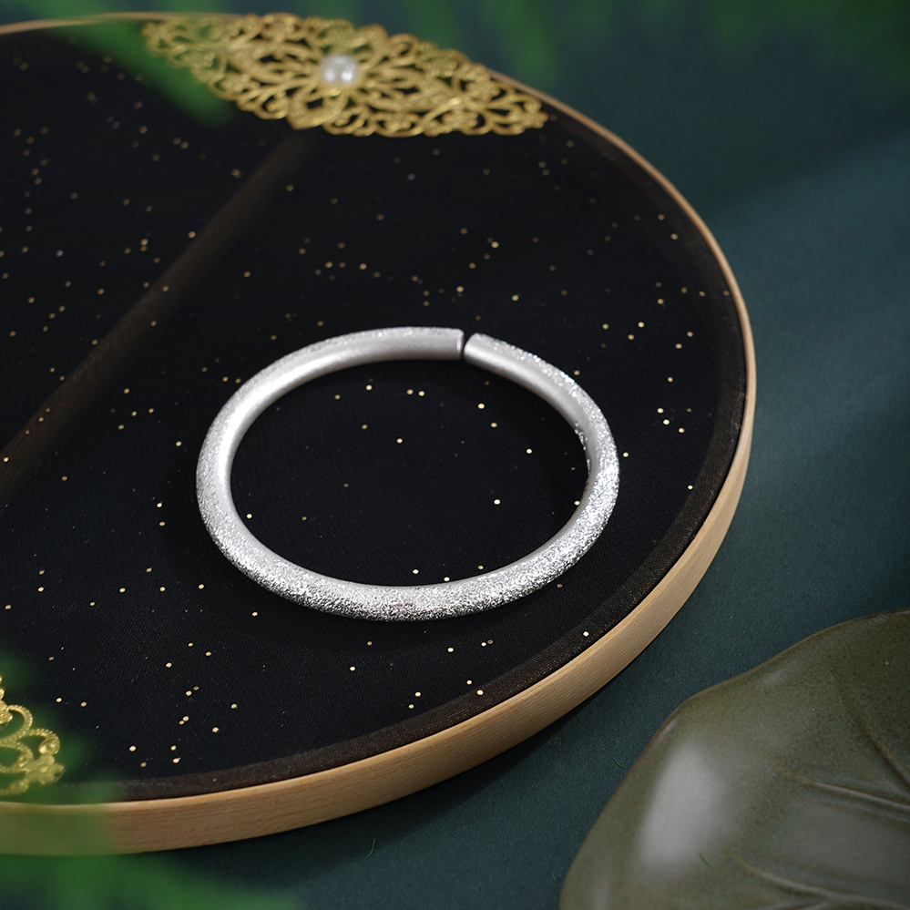 【寓意】:纯银手工手镯,采用钉砂工艺打造粼粼质感,如繁星轻语,莹润闪耀。举手投足间,尽显温婉高雅气质。