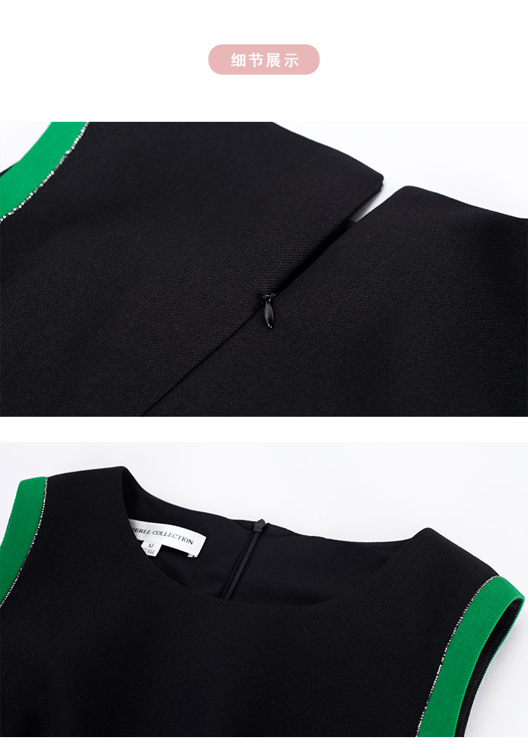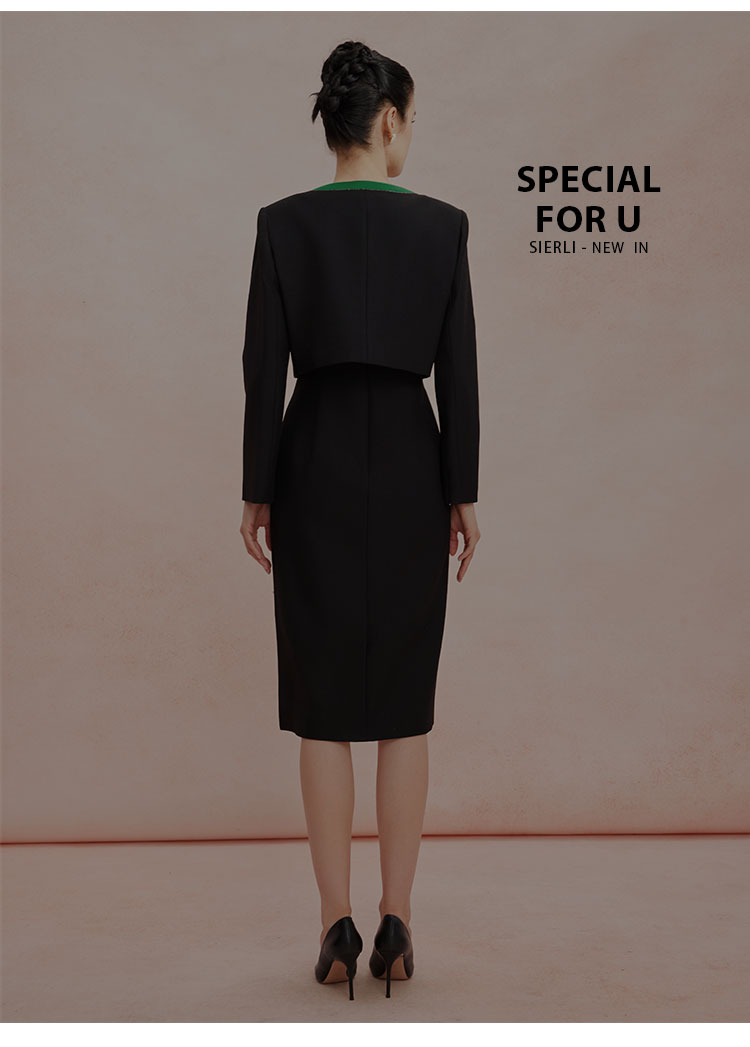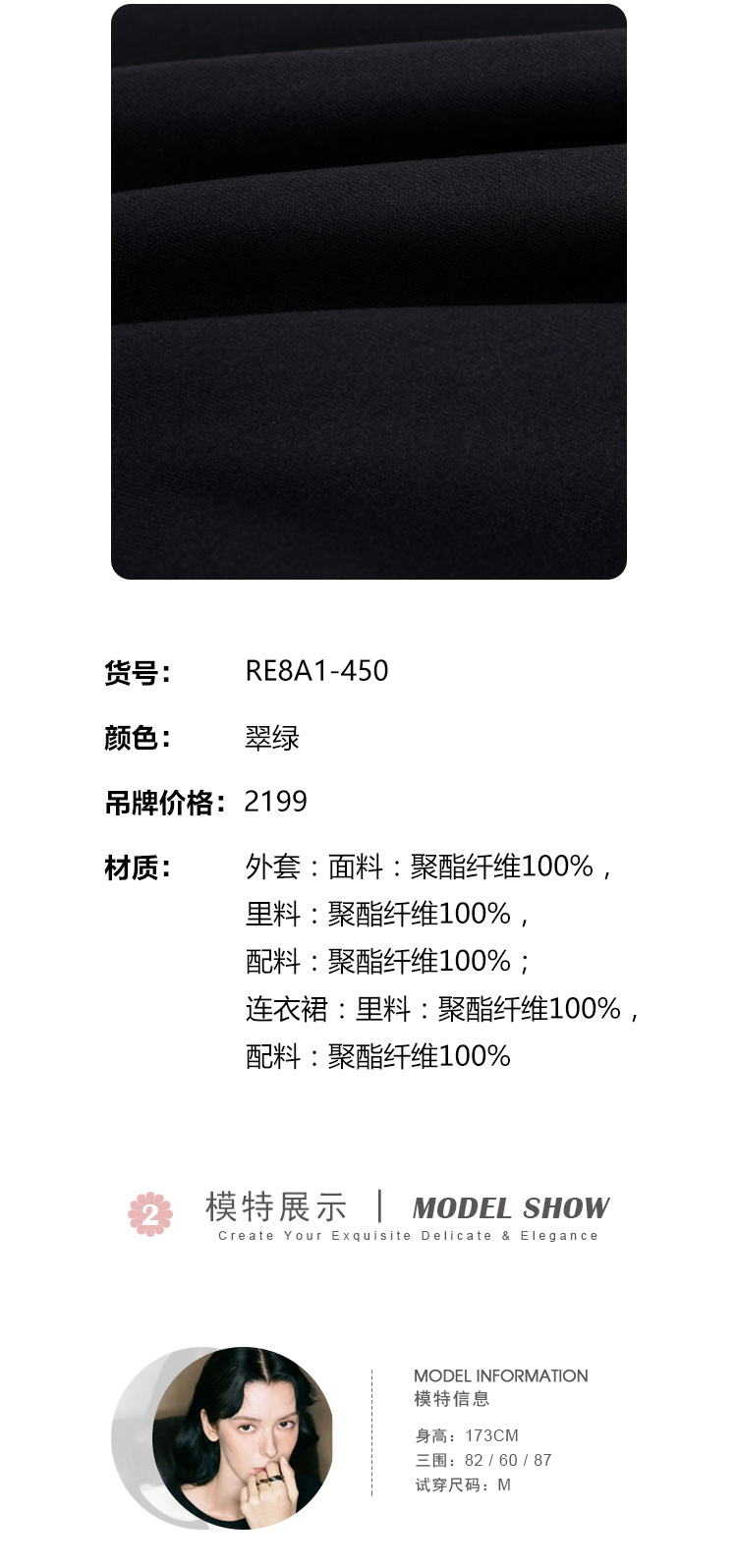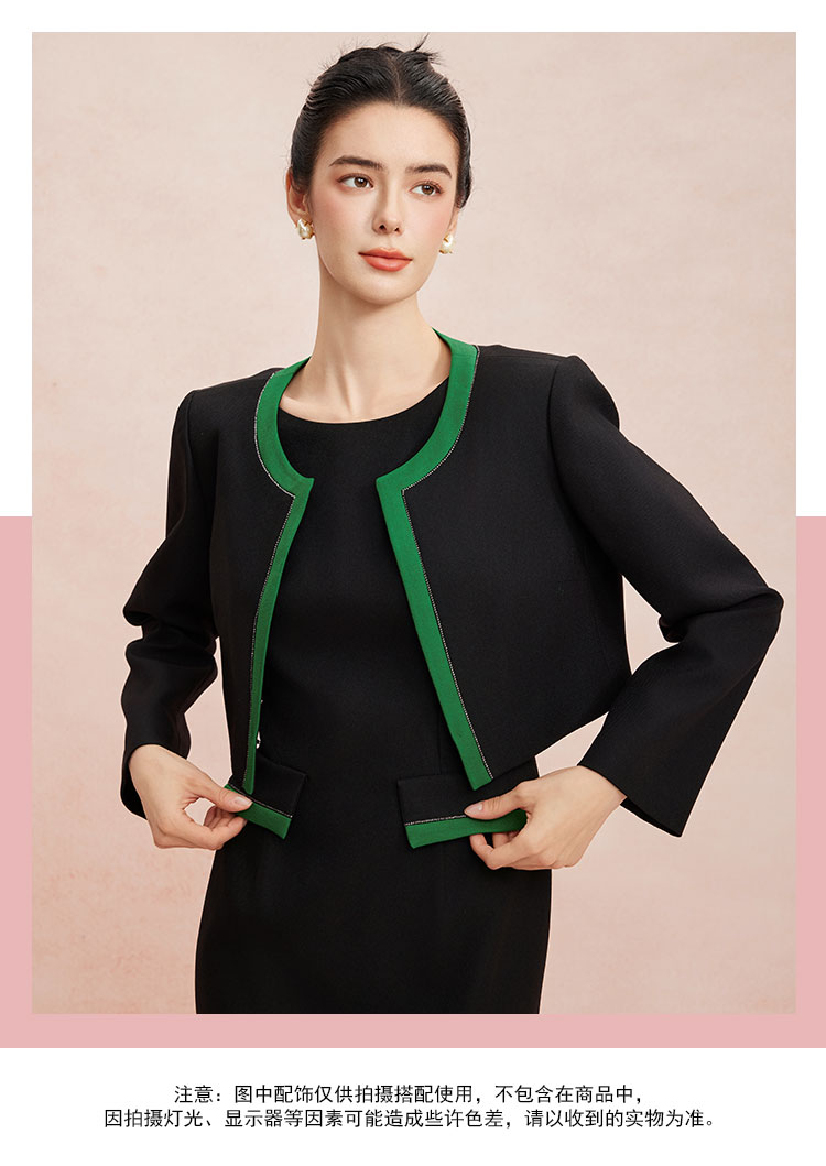 RE8A1斯尔丽瑟俪2023春上新撞色修身圆领烫钻两件套外套+连衣裙