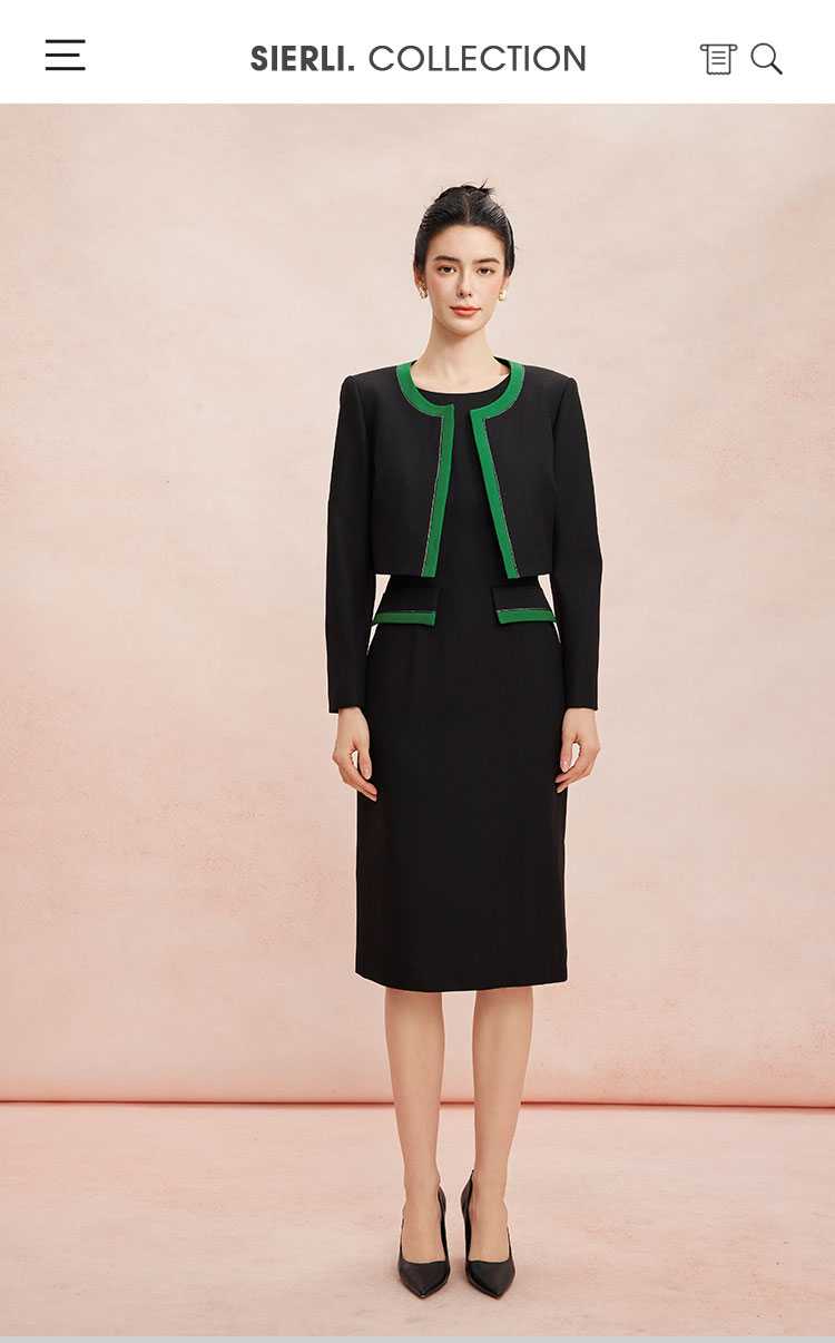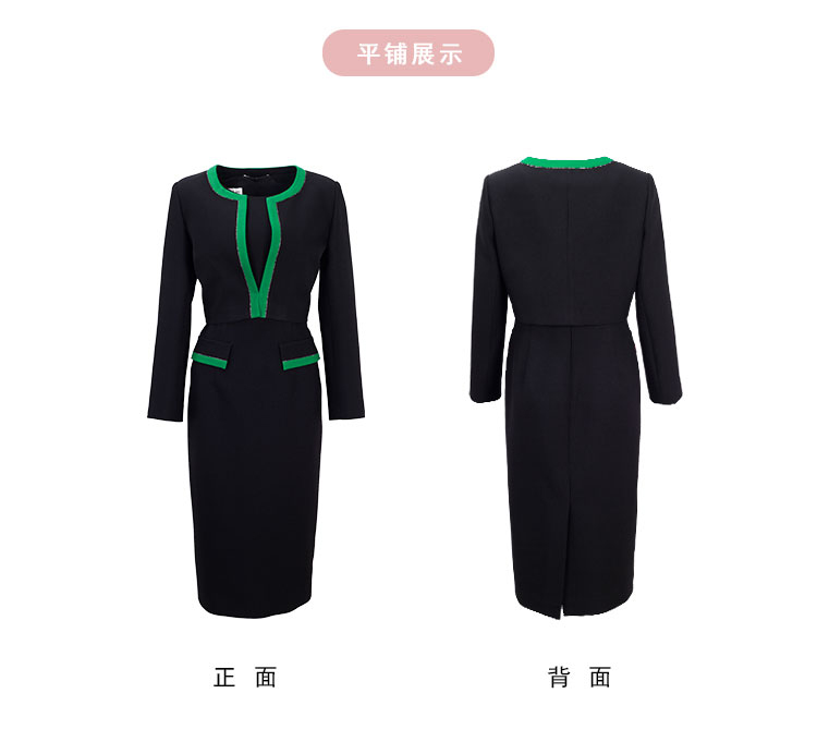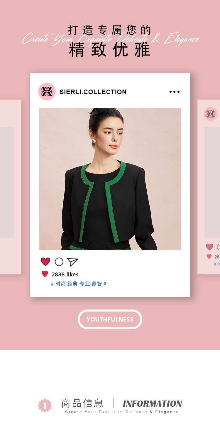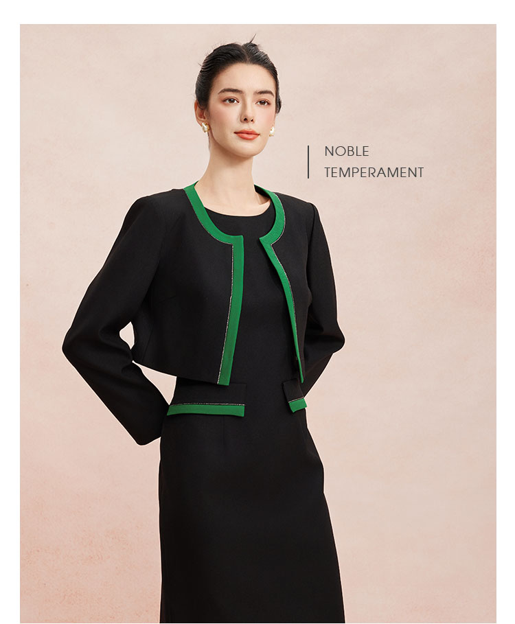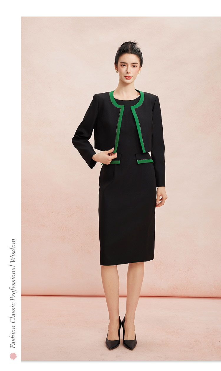 RE8A1斯尔丽瑟俪2023春上新撞色修身圆领烫钻两件套外套+连衣裙