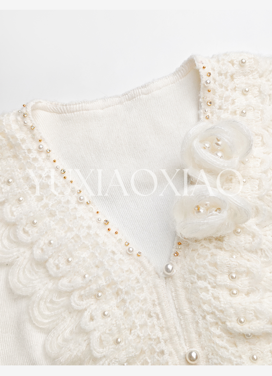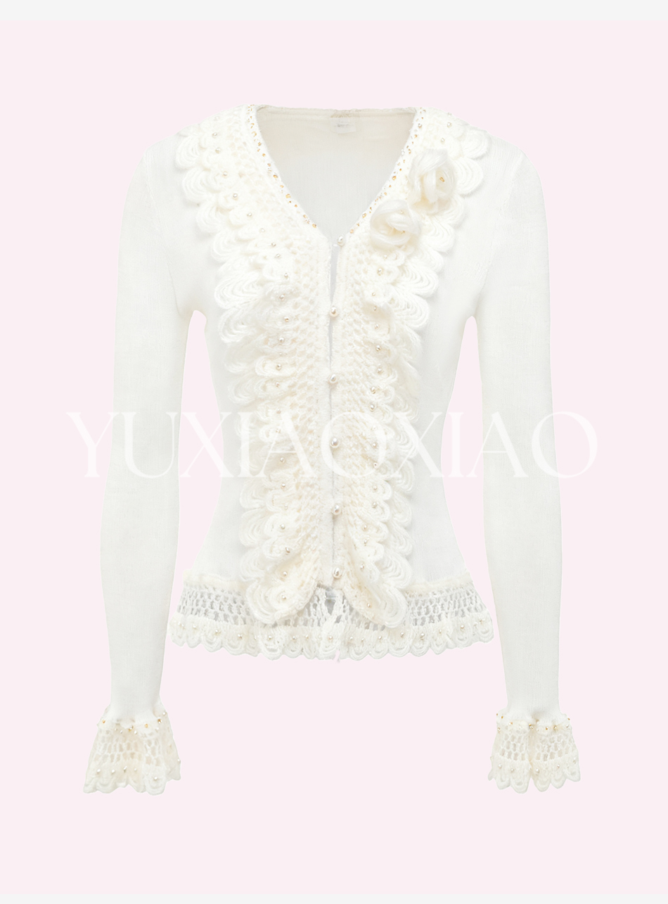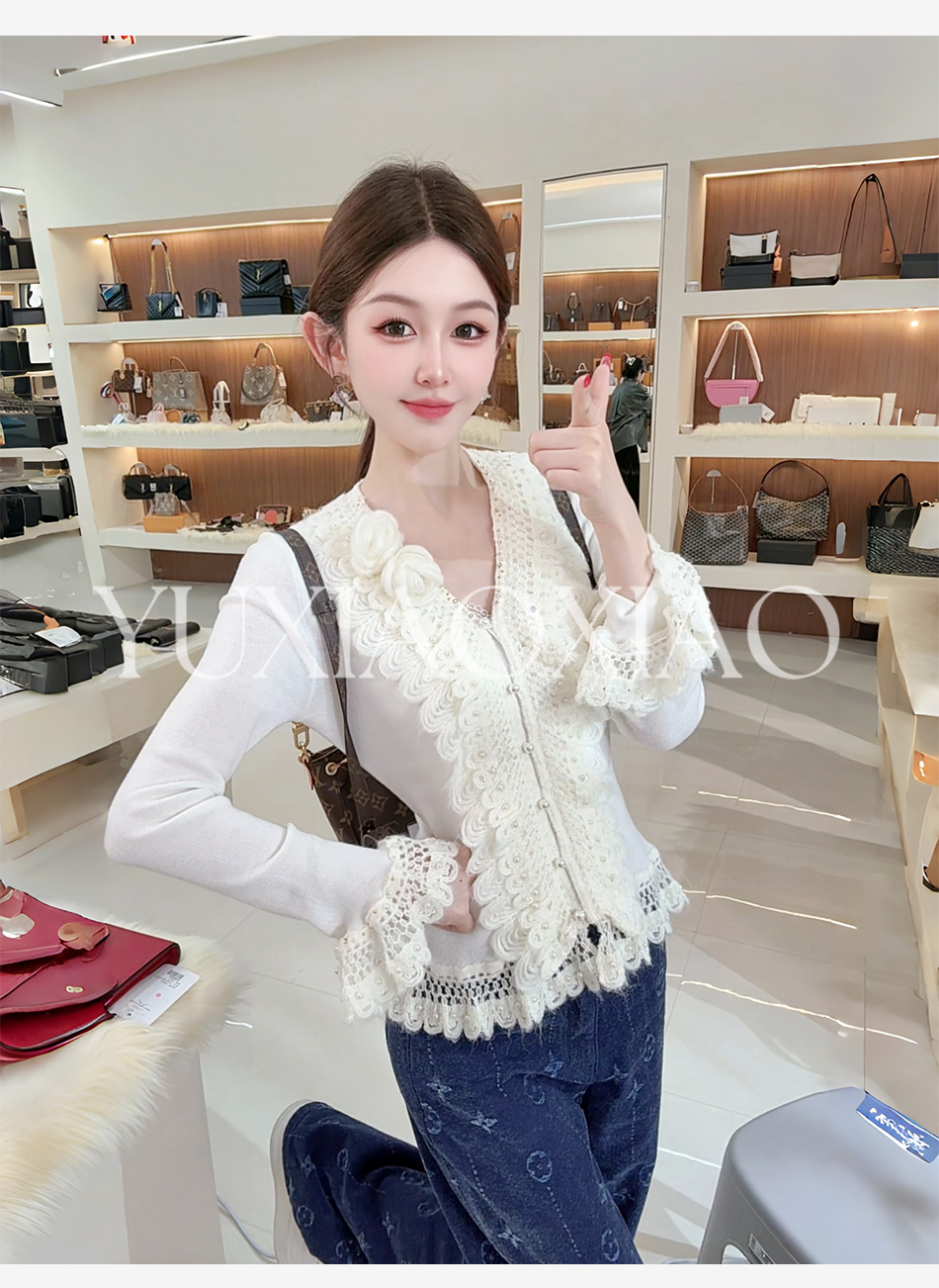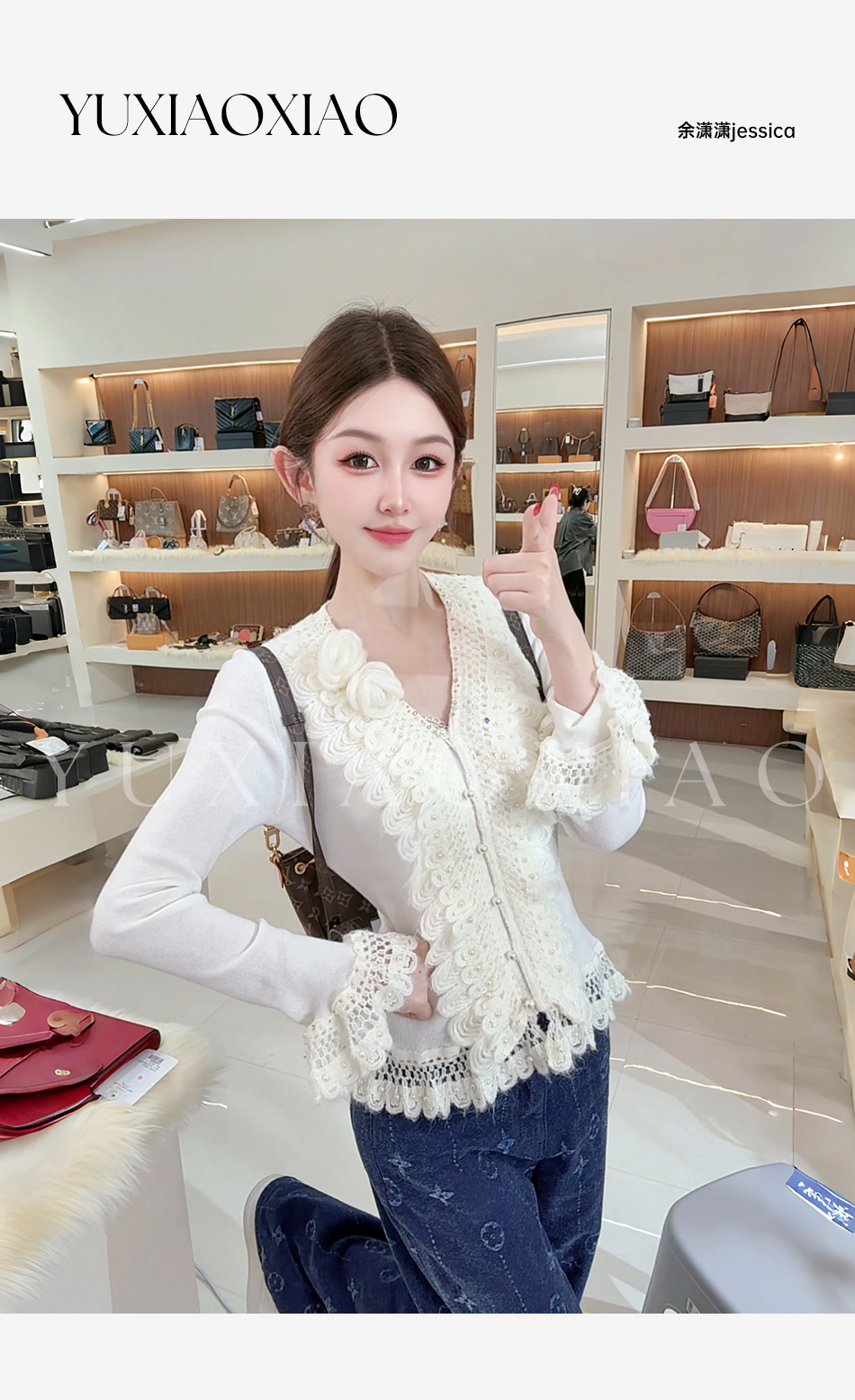 余潇潇【梦幻山茶】含羊毛混纺拼接钩花花边V领修身舒适毛衣外套