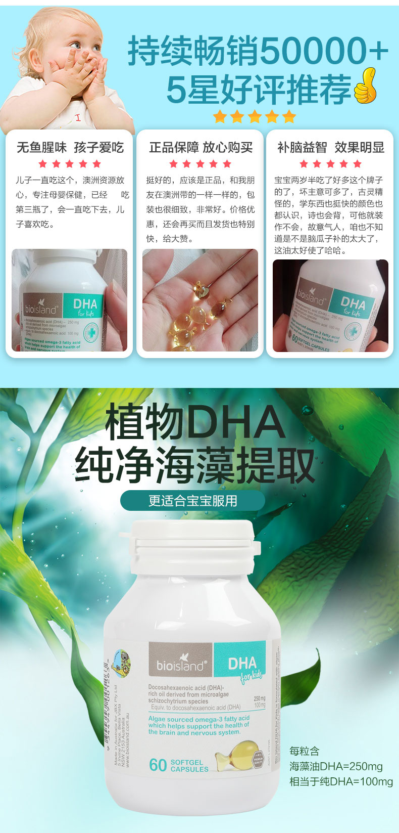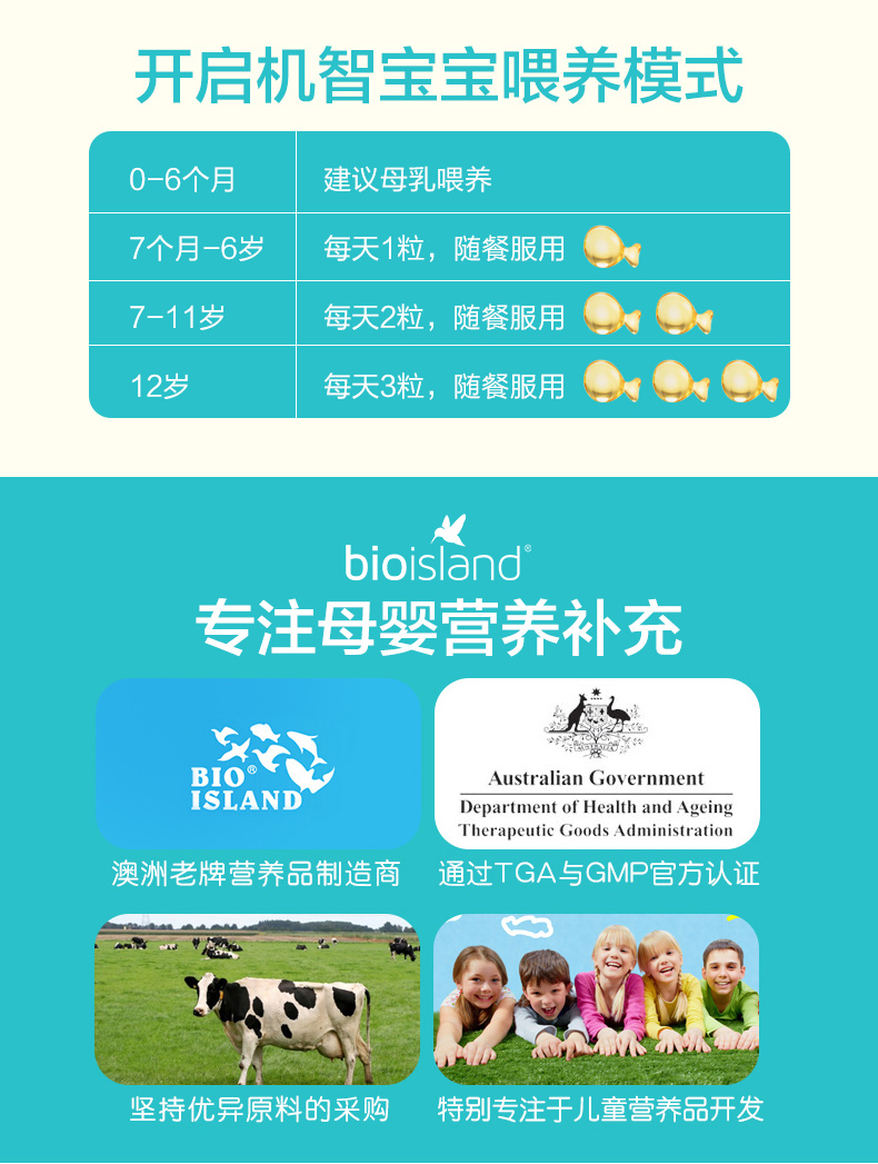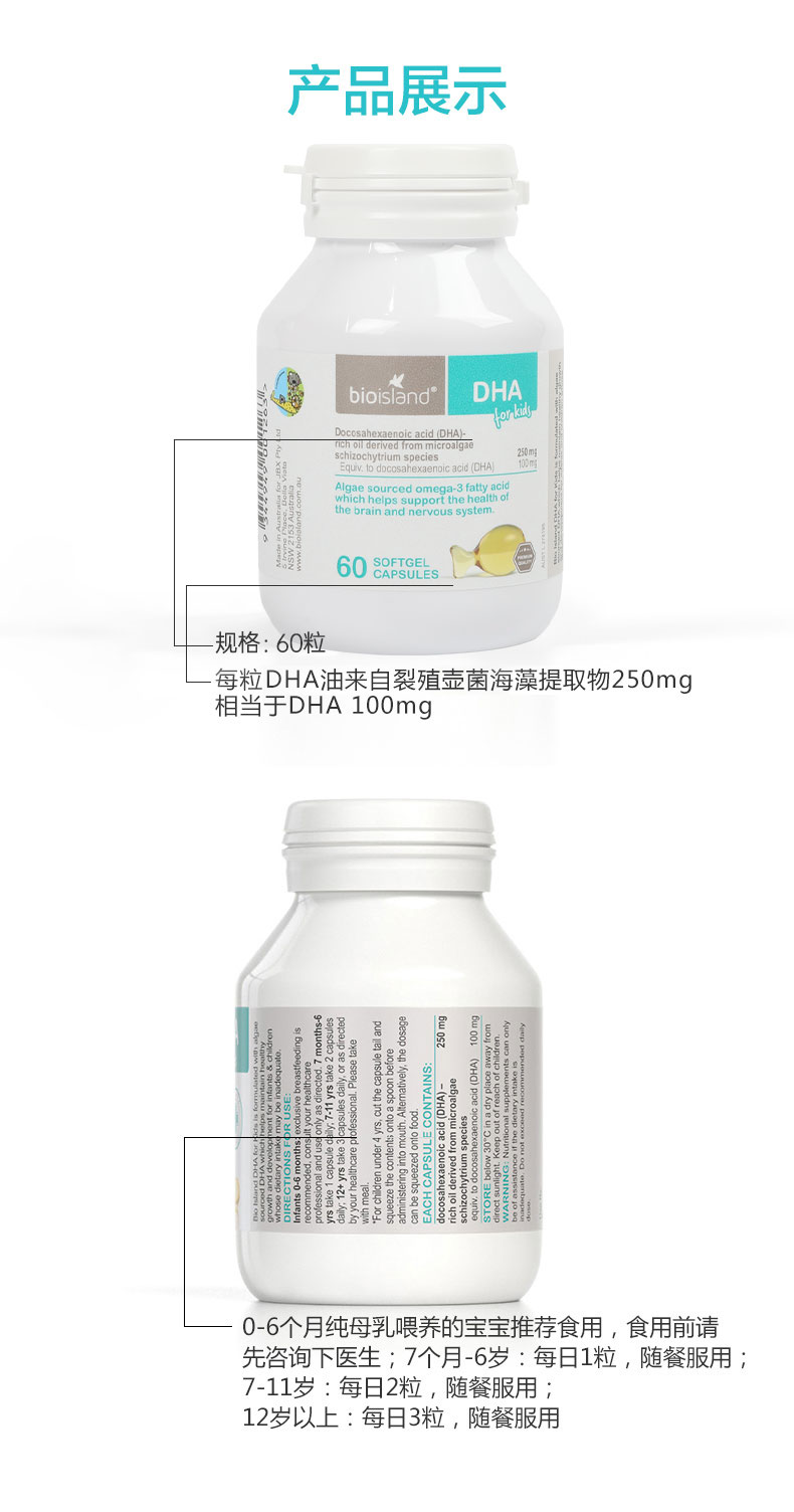 【保税】澳洲Bio-island佰澳朗德 儿童海藻DHA胶囊 60粒/瓶 宝宝的脑黄金 补脑必备