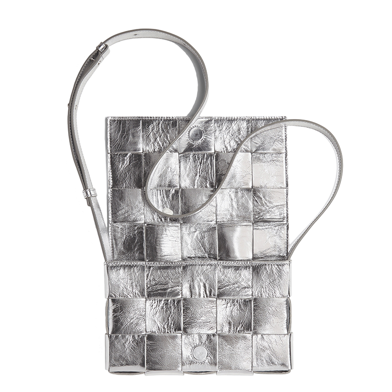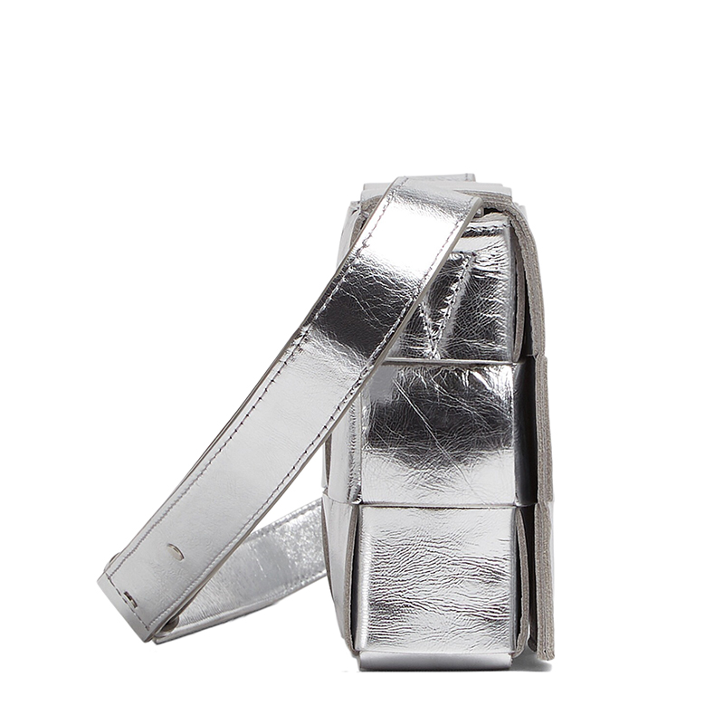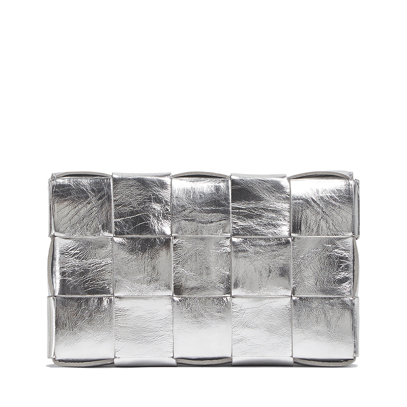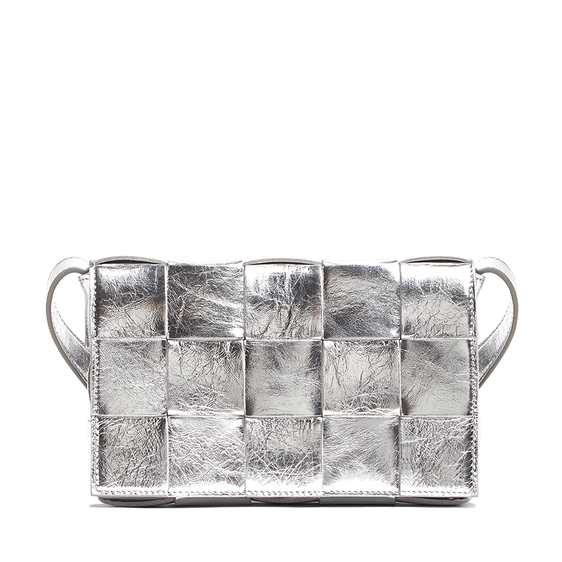 【包税】Bottega Veneta/葆蝶家 22春夏新款CASSETTE系列 女士银色Intreccio编织层压羊皮革斜挎单肩包578004V1H018101