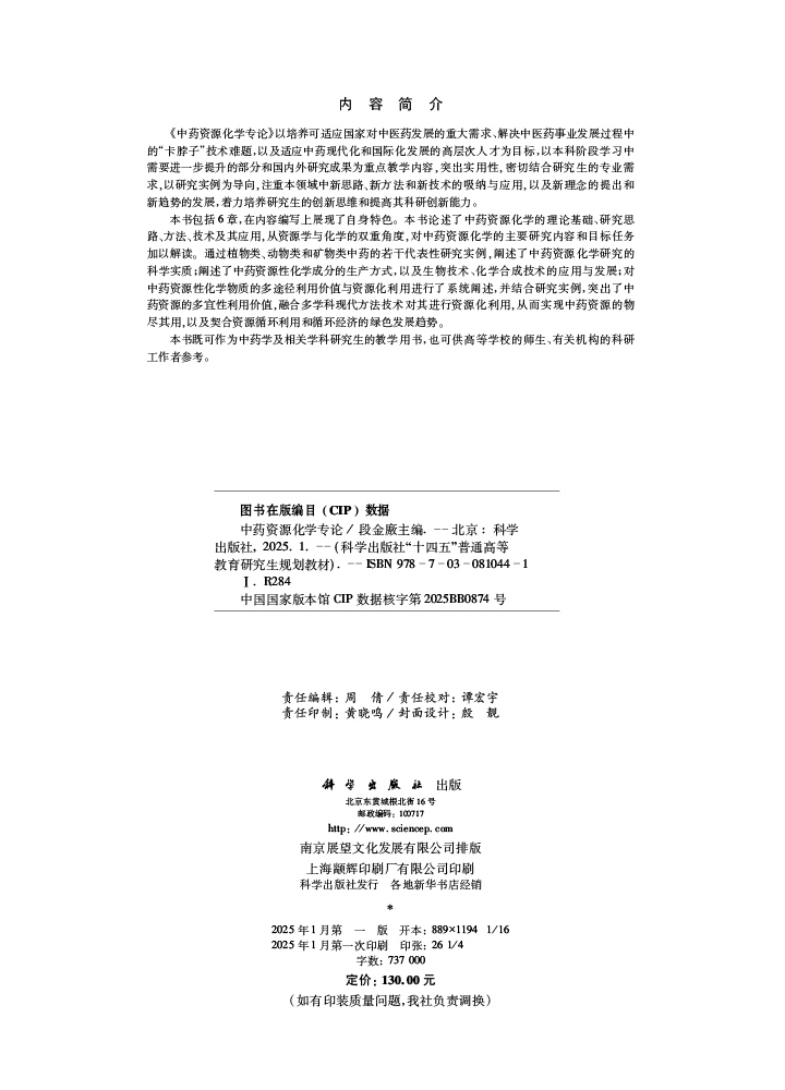 中药资源化学专论 十四五普通高等教育研究生规划教材 段金廒主编 中药学 药学研究生系列教材出版工程 9787030810441科学出版社
