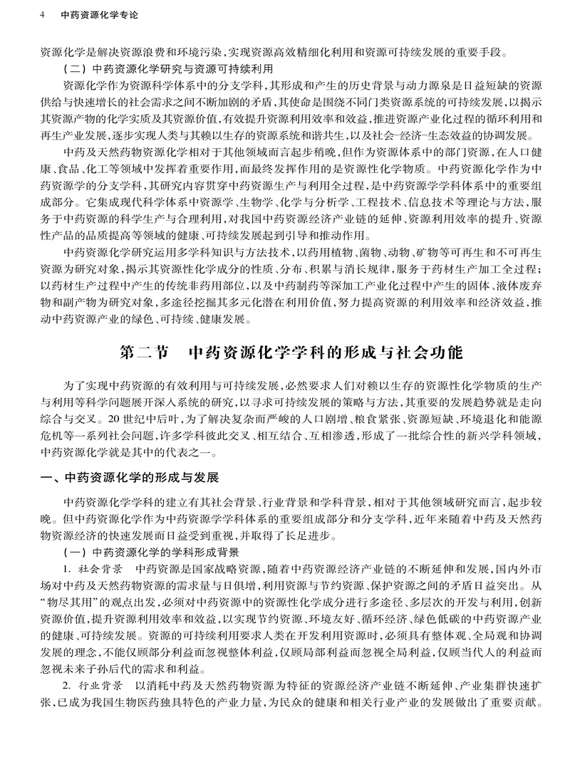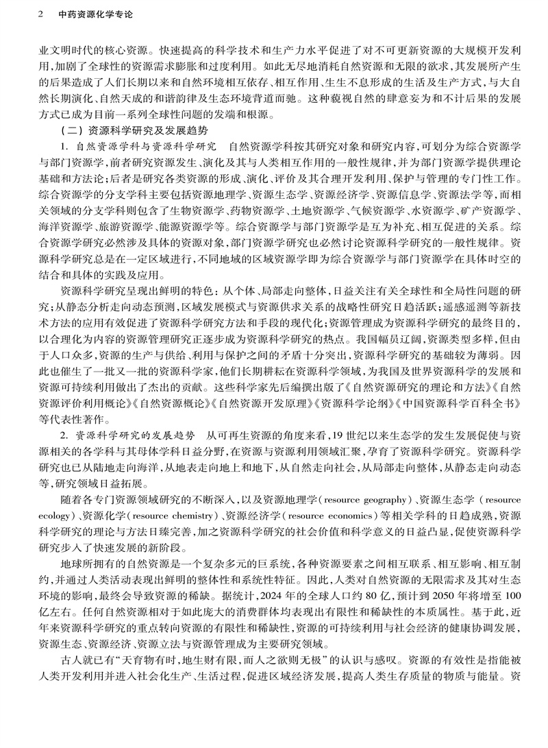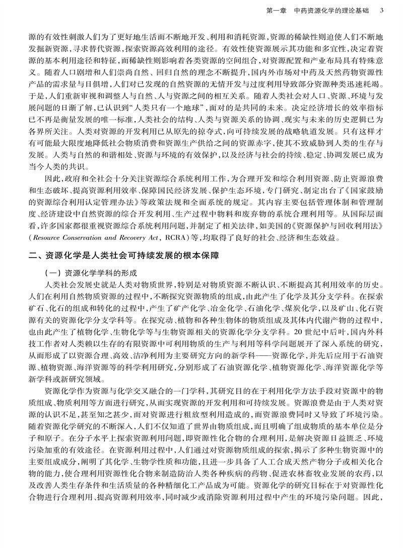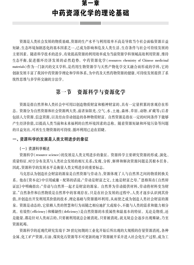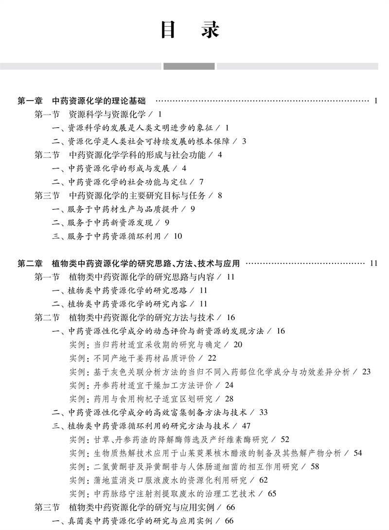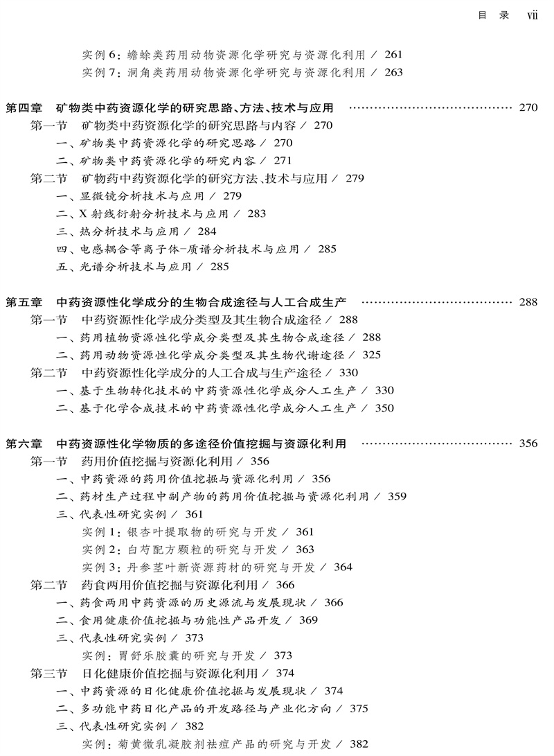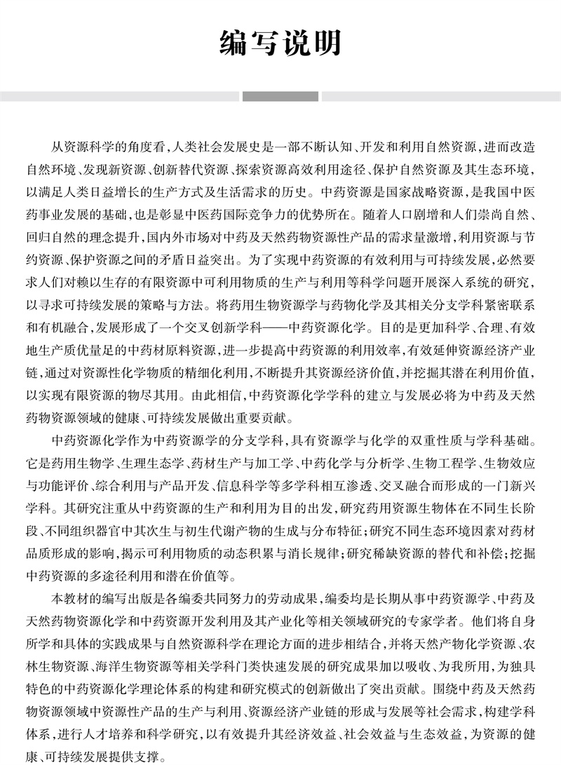 本书包括6章,在内容编写上展现了自身特色。本书论述了中药资源化学的理论基础、研究思路、方法、技术及其应用,从资源学与化学的双重角度,对中药资源化学的主要研究内容和目标任务加以解读。通过植物类、动物类和矿物类中药的若干代表性研究实例,阐述了中药资源化学研究的科学实质;阐述了中药资源性化学成分的生产方式,以及生物技术、化学合成技术的应用与发展;对中药资源性化学物质的多途径利用价值与资源化利用进行了系统阐述,并结合研究实例,突出了中药资源的多宜性利用价值,融合多学科现代方法技术对其进行资源化利用,从而实现中药资源的物尽其用,以及契合资源循环利用和循环经济的绿色发展趋势。