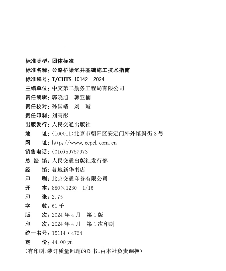 书名:公路桥梁沉井基础施工技术指南(T/CHTS 10142—2024)