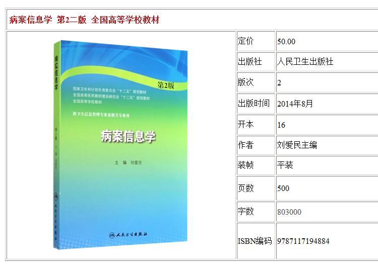 正版 病案信息学 第2版第二版全国高等学校教材 刘爱民人民卫生出版社供卫生信息管理专业十二五规划教材 病案信息学9787117194884