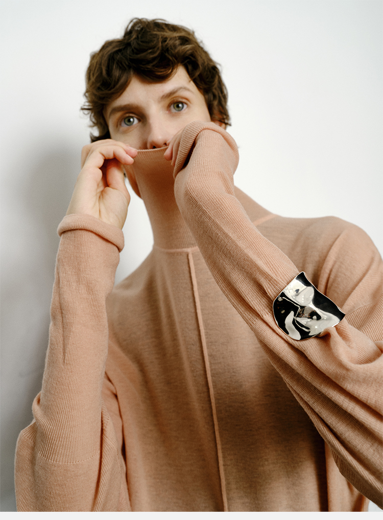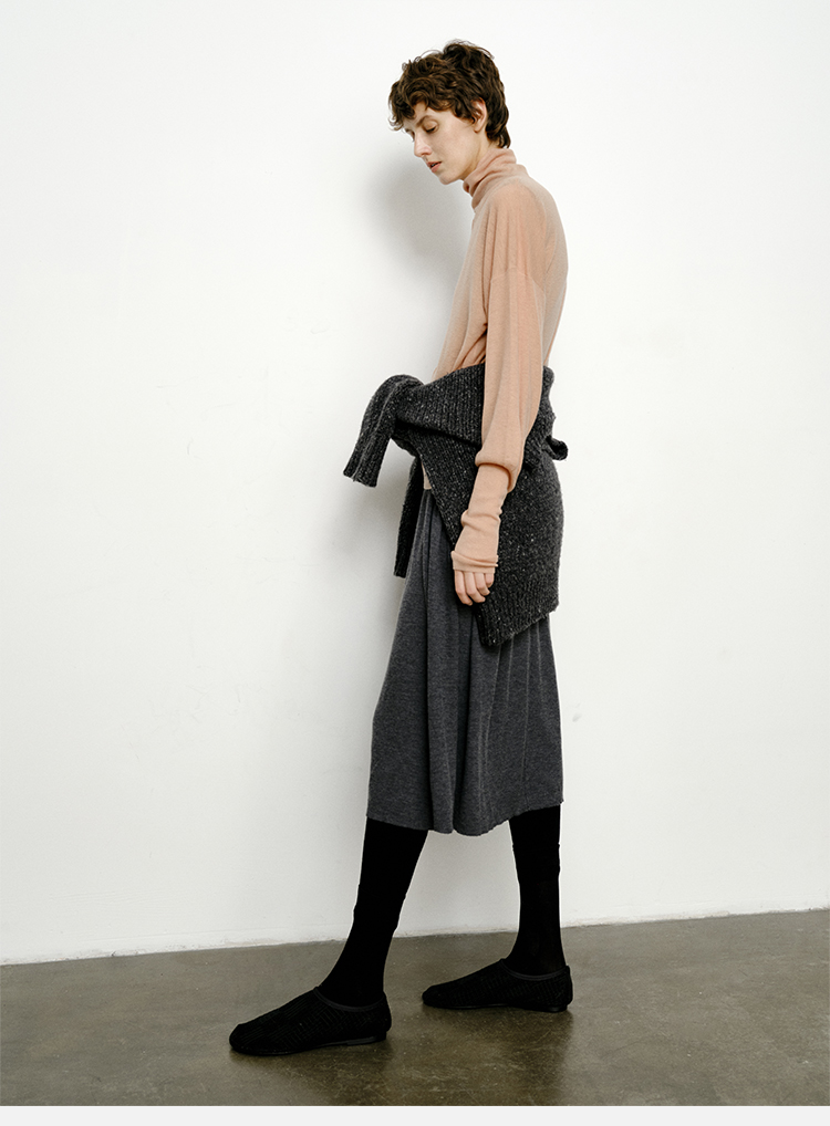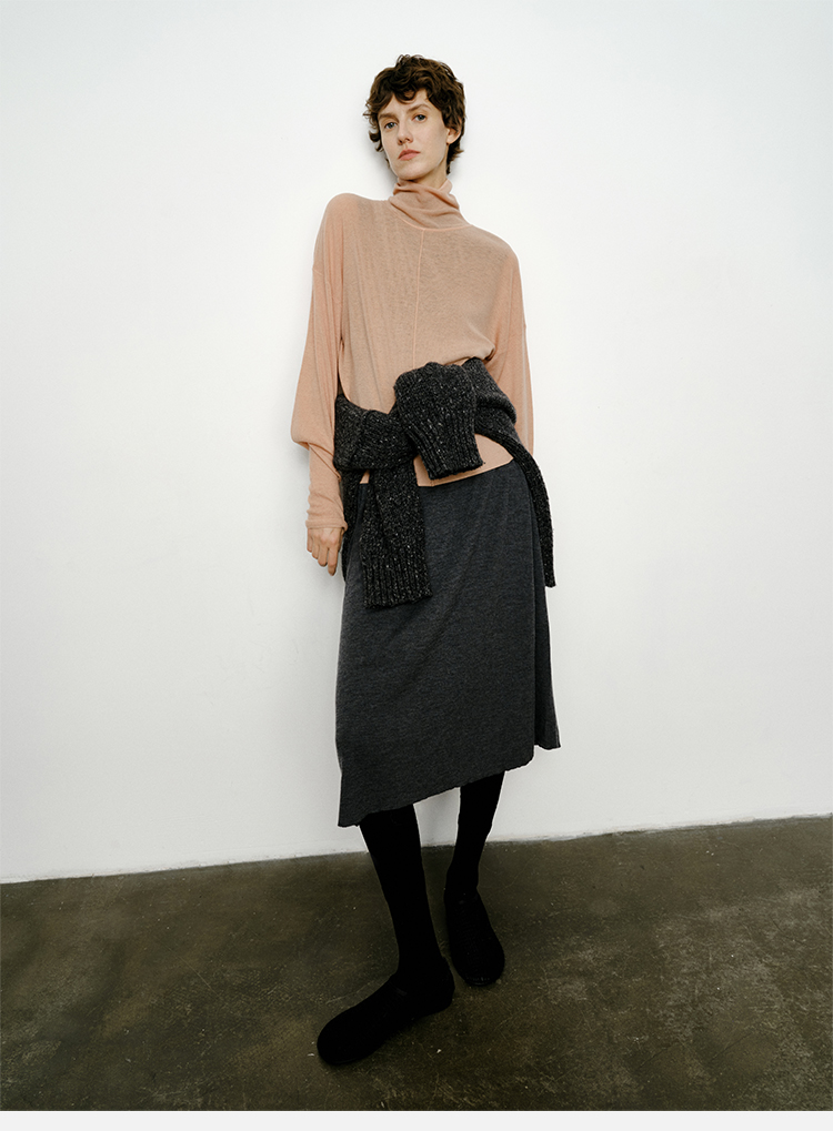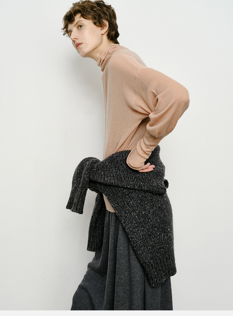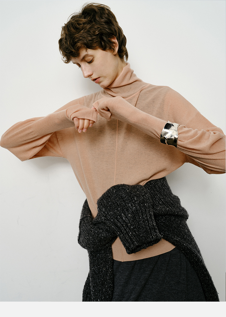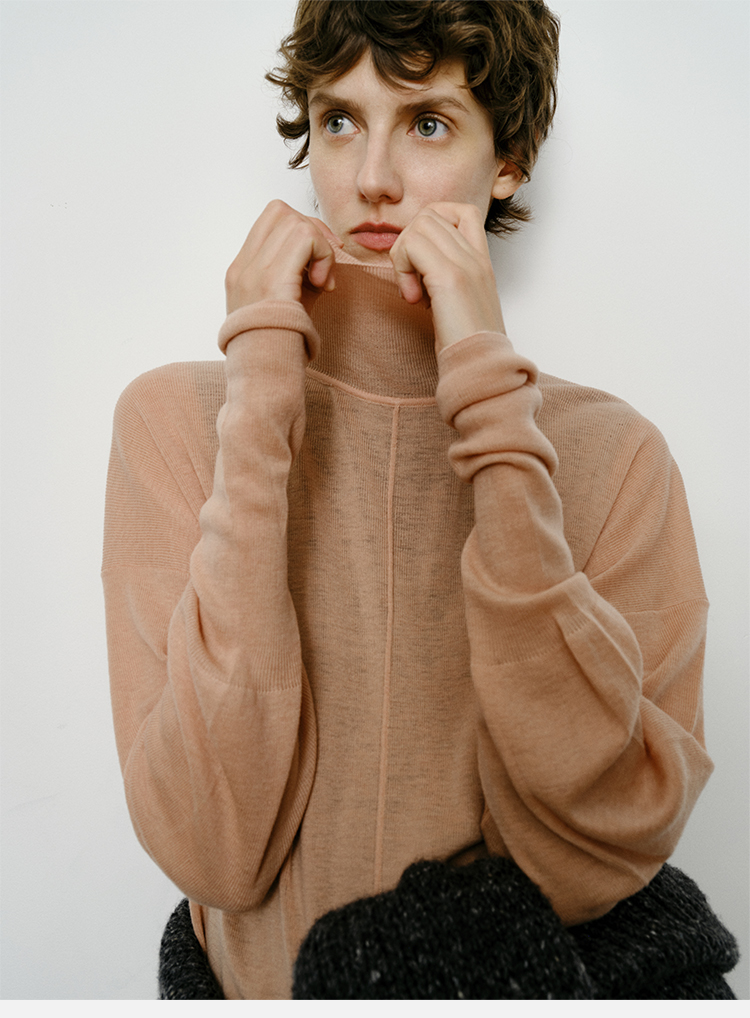 HIDEMI 美利奴羊毛极简设计感高领拼缝式廓形毛衣 裸粉色/黑色