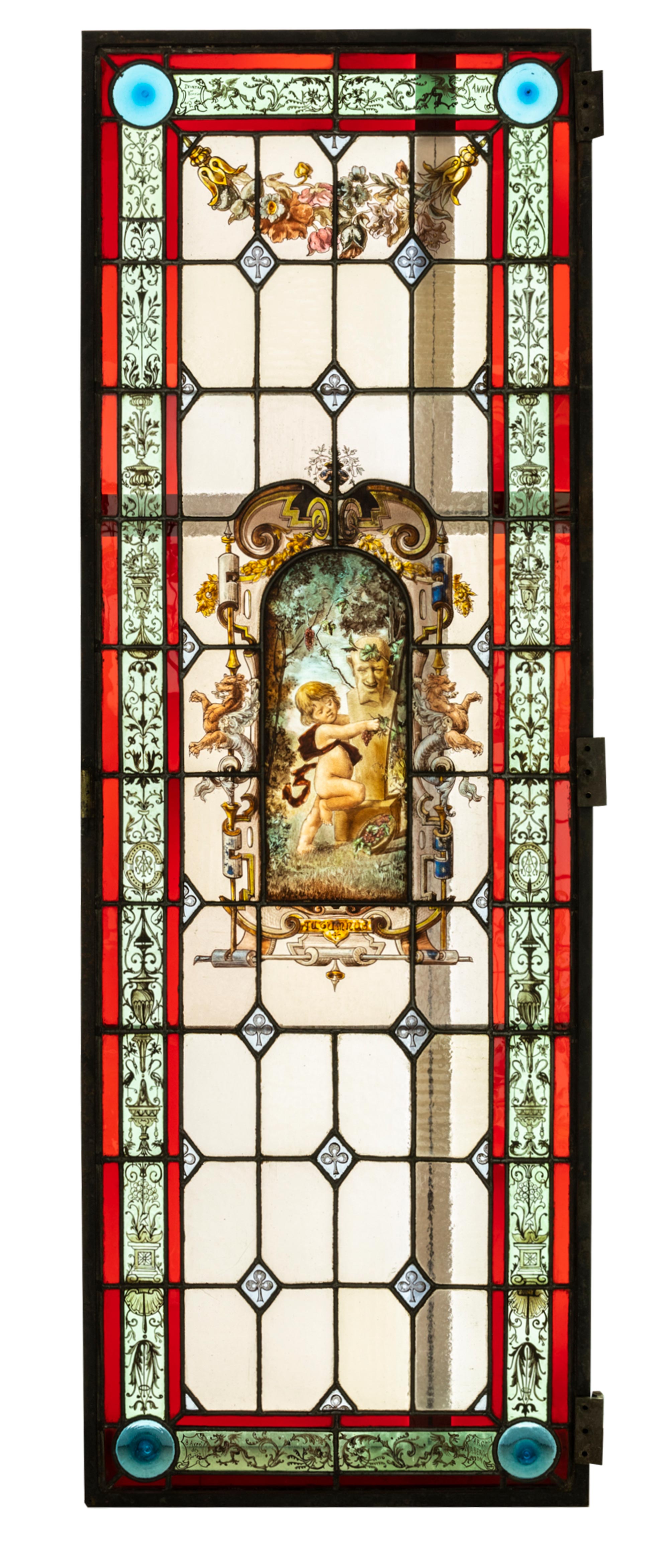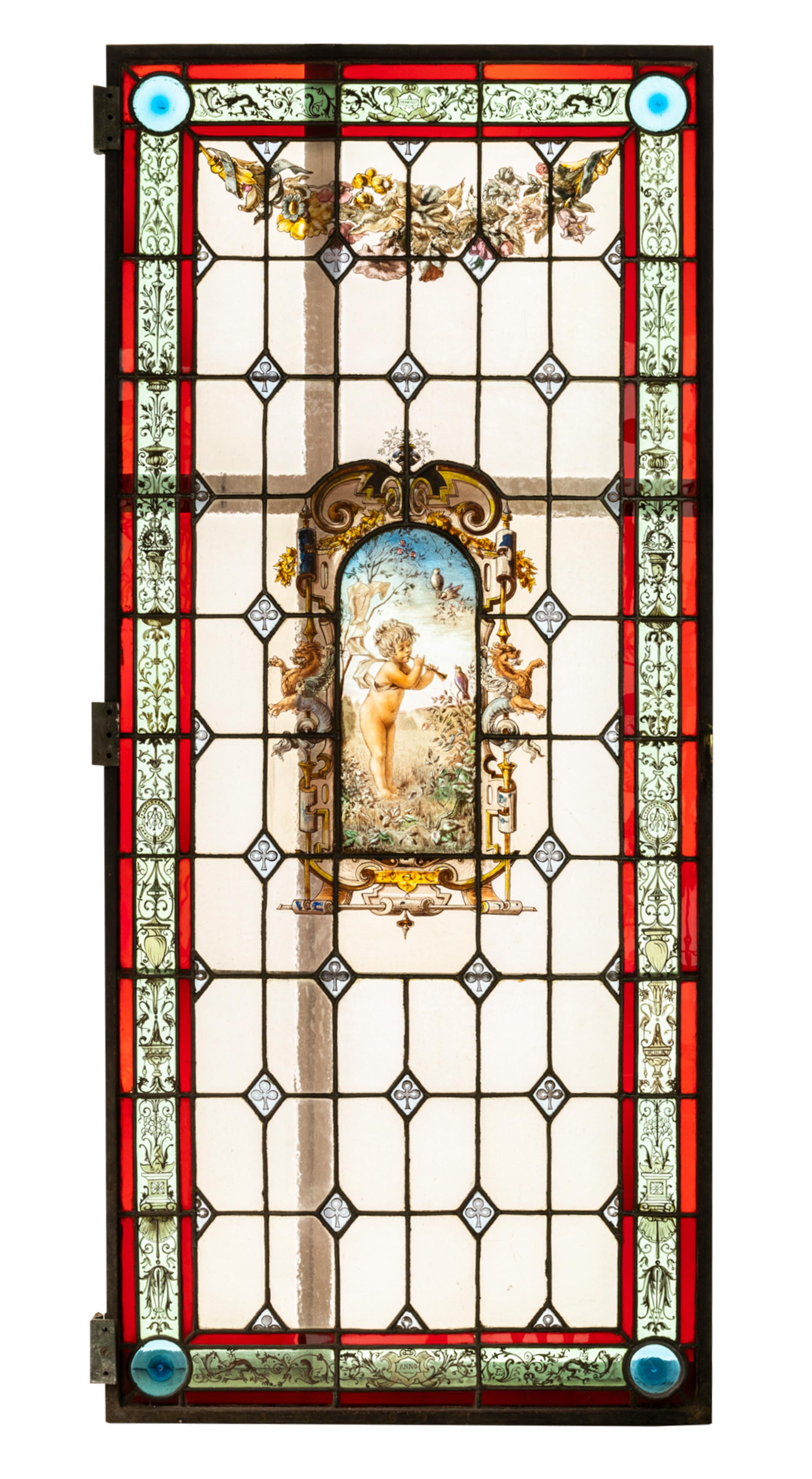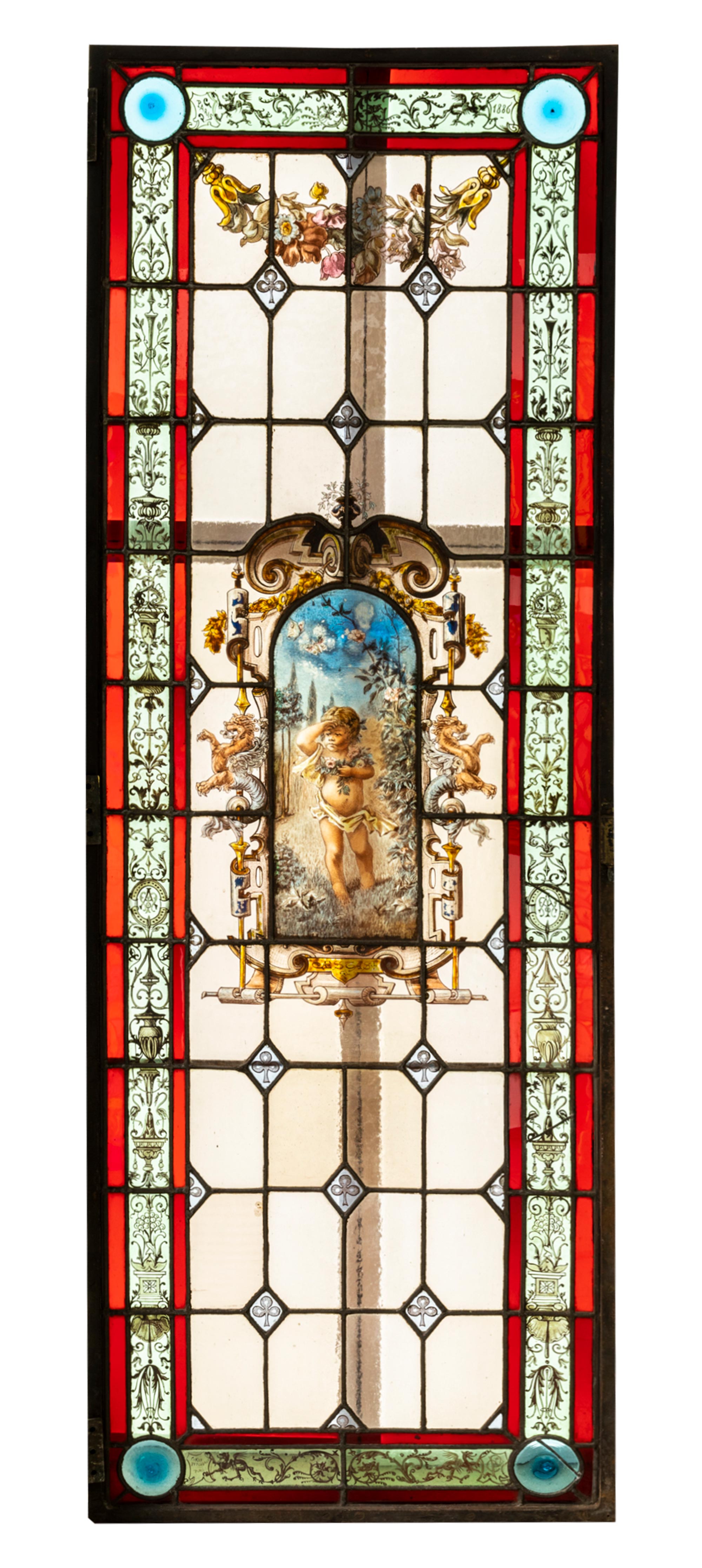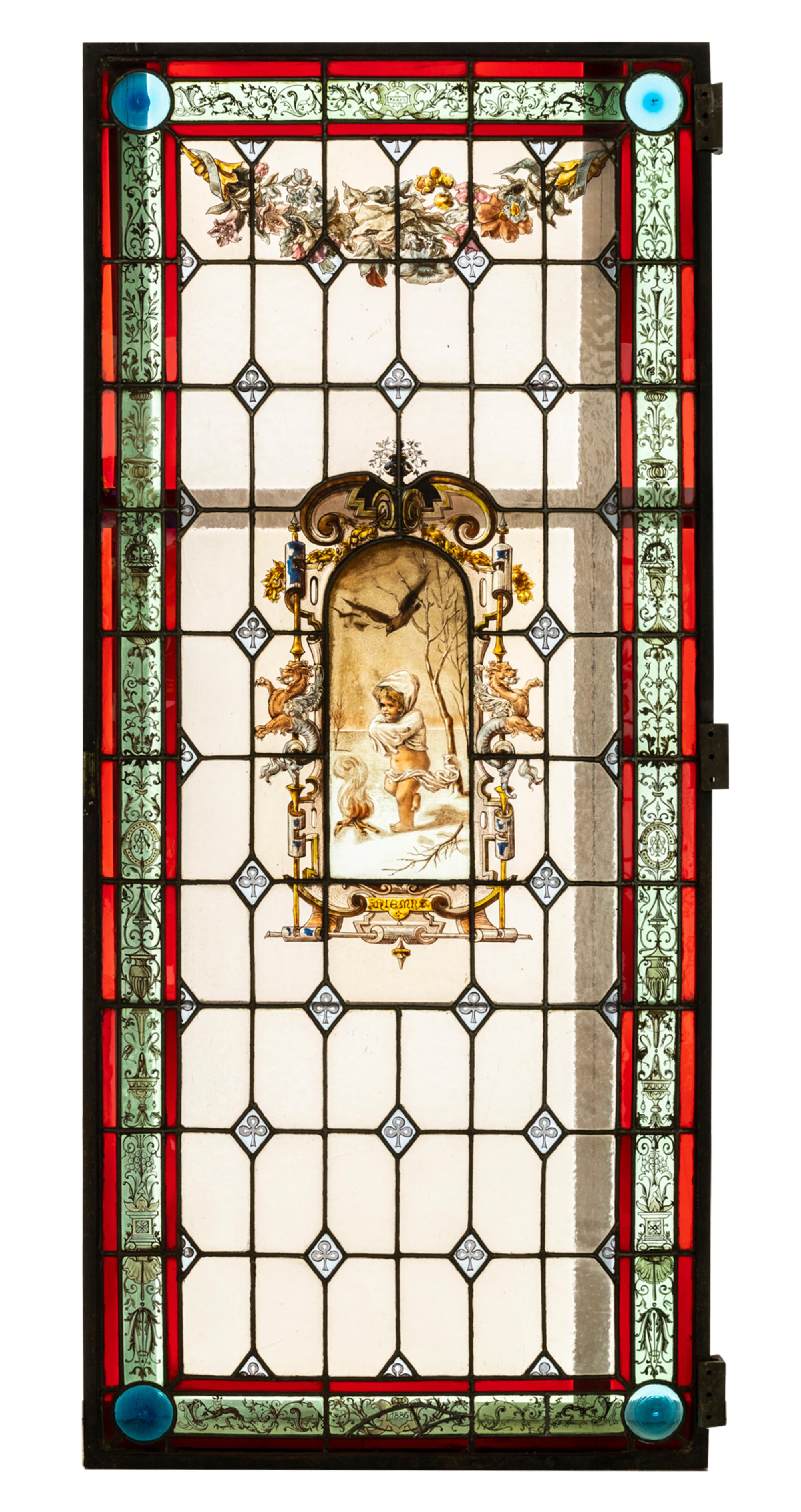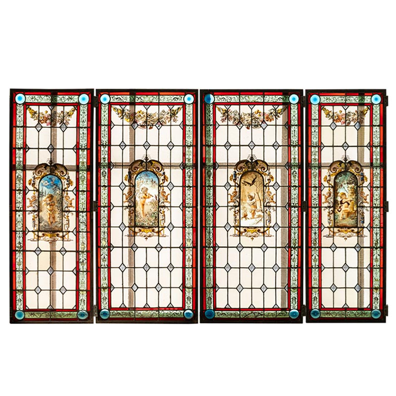 独角鹿西洋古董 1886年法国玻璃艺术大师C. Pizzagalli签名创作出品四季天使主题彩绘玻璃花窗一组