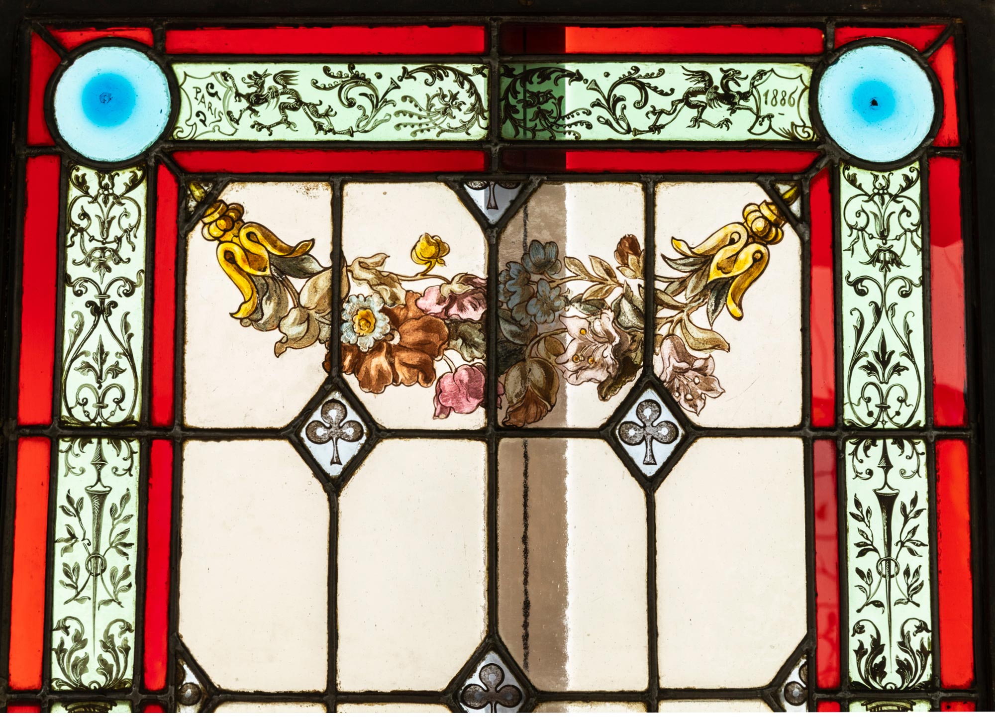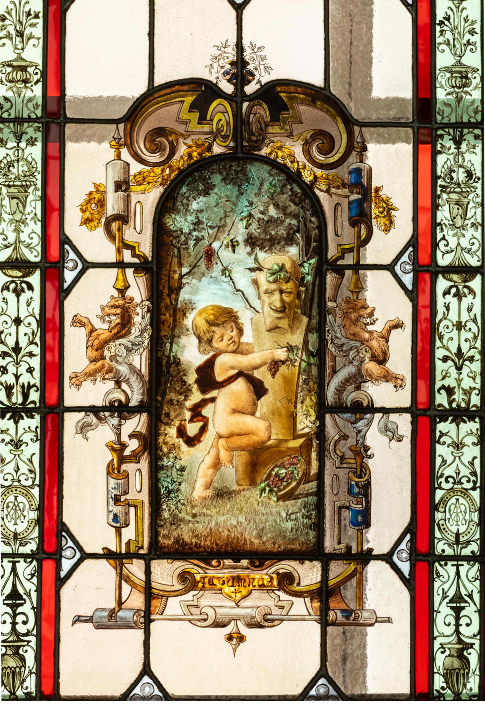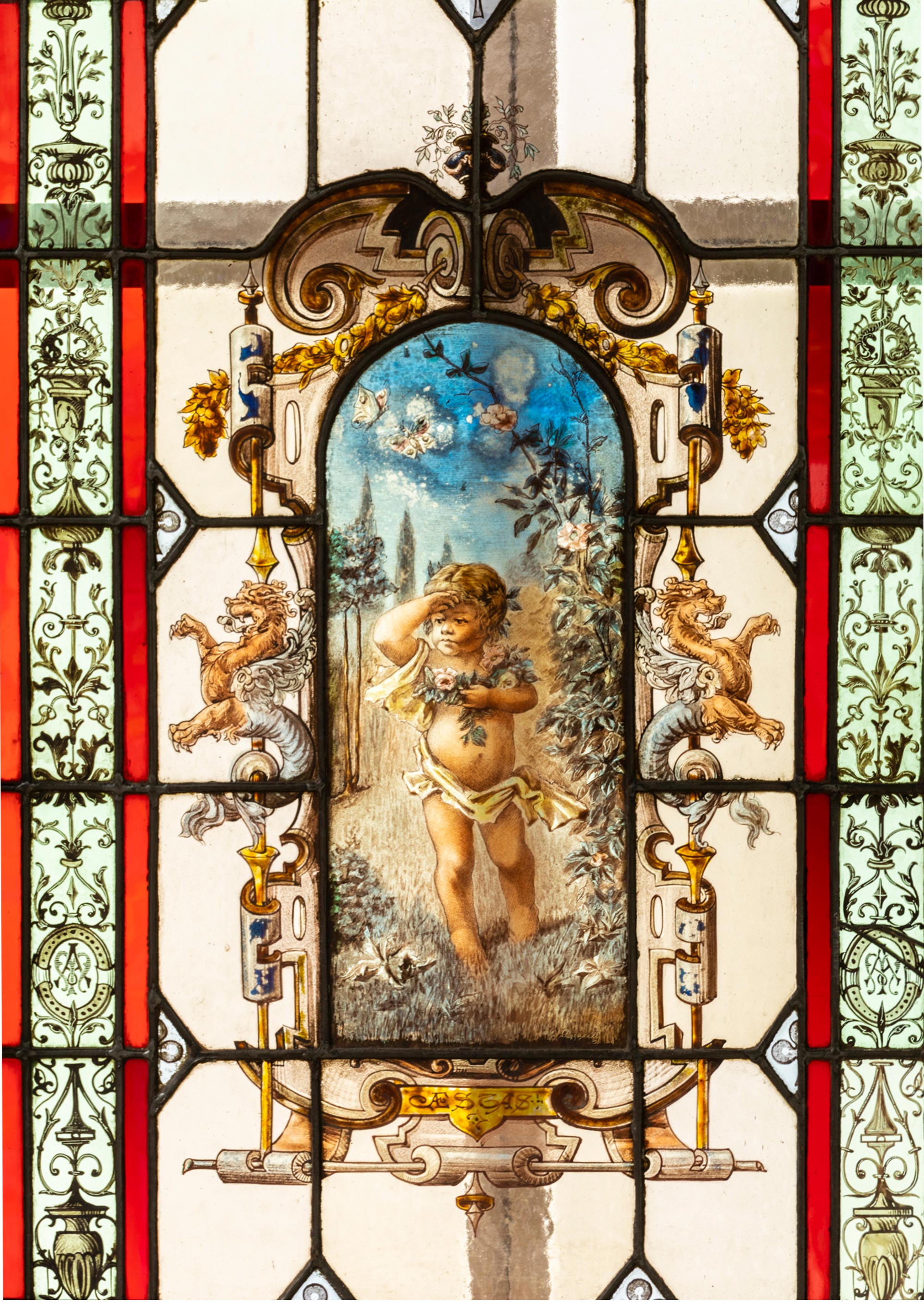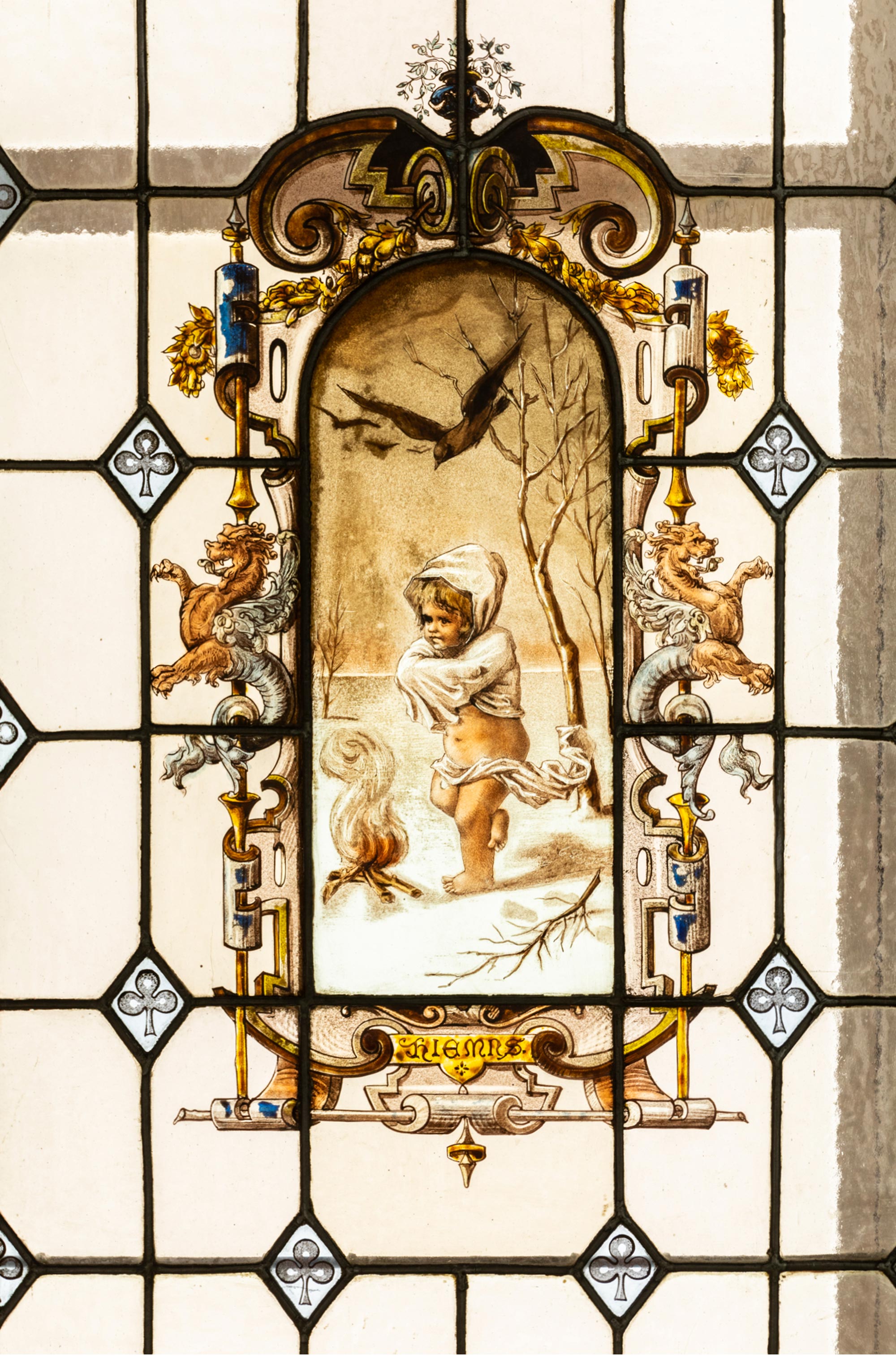 独角鹿西洋古董 1886年法国玻璃艺术大师C. Pizzagalli签名创作出品四季天使主题彩绘玻璃花窗一组