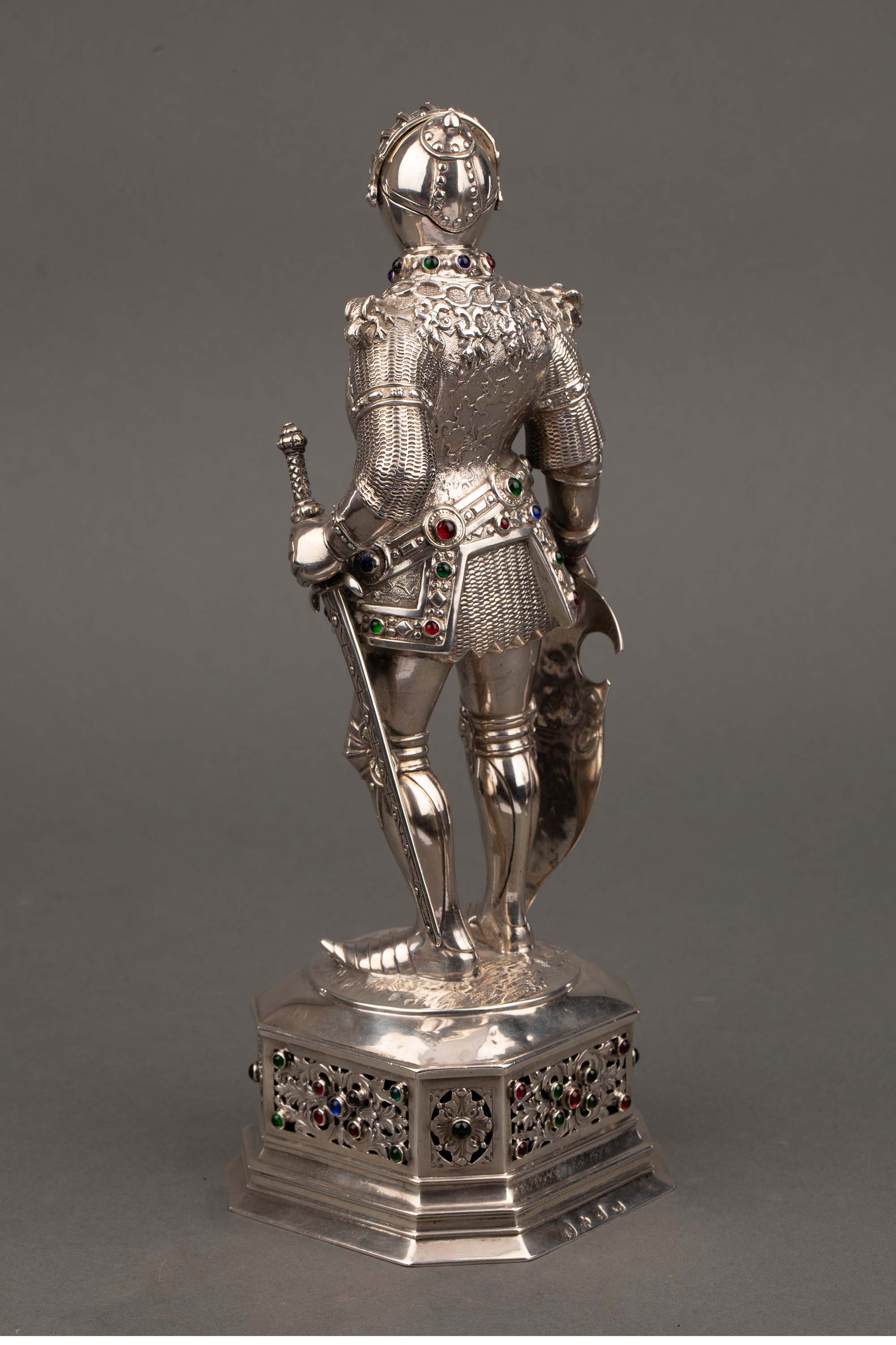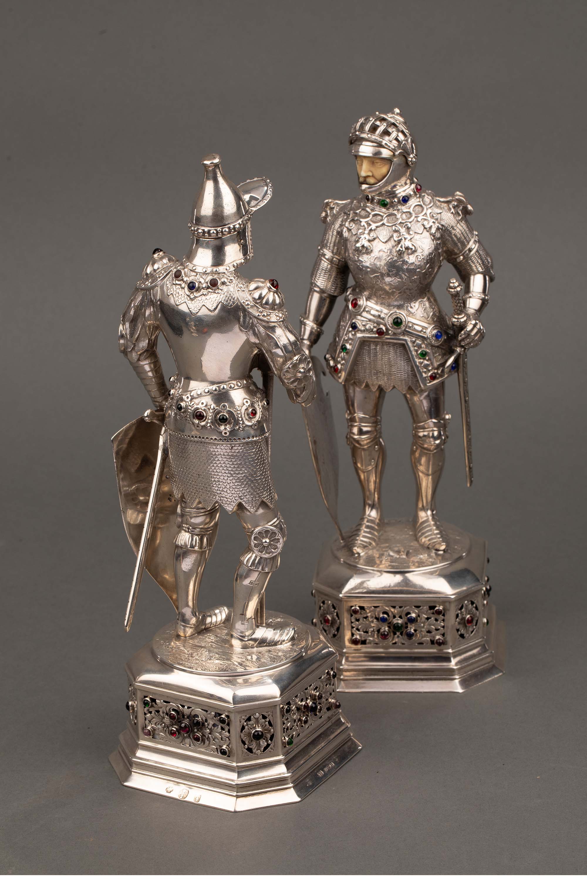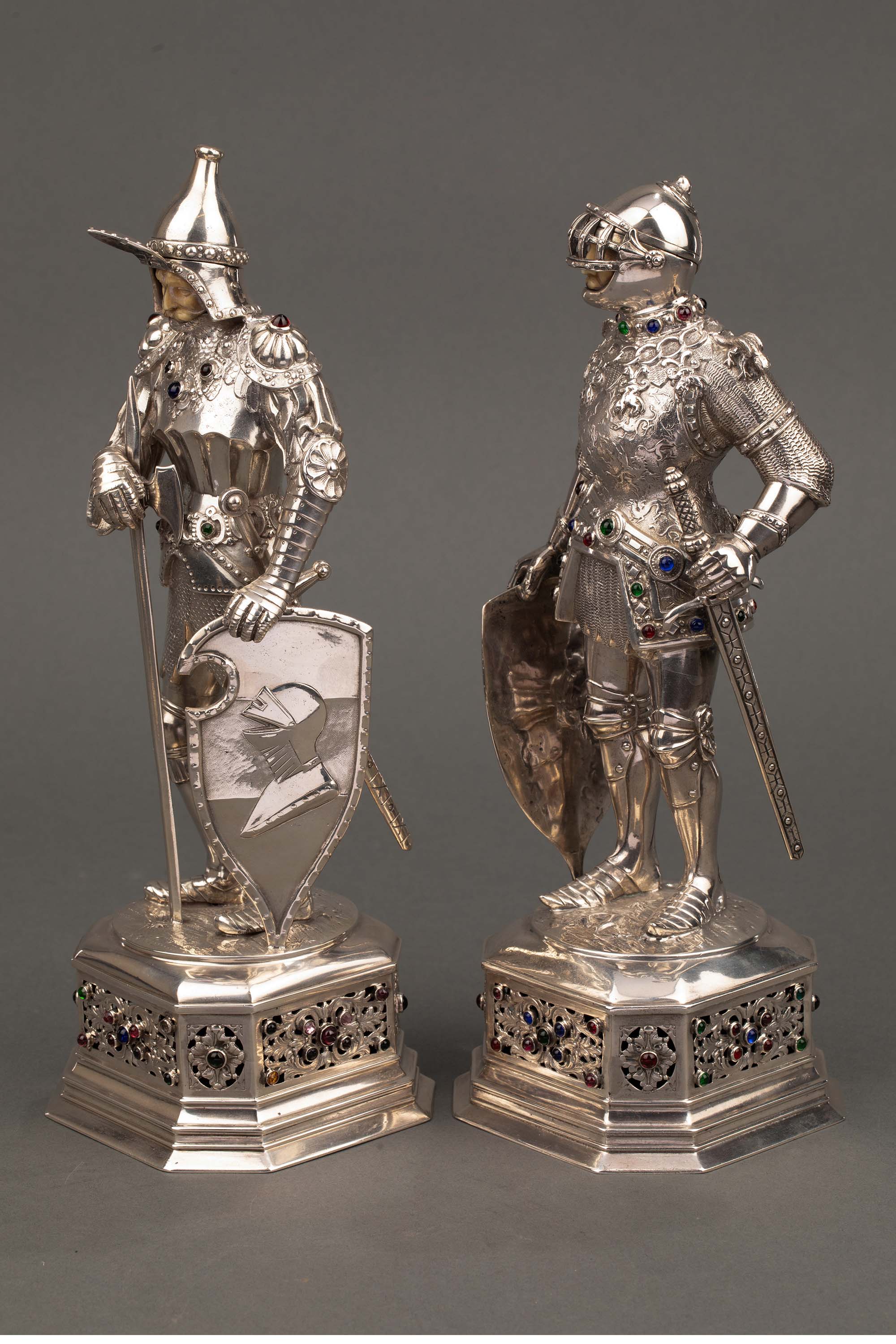 1924年德国制造英国Israel Segalov工坊出品中世纪重装骑士造型纯银精雕嵌半宝石人物摆件一对