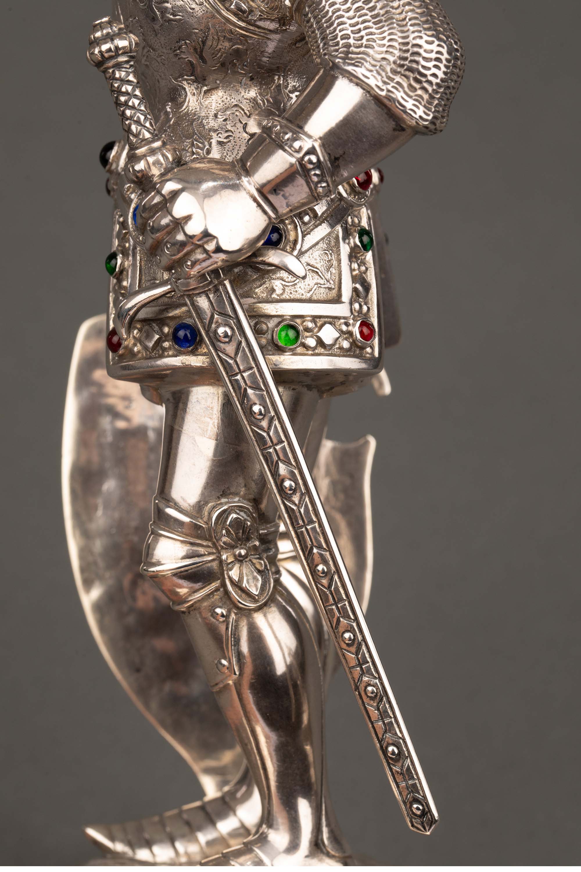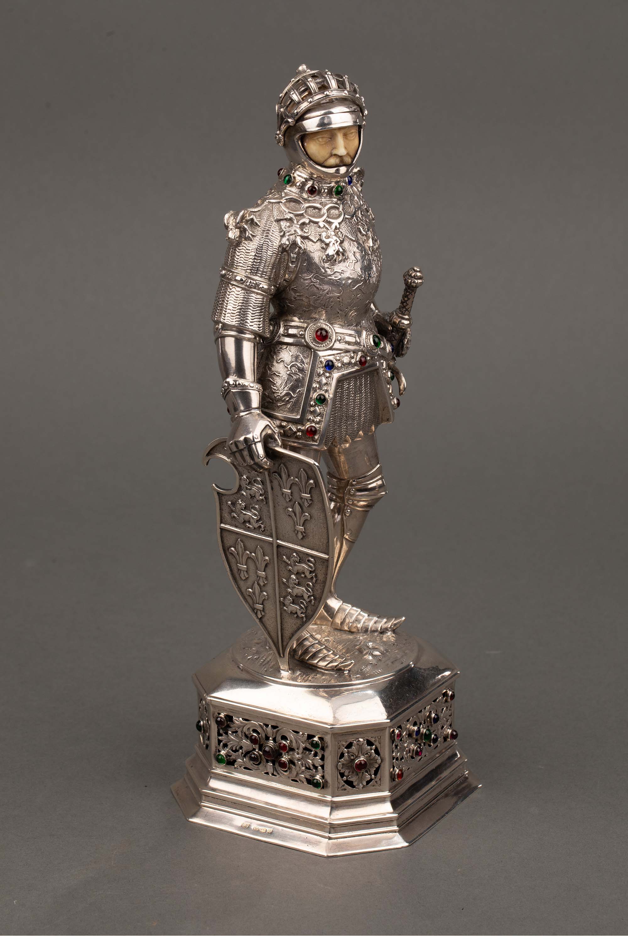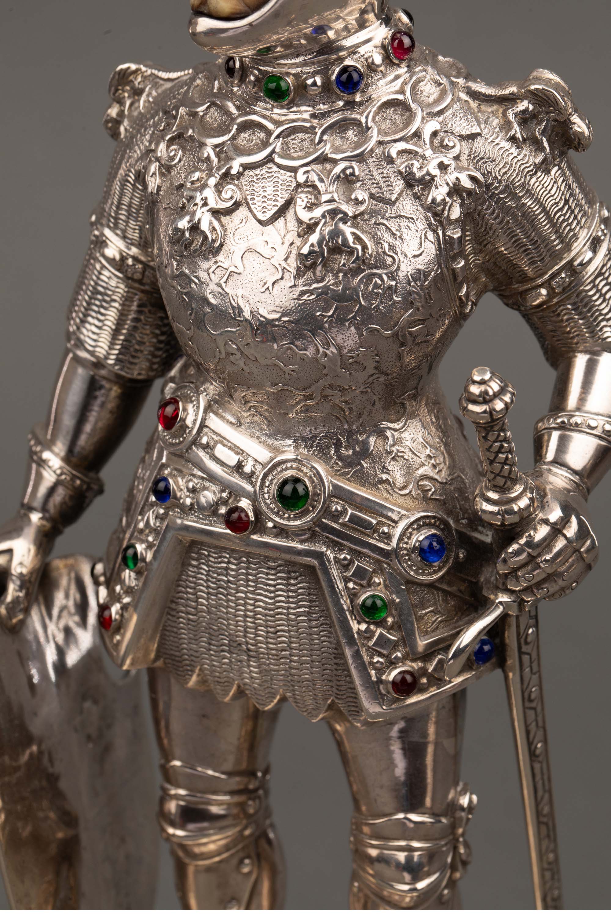 1924年德国制造英国Israel Segalov工坊出品中世纪重装骑士造型纯银精雕嵌半宝石人物摆件一对