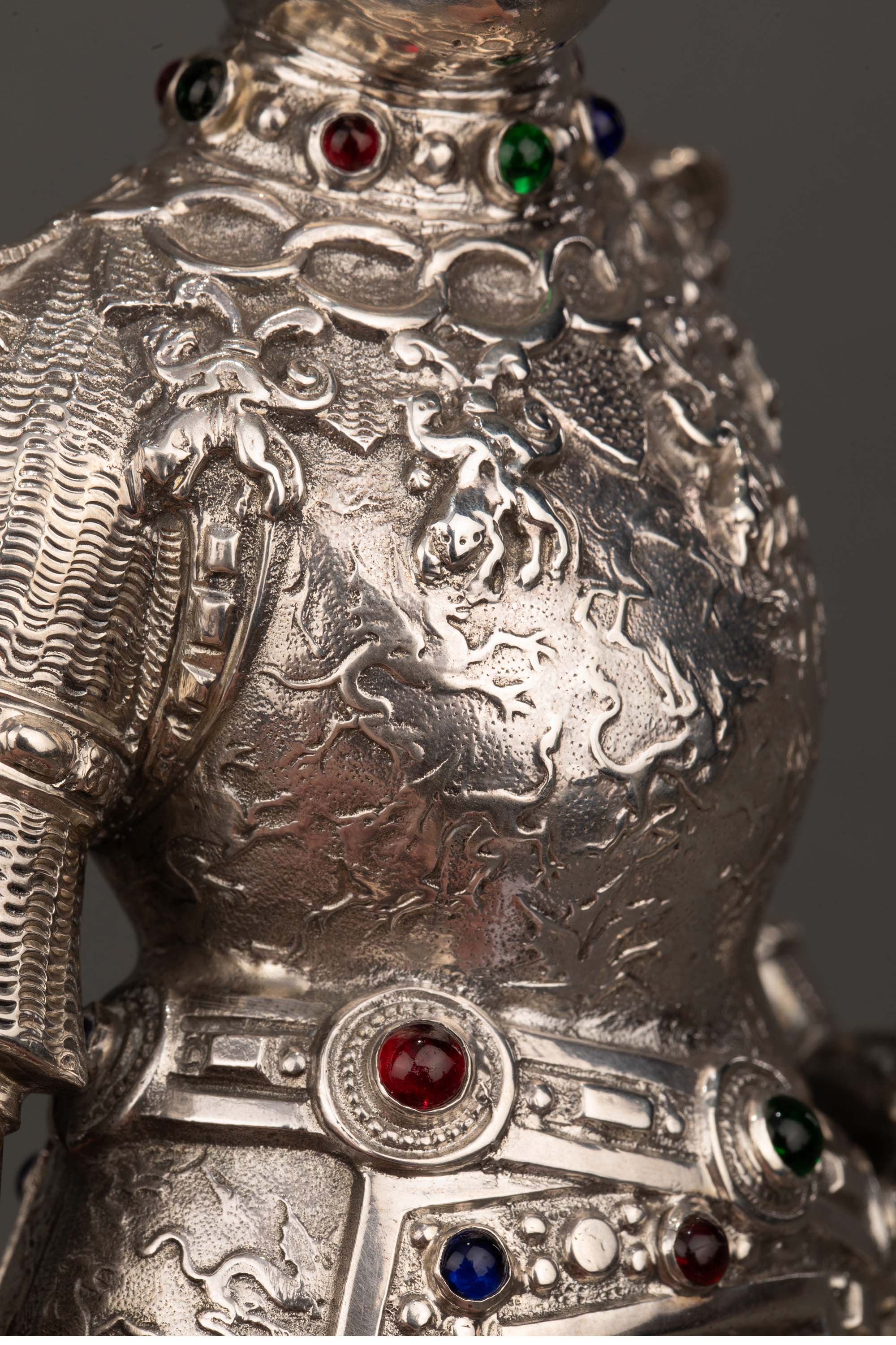 独角鹿西洋古董 1924年德国制造英国Israel Segalov工坊出品中世纪重装骑士造型纯银精雕嵌半宝石人物摆件一对