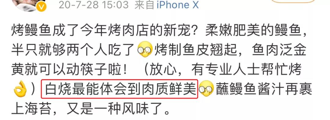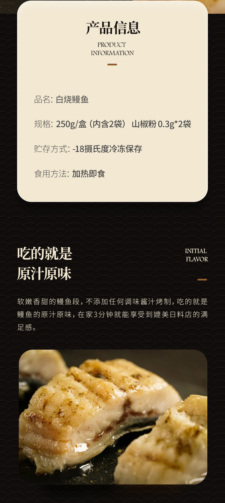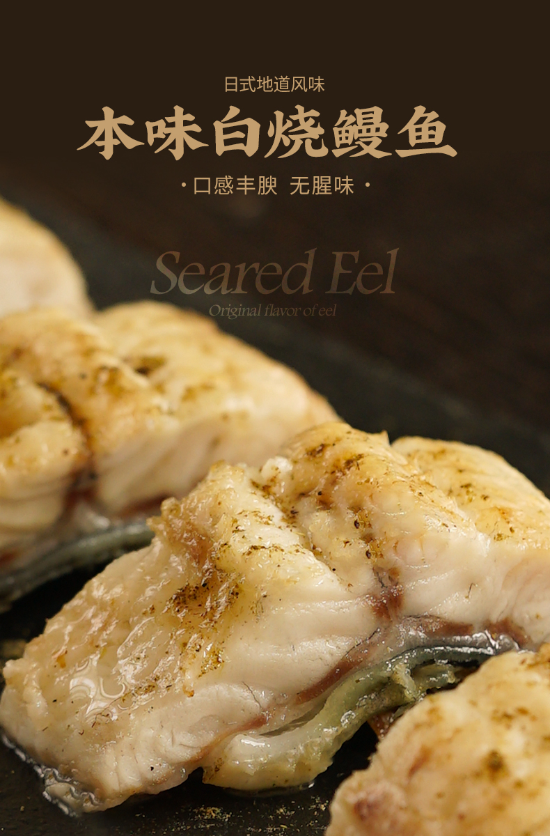 白烧鳗没有酱汁的掩盖,只有鳗鱼的原味;不添加任何调味酱汁烤制,保持了鳗鱼的本味,鲜甜肉嫩,口感丰腴。