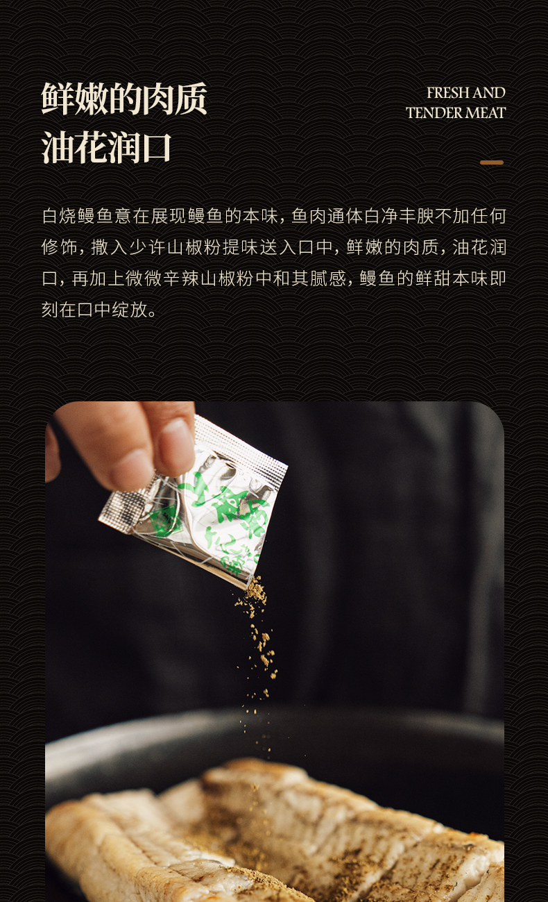 鱼肉通体白净丰腴,不需要添加任何修饰。再撒上少许的山椒粉提味,肉质的层次感则更加丰富了,油花润口,再加上微微辛辣的山椒粉中和了其中的腻感,鳗鱼的鲜甜本味即刻在口中绽放。