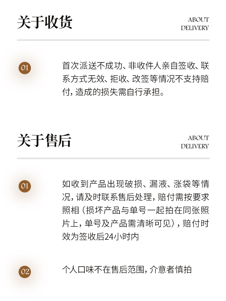 如收到产品出现破损、漏液、涨袋等情况,清及时联系售后处理,赔付需按要求照相(损坏产品与单号一起拍在同一张照片上,单号以及产品清晰可见),赔付时效为签收后24小时内。