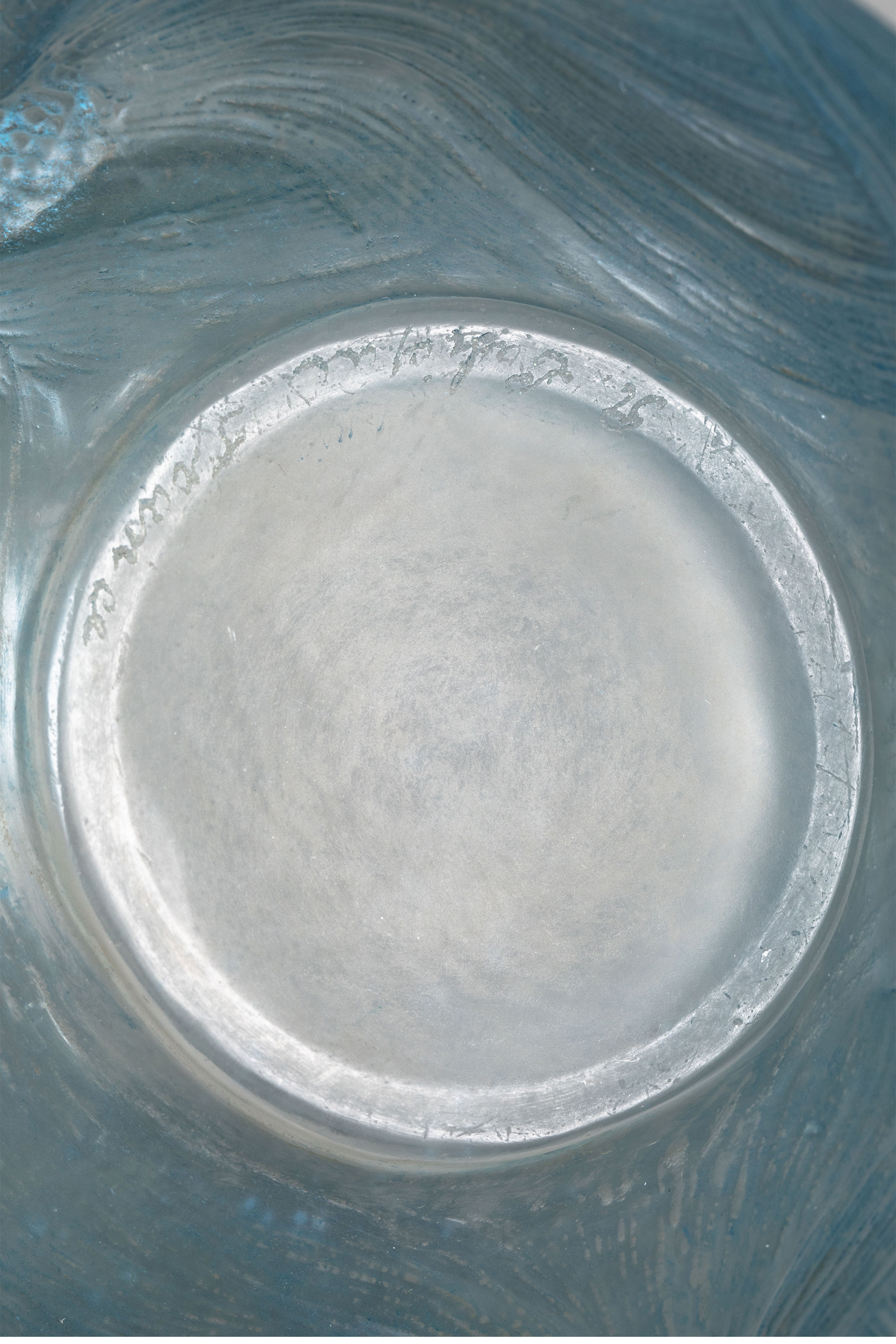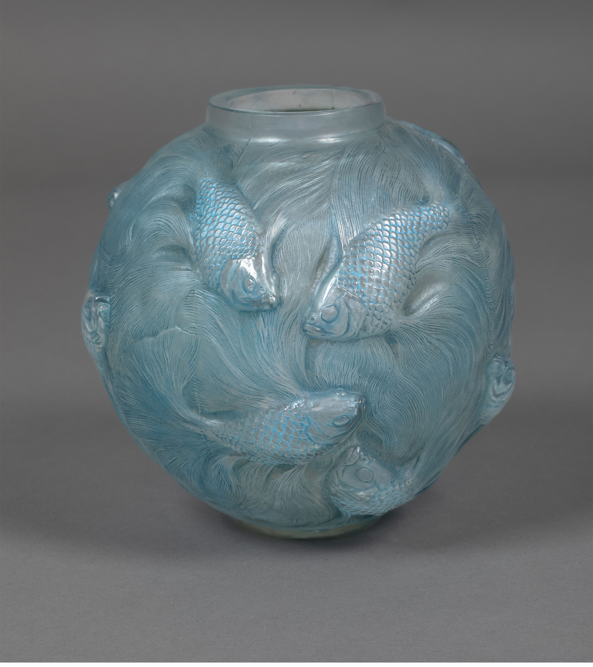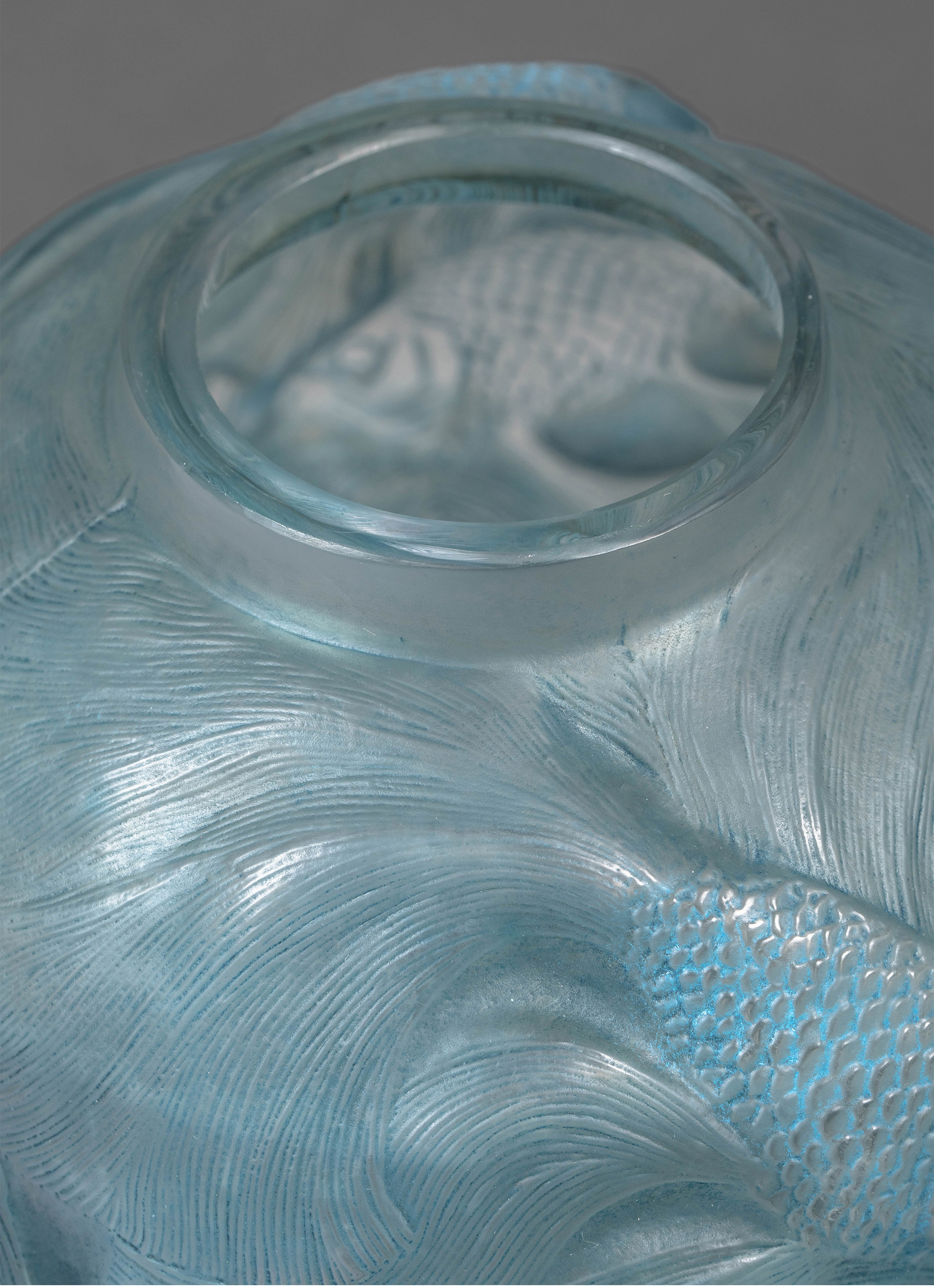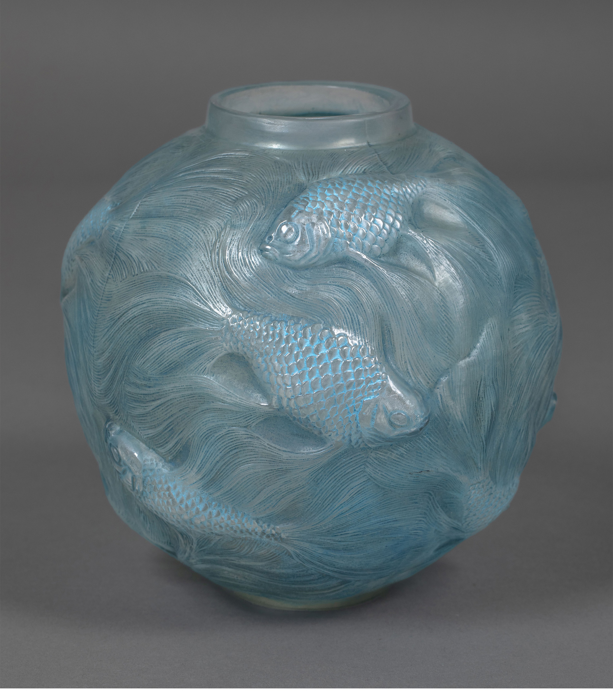 独角鹿西洋古董 1924年法国水晶工坊莱俪LALIQUE设计出品「Formose锦鲤」主题蓝色水晶花瓶
