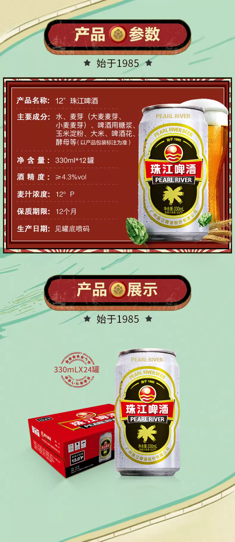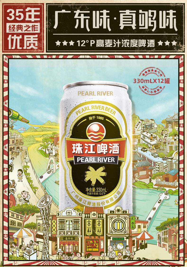 「官方正品」12.0°P经典国产啤酒老珠江330mL*12罐整箱啤酒罐装