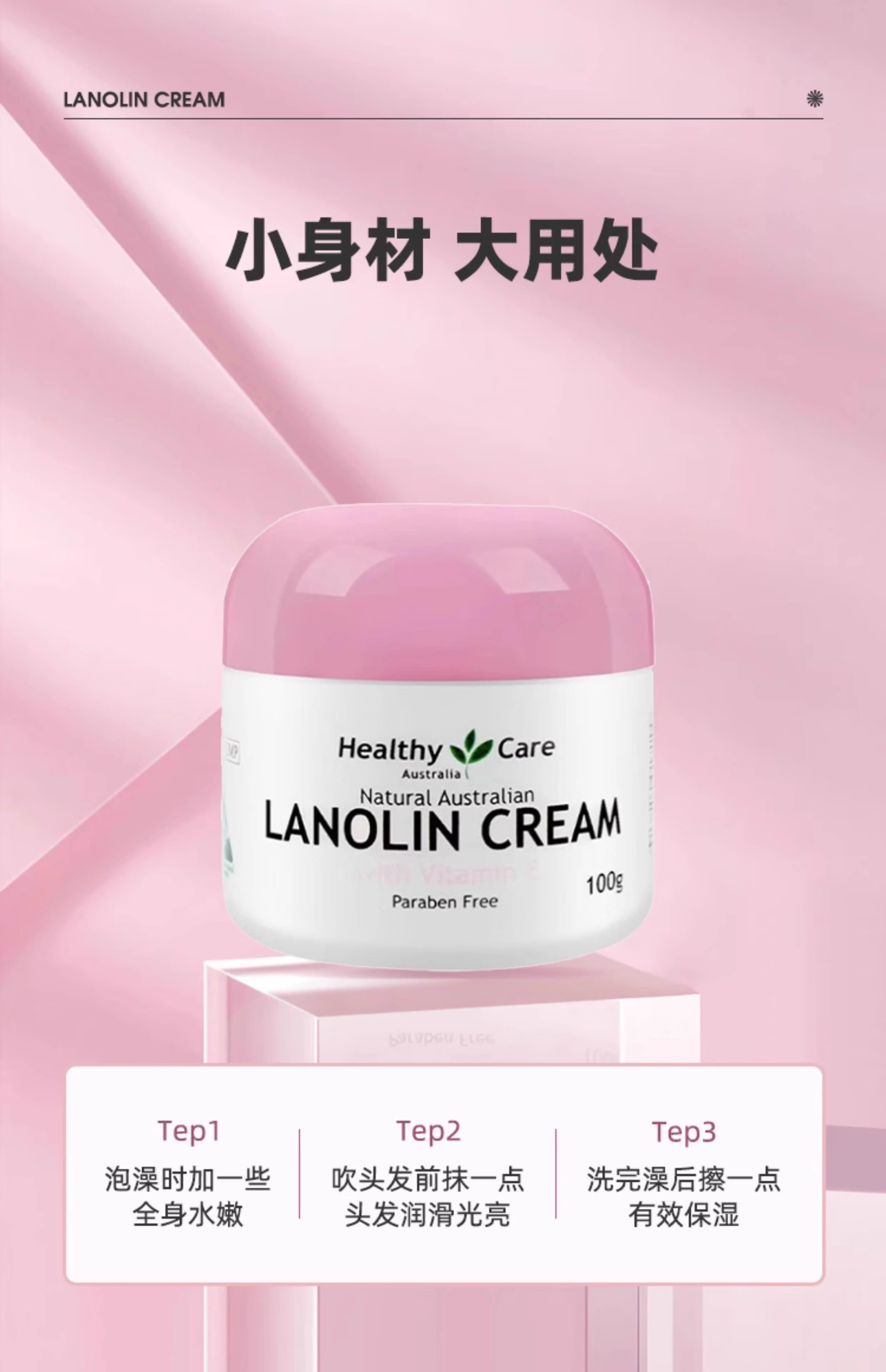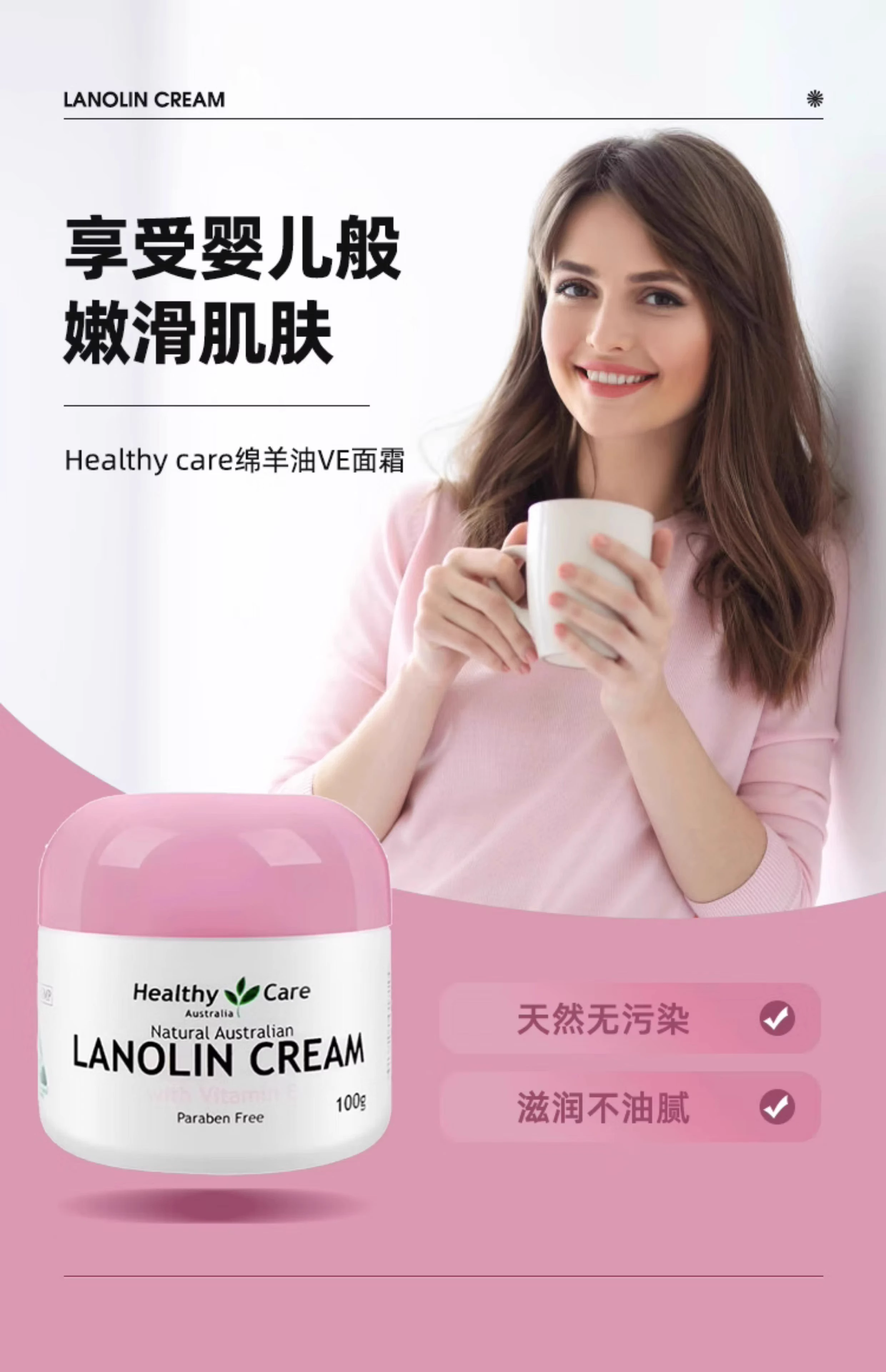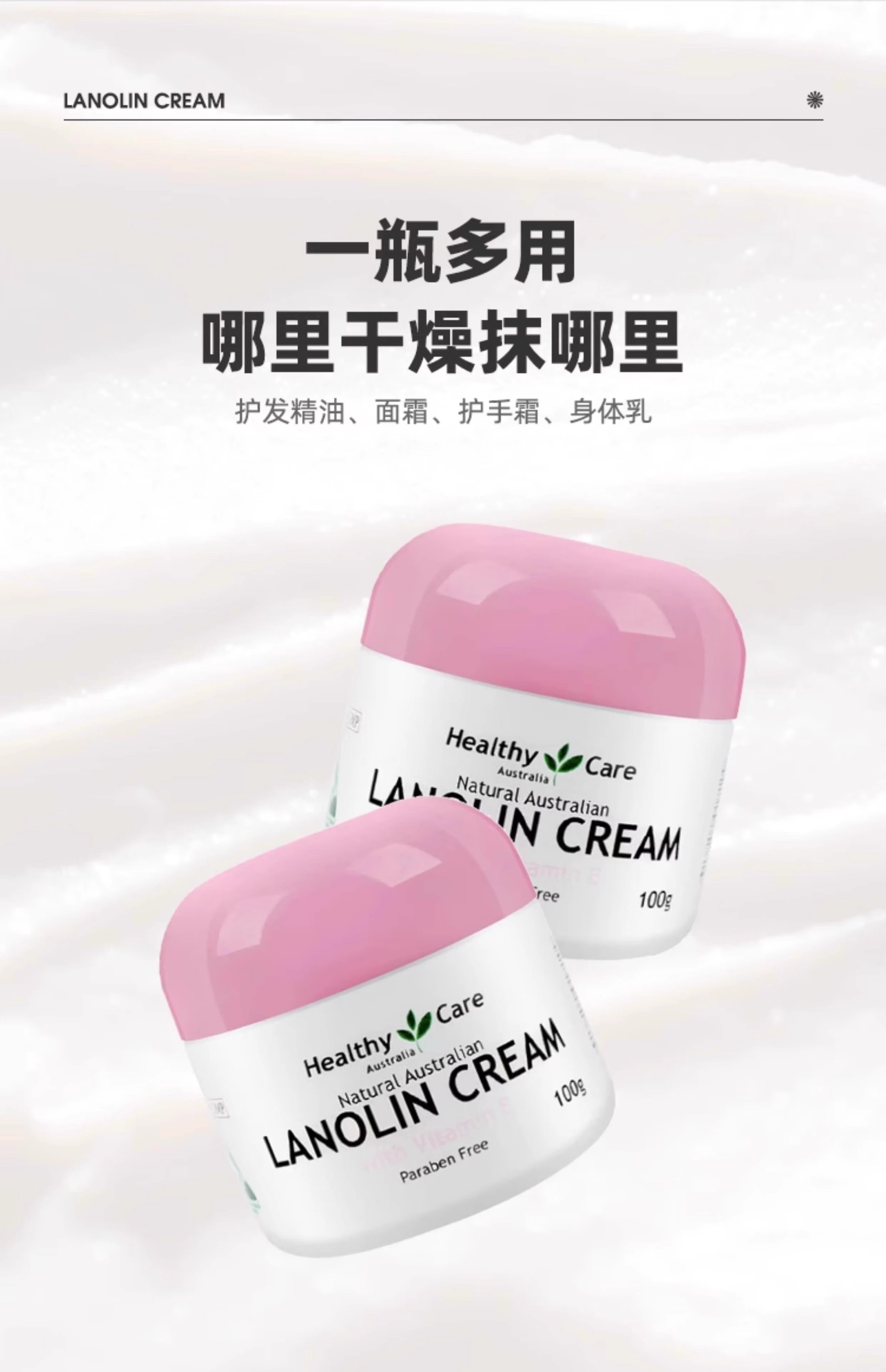 【跨境】HealthyCare粉色VE绵羊油100g